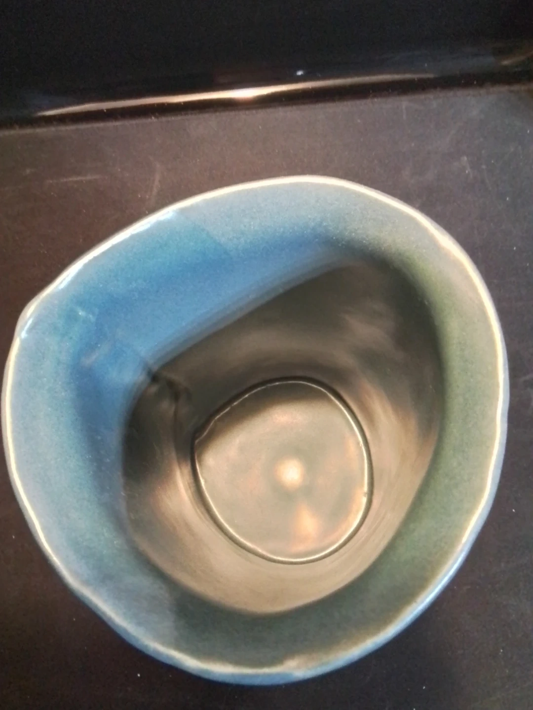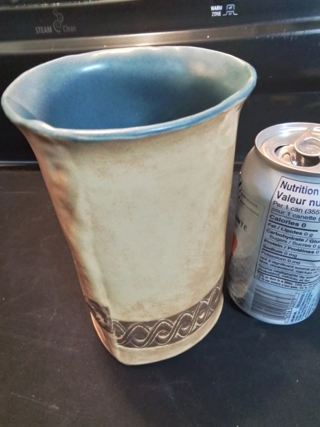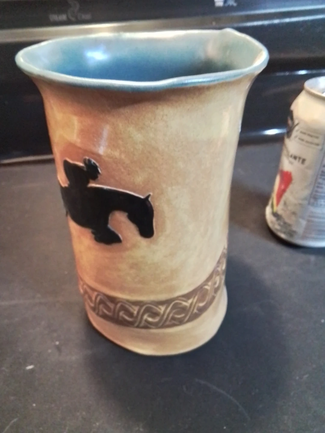 This is a lovely, artisan-crafted Ontario Pottery vase by Nicola H, standing 6.5 inches tall with a 4.5-inch diameter. This unique piece features a beautiful blend of earthy tones, accented with a striking silhouette of a horse and rider, and an interior glazed in a serene blue. It's a wonderful addition to any collection or as a standalone decorative piece. This item is used and in great condition.