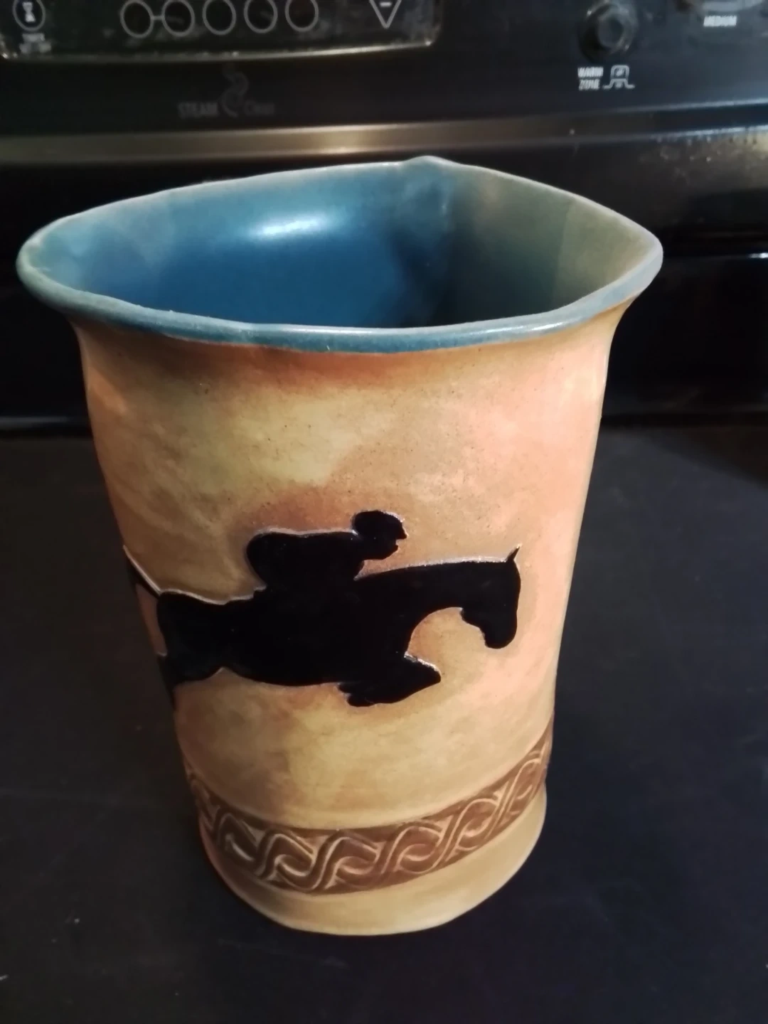 This unique ceramic vase features a hand-painted equestrian scene with a rider and horse. It has a beautiful blue interior glaze and a textured brown band around the base. The vase is handmade, with the artist's mark "NICOLA 14" on the bottom.
