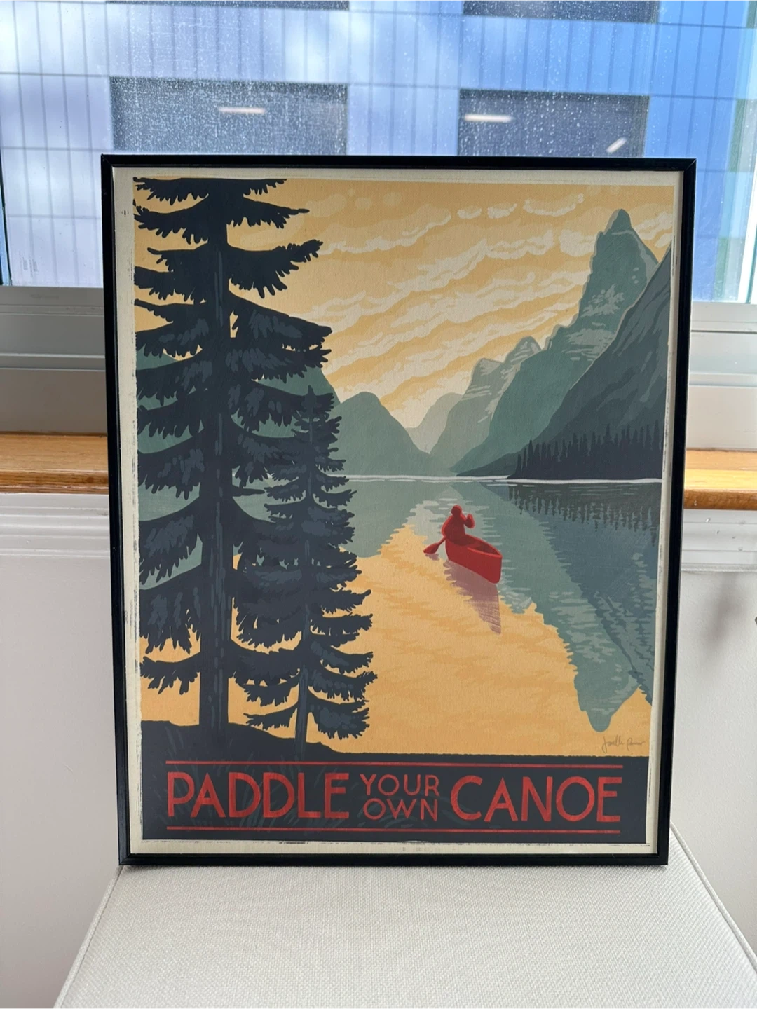 This framed canvas features a scenic lake and mountain landscape with a canoeist. It’s brand new, selling because I don’t need it anymore.
