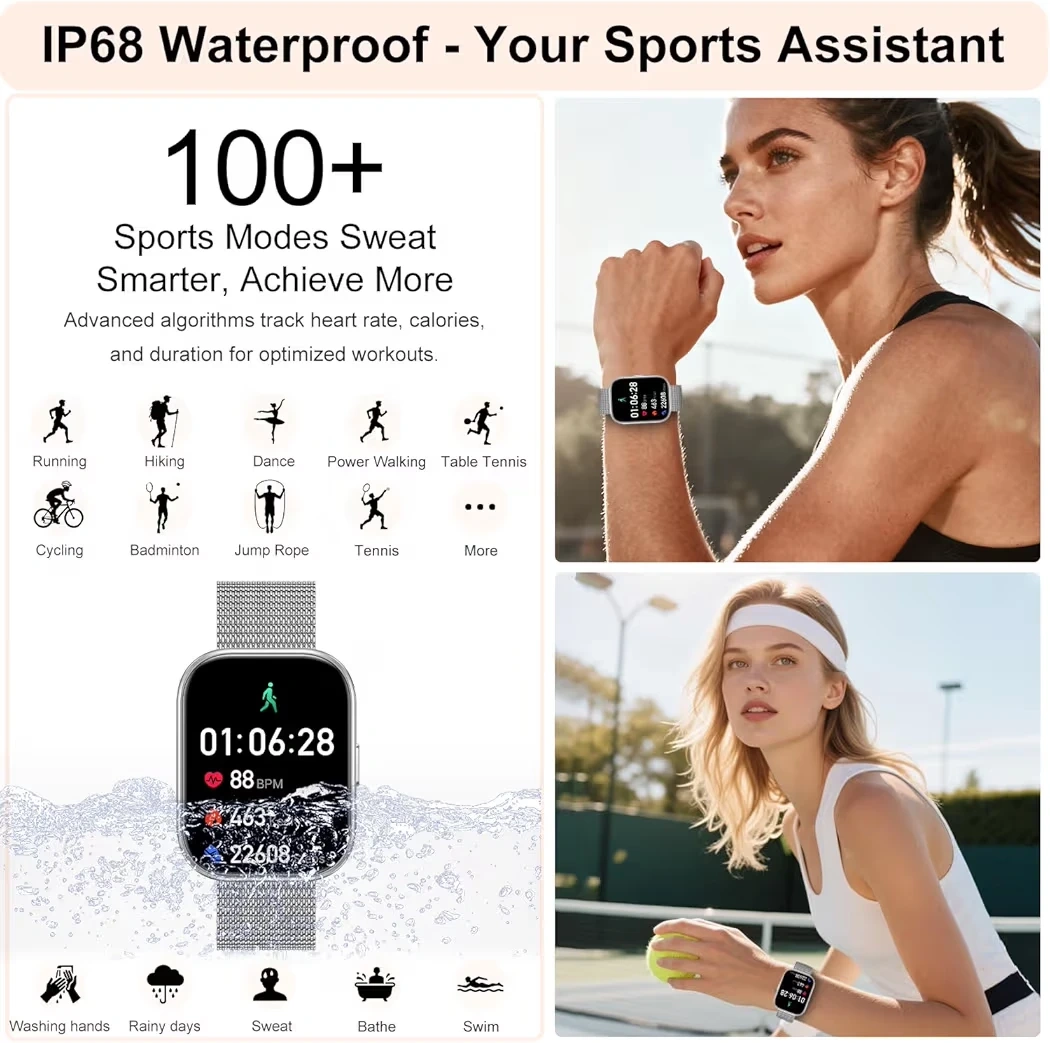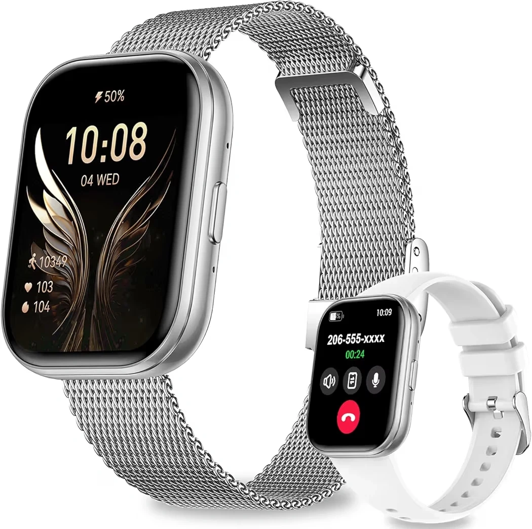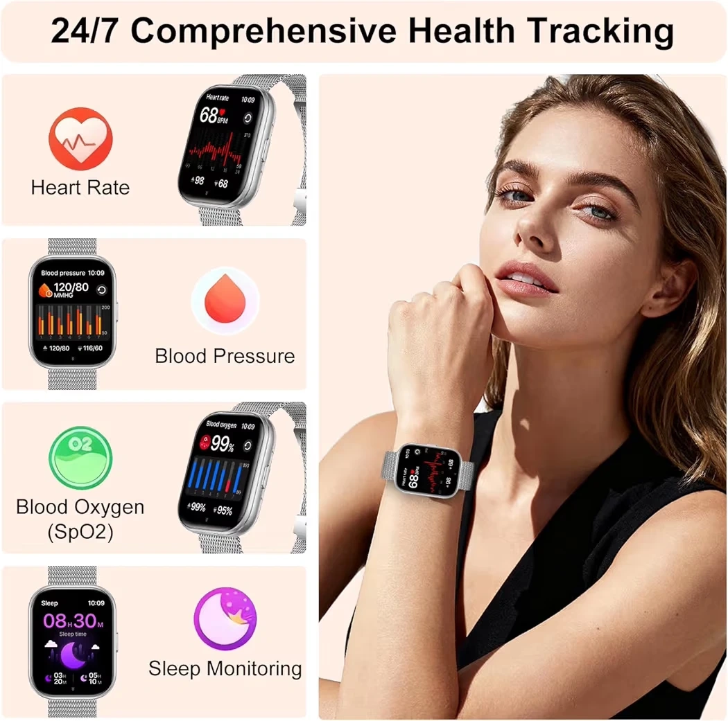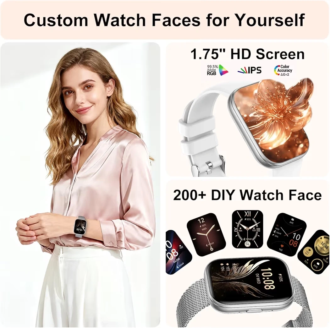 This smartwatch offers comprehensive health tracking including heart rate, blood pressure, and SpO2 monitoring, along with sleep tracking. It features Bluetooth 5.3 for stable connections and an intelligent AI voice assistant. The watch has a 1.75" HD IPS screen and supports over 200 DIY watch faces.