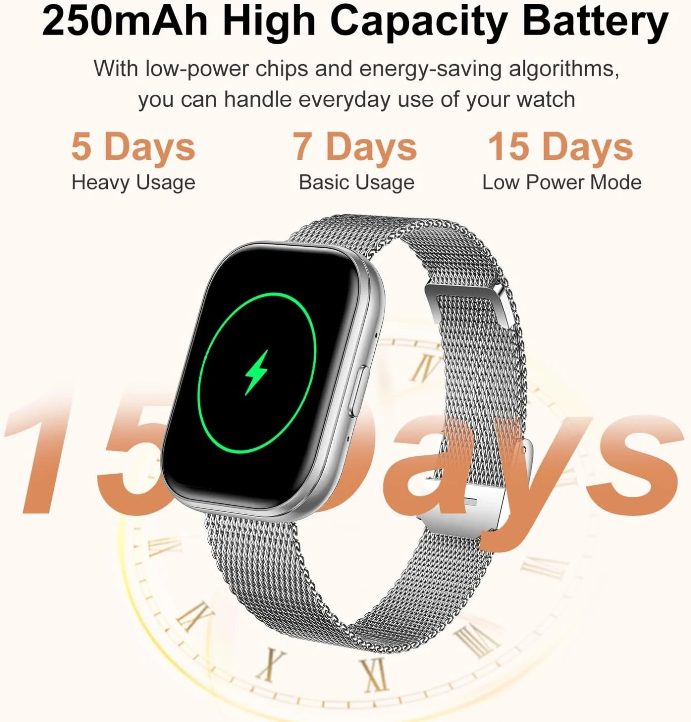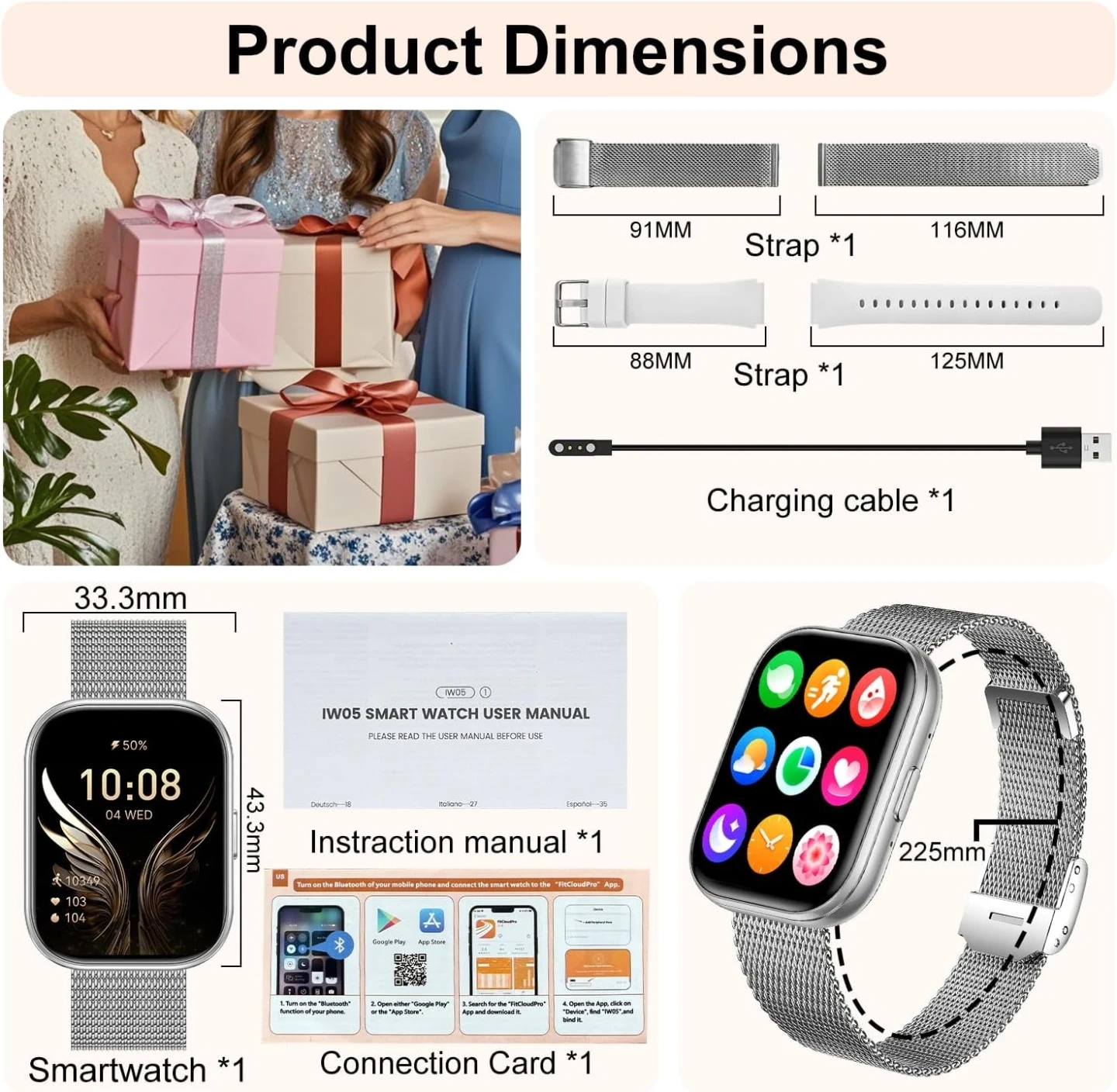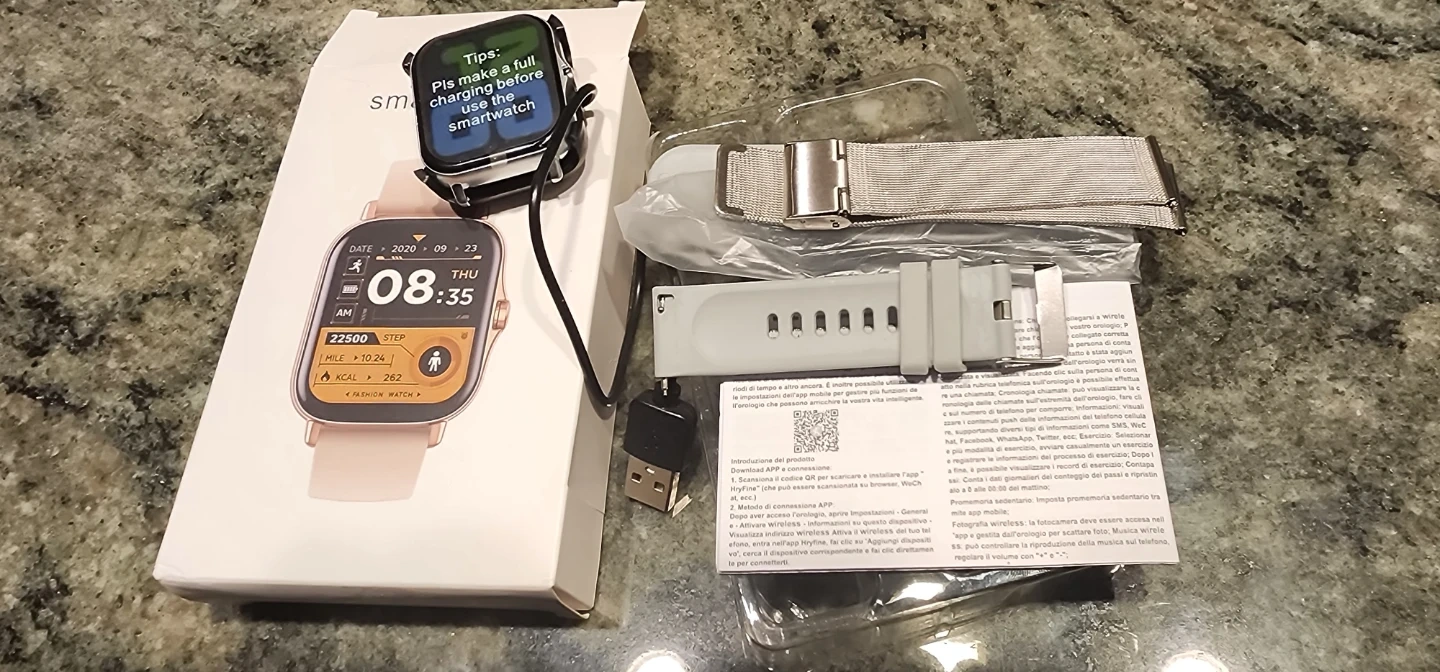 This smartwatch offers comprehensive health tracking including heart rate, blood pressure, and SpO2 monitoring, along with sleep tracking. It features Bluetooth 5.3 for stable connections and an intelligent AI voice assistant. The watch has a 1.75" HD IPS screen and supports over 200 DIY watch faces.