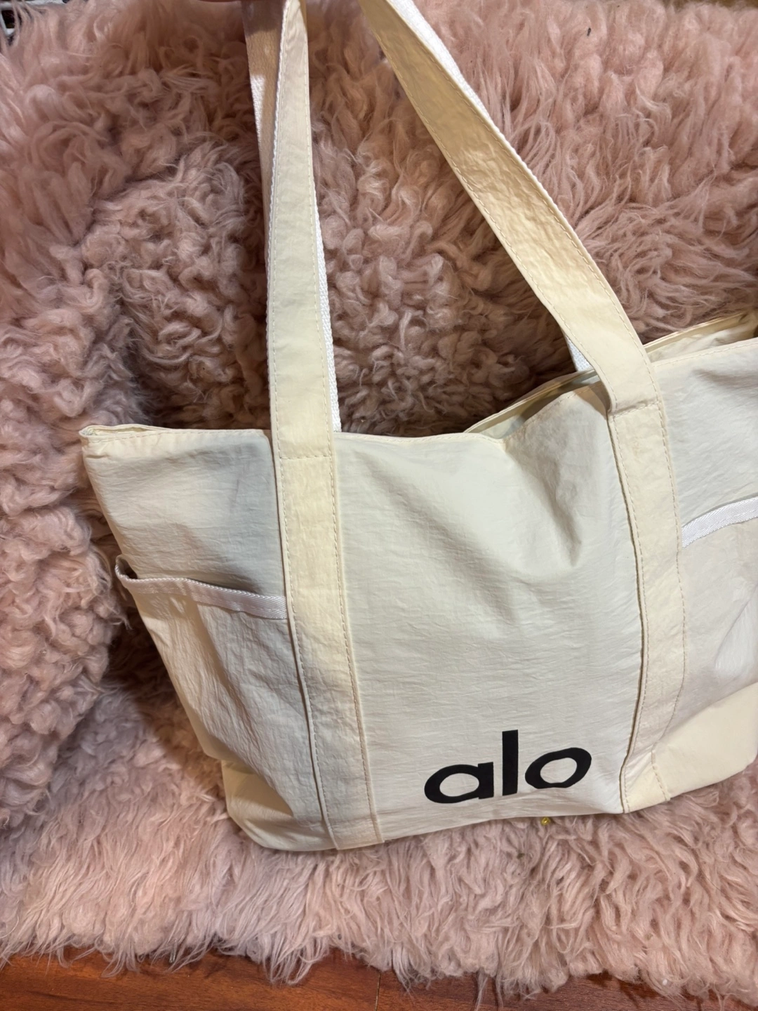 Selling an Alo Yoga tote bag in ivory color. It's in great condition and ready for your yoga essentials or everyday use! Perfect for carrying all your things.