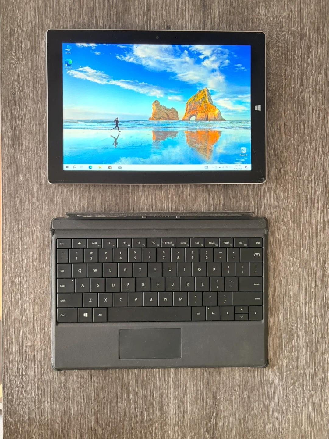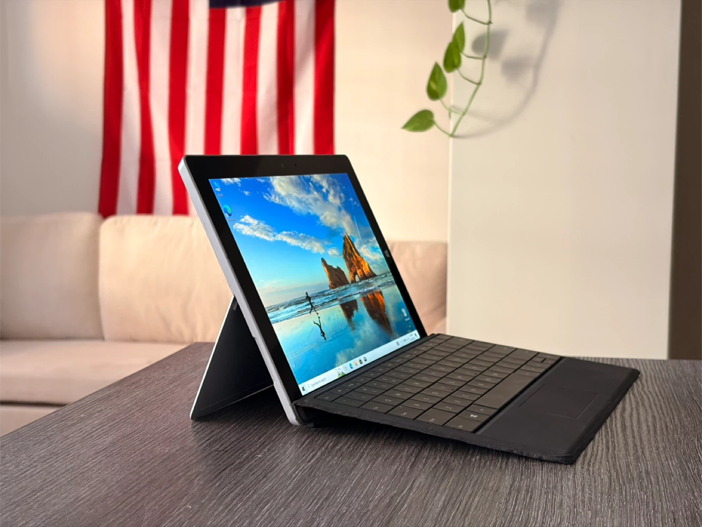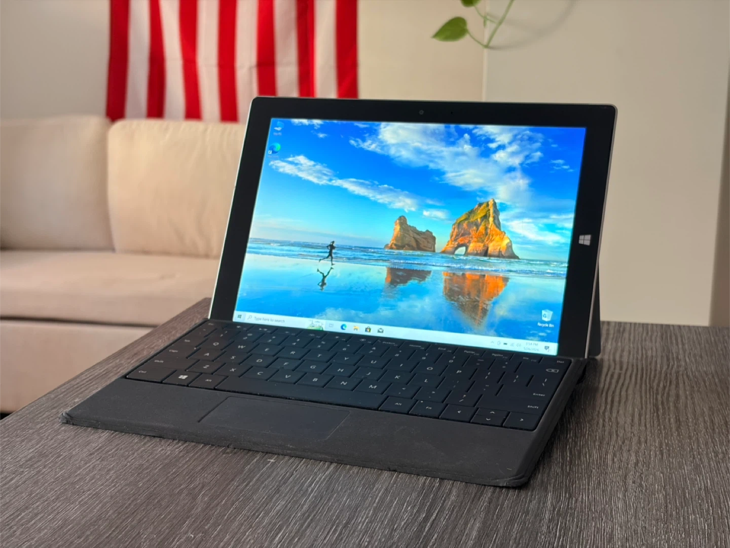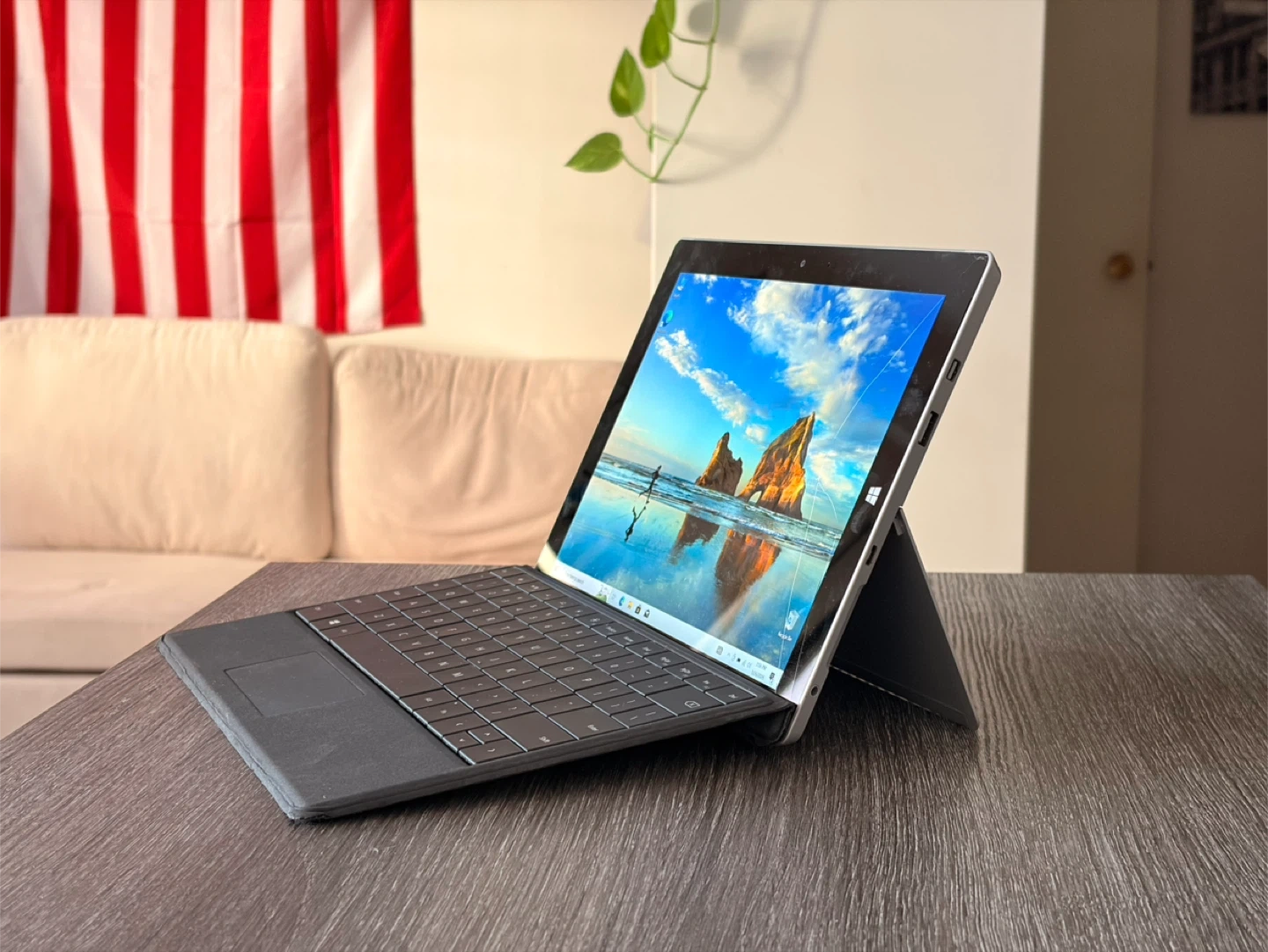 Microsoft Surface 3 Tablet with its attached keyboard. It's a versatile 2-in-1 device that functions as both a laptop and a tablet. It has a kickstand for upright viewing.