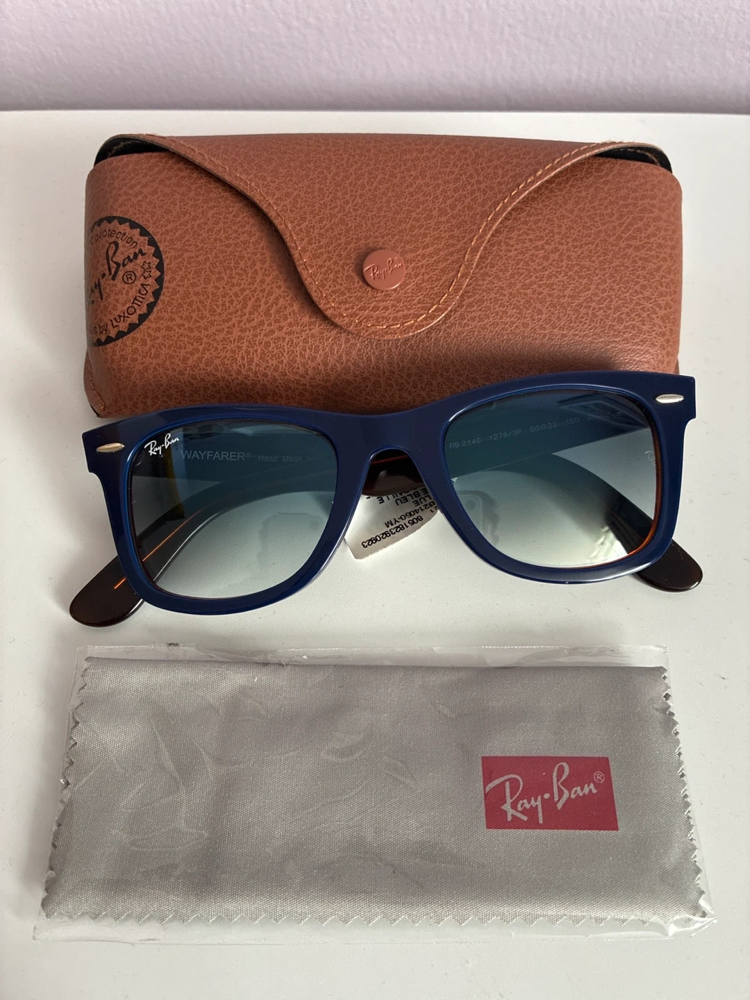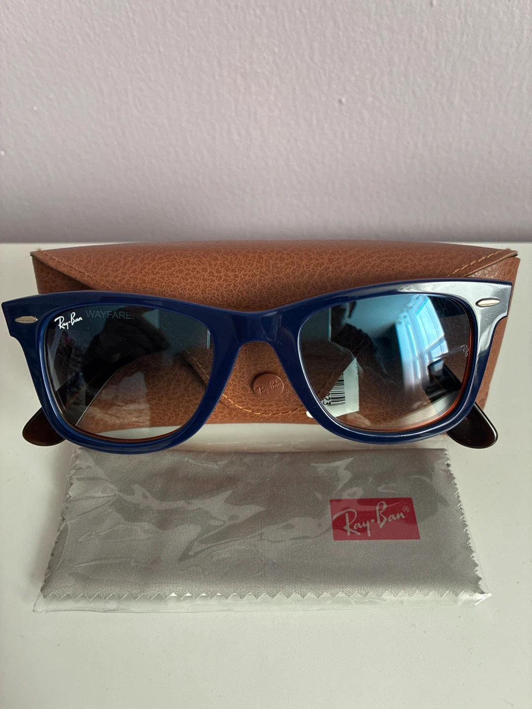 Ray-Ban Wayfarer sunglasses in a blue and red colourway. These are model RB 2140, size 50-22. Comes with the original case and cleaning cloth.
