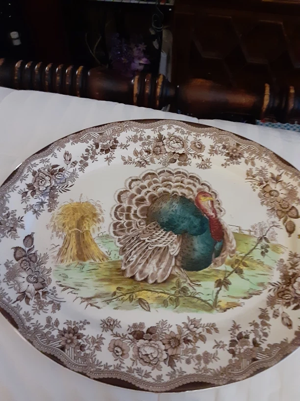 This is a Royal Taggiasca oval platter featuring a turkey and wheat sheaf design. It's made of ceramic. Measures approximately 14 inches long and 10 inches wide. Perfect for serving holiday meals!