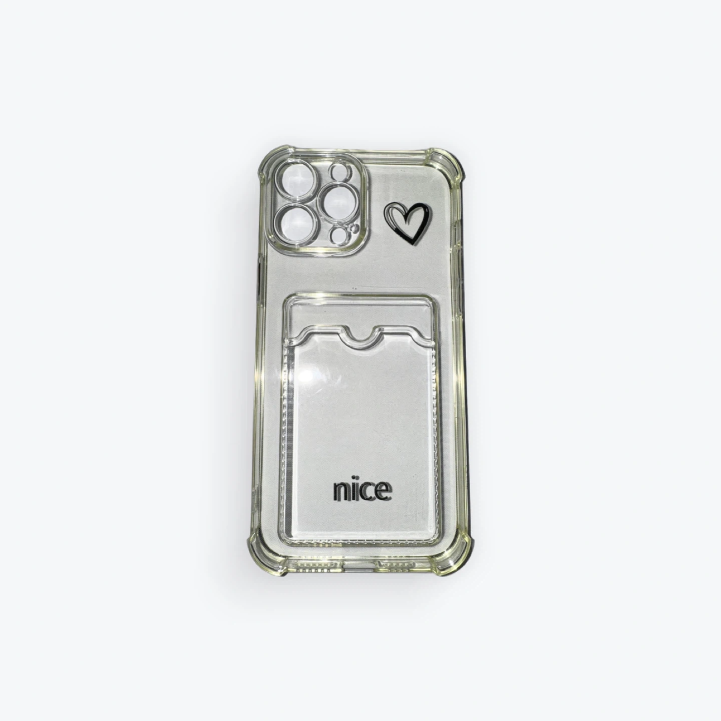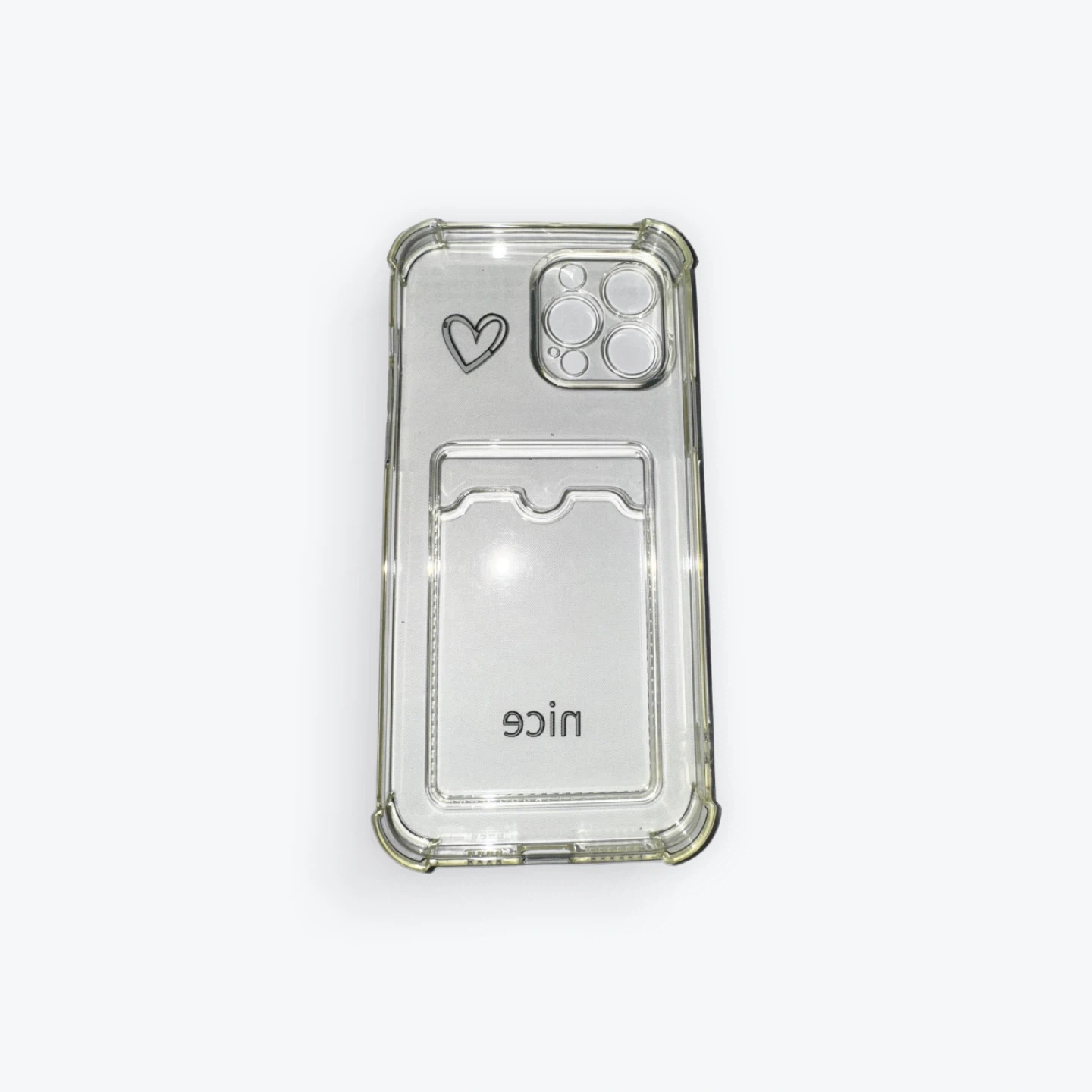 This clear phone case features a built-in card holder and a small heart graphic. It's designed to protect your phone while offering convenient storage for a card. The case offers a slim profile and easy access to ports.