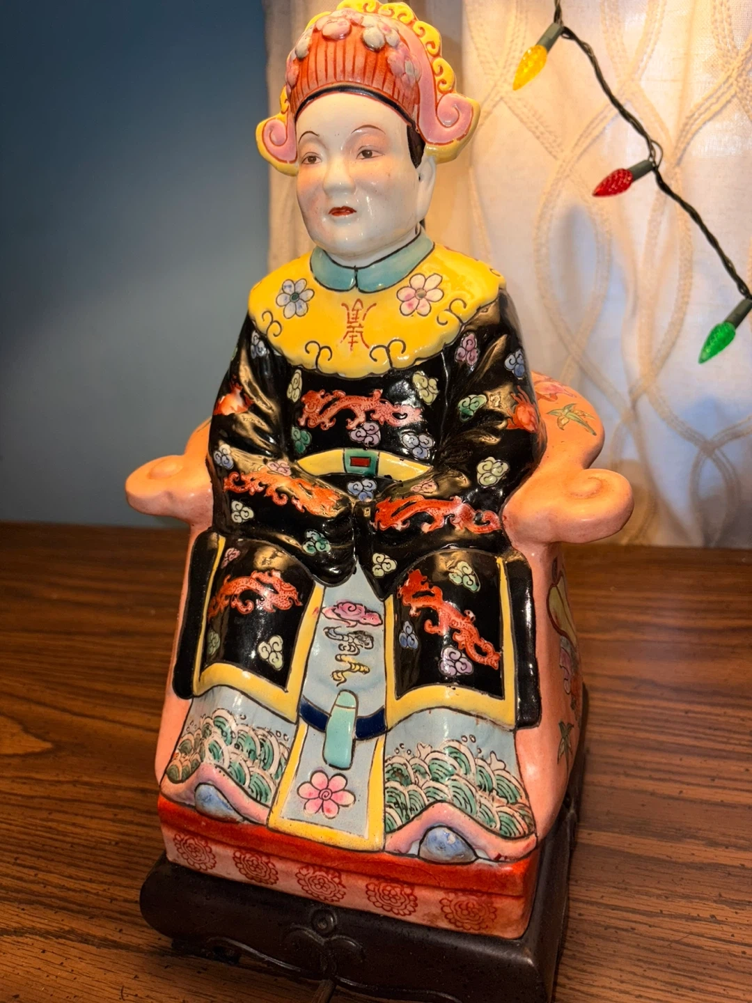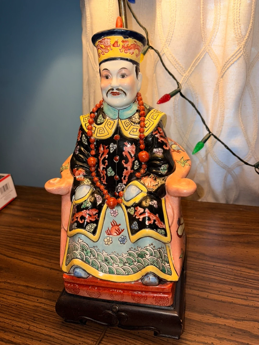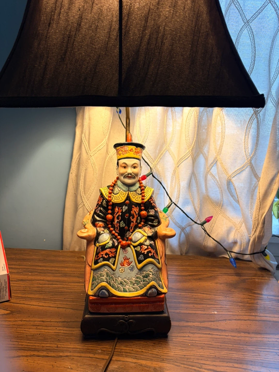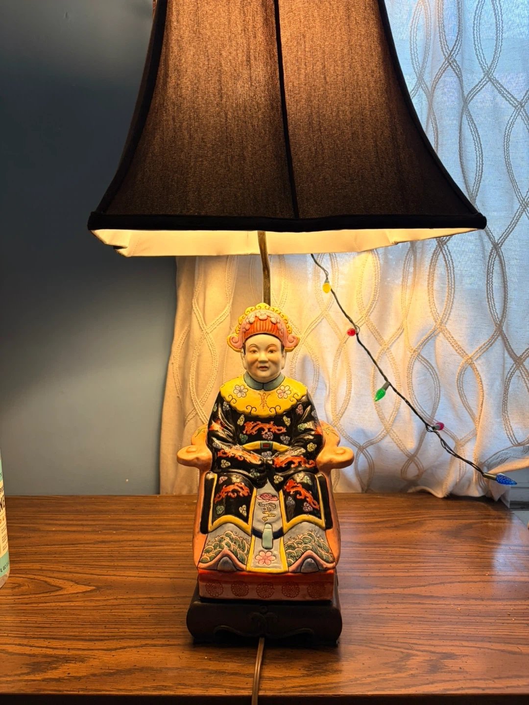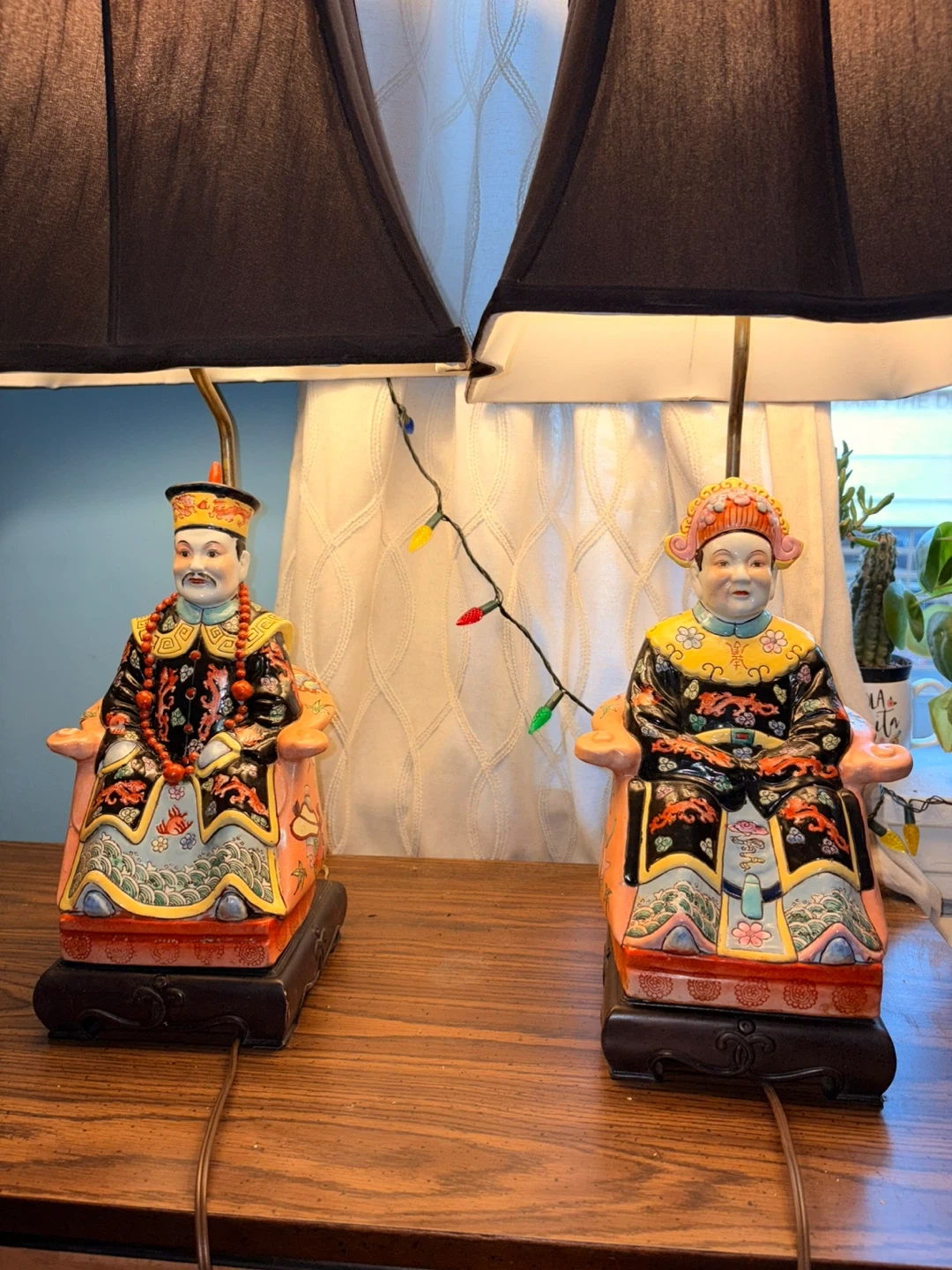 2 vintage table lamps, porcelain Japanese, Emperor and Empress in their traditional oriental attire. It's decorative and provides a warm glow!