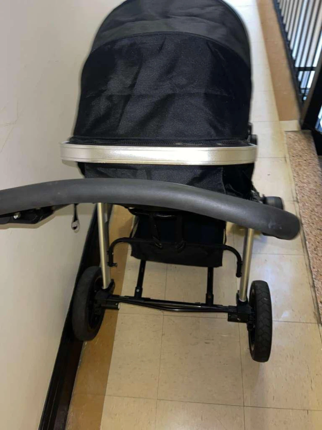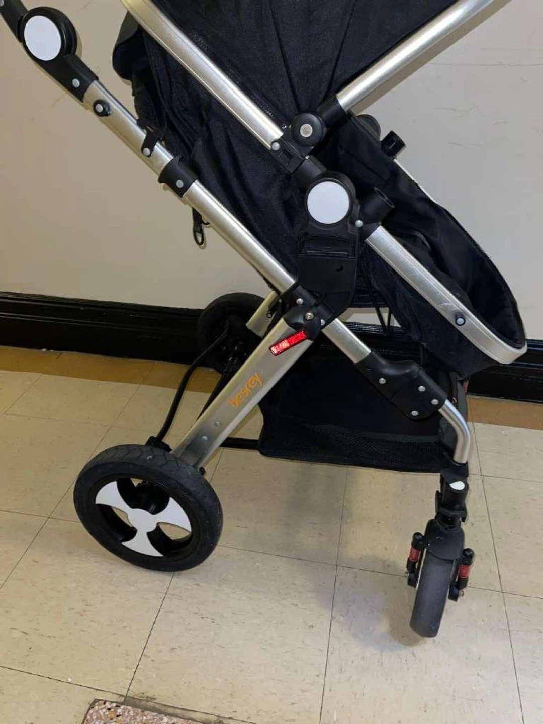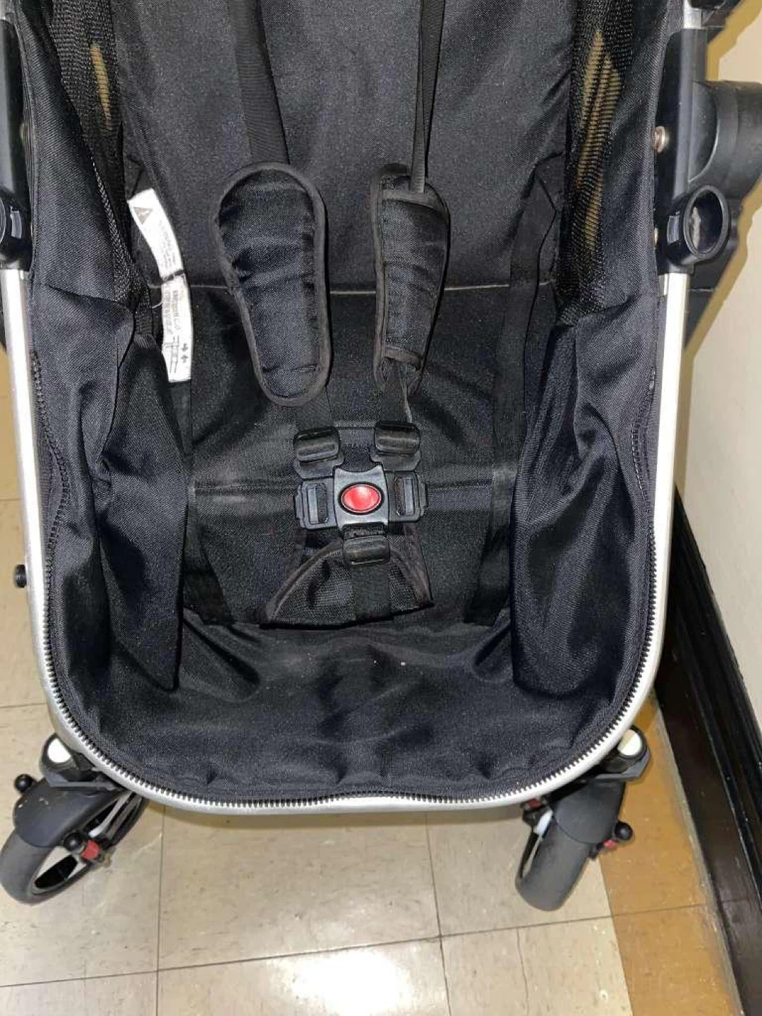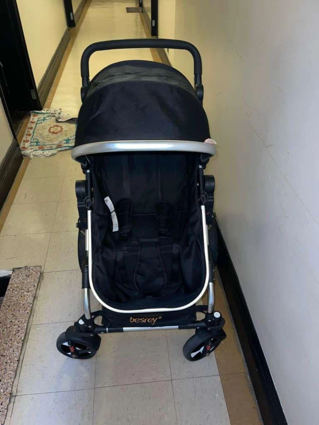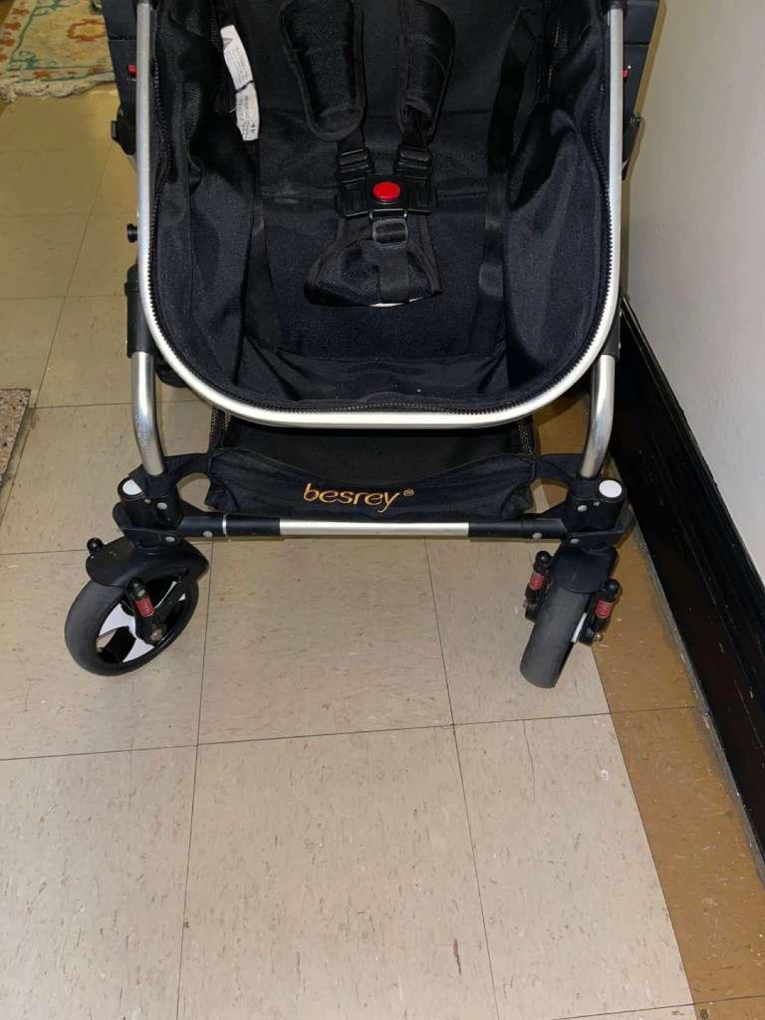 This is a Besrey lightweight baby stroller with a black seat and silver aluminum frame. does not include the bar ($10 in Amazon costs)