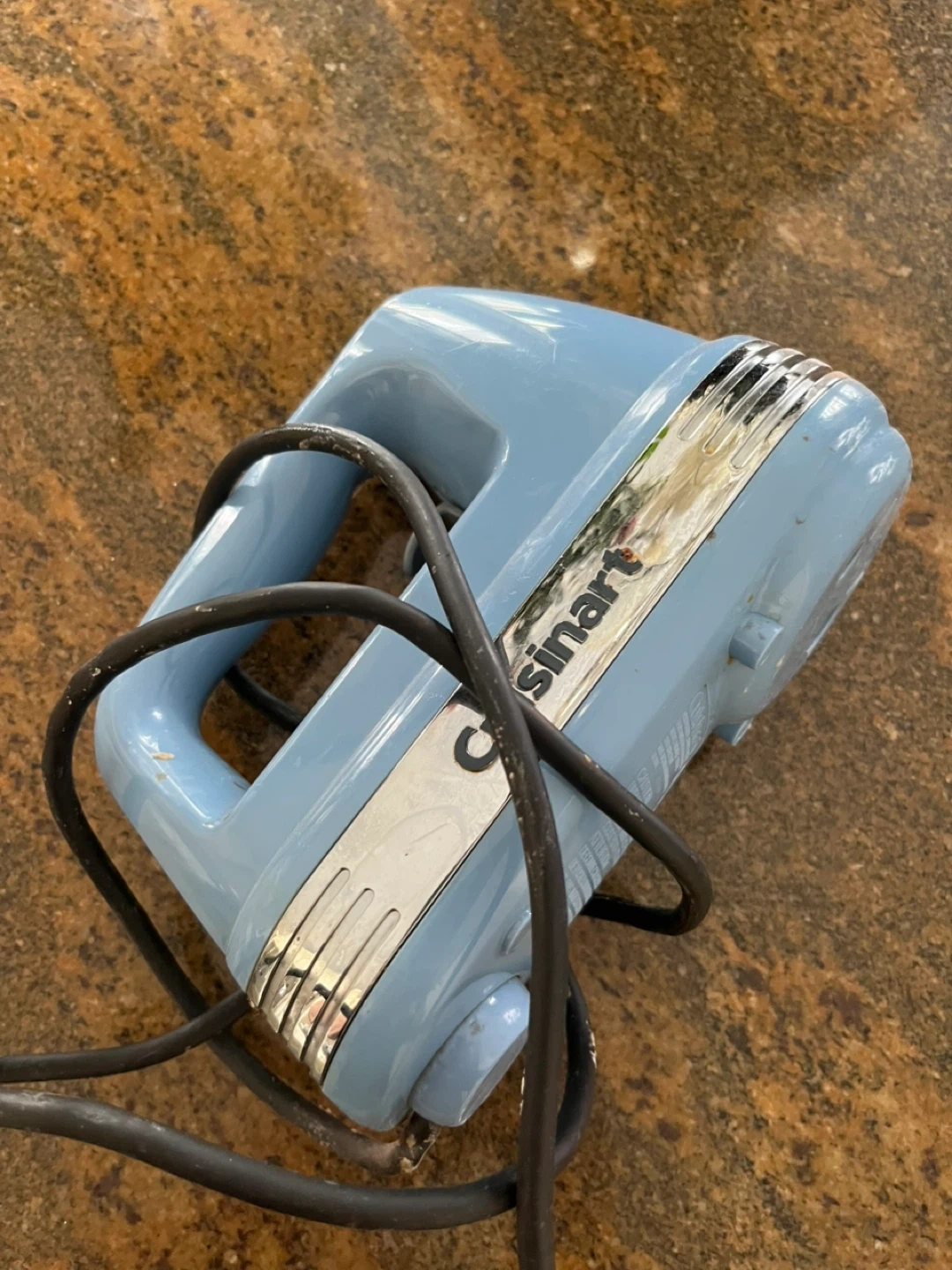 Light blue Cuisinart hand mixer with a chrome accent strip. It's a handy kitchen appliance for all your mixing needs.