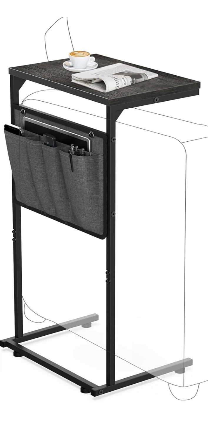 This C-shaped side table offers a dark wood-grain top and a sturdy metal frame. It includes convenient fabric side pockets for storing tablets, phones, and pens. The table's slim design fits easily next to sofas or beds. Its metal construction ensures durability!
