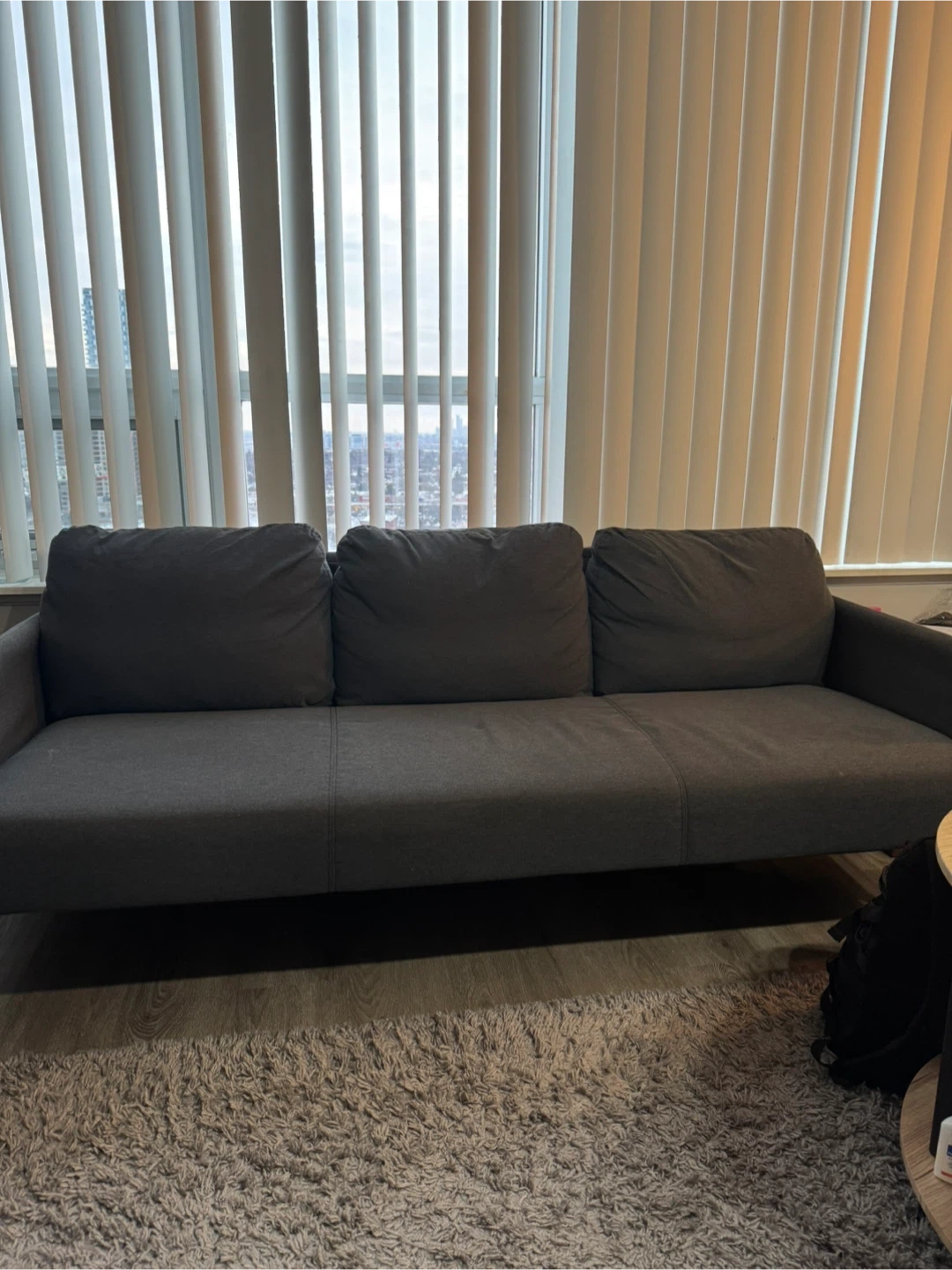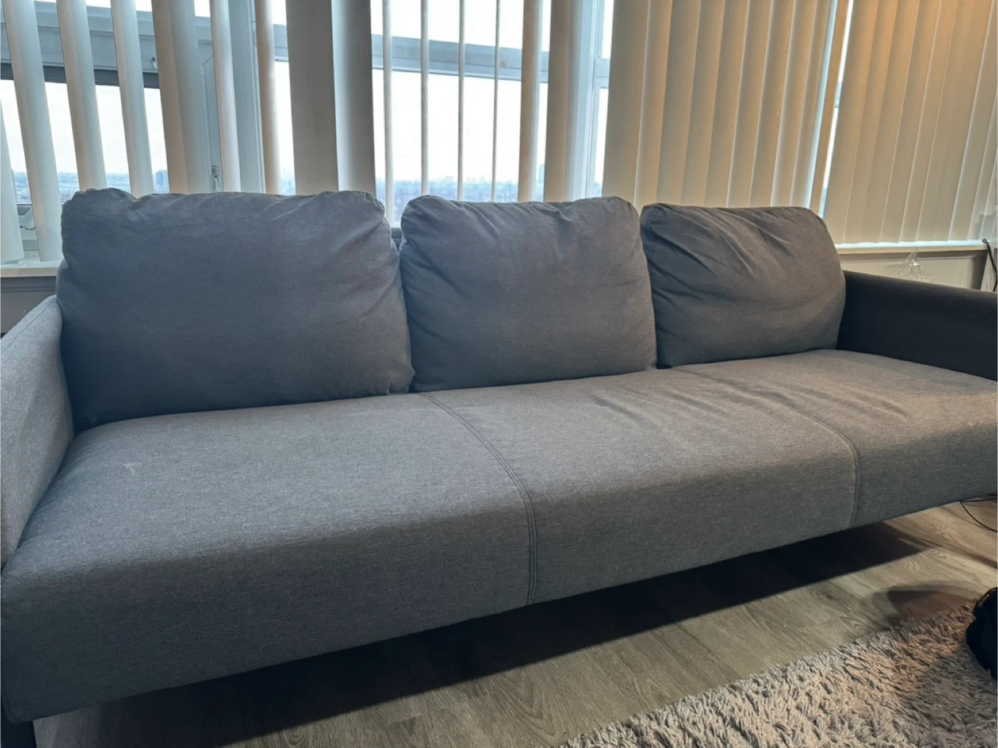 This is a grey three-seater sofa with removable cushions. It's made of fabric material and has a clean, modern design. It's a comfy addition to any living space!