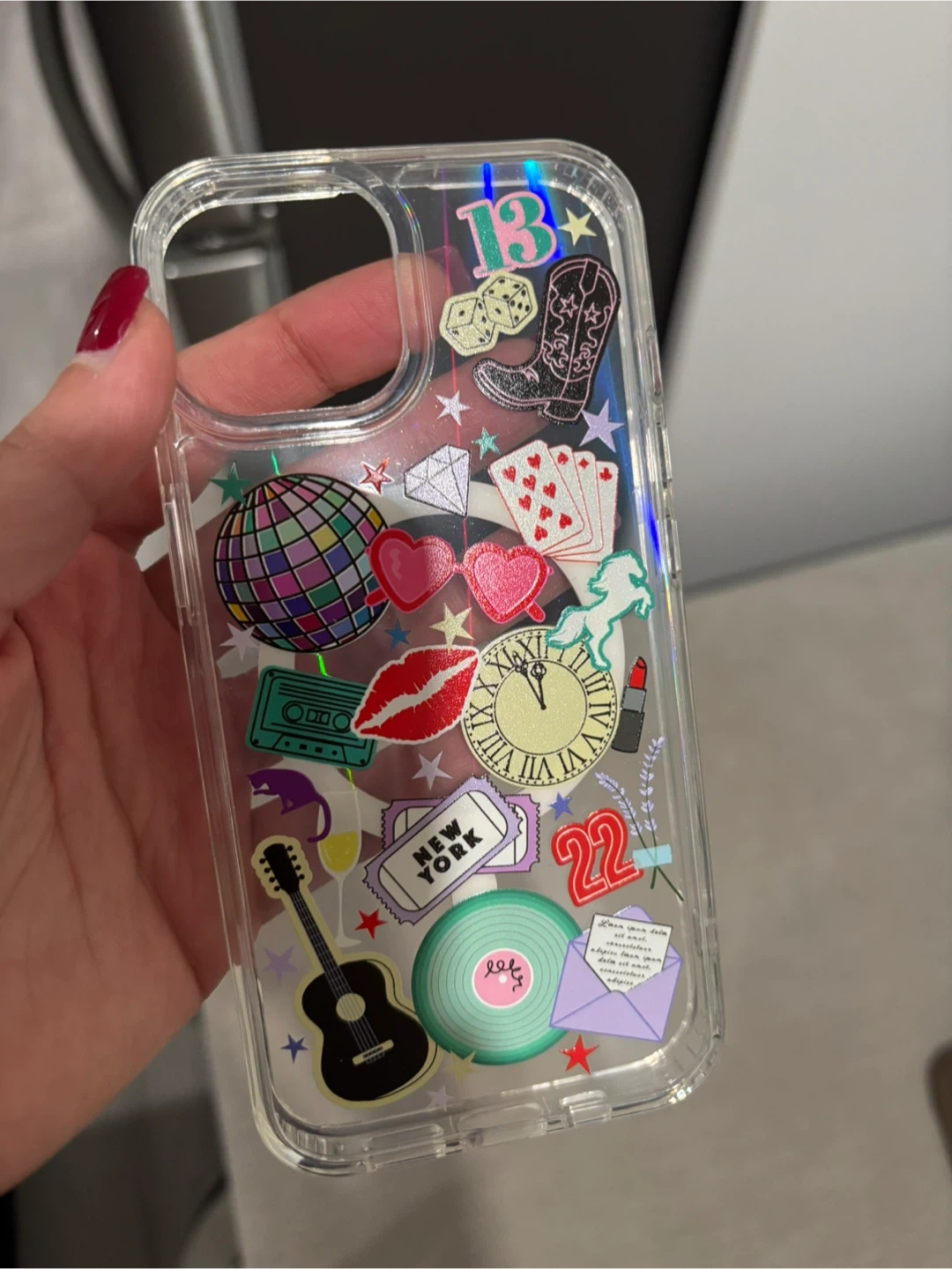 This clear iPhone case features a fun collection of holographic charms like a disco ball, cowboy boots, and music notes. It's designed to protect your phone while adding some sparkle. The case is made of durable clear plastic.