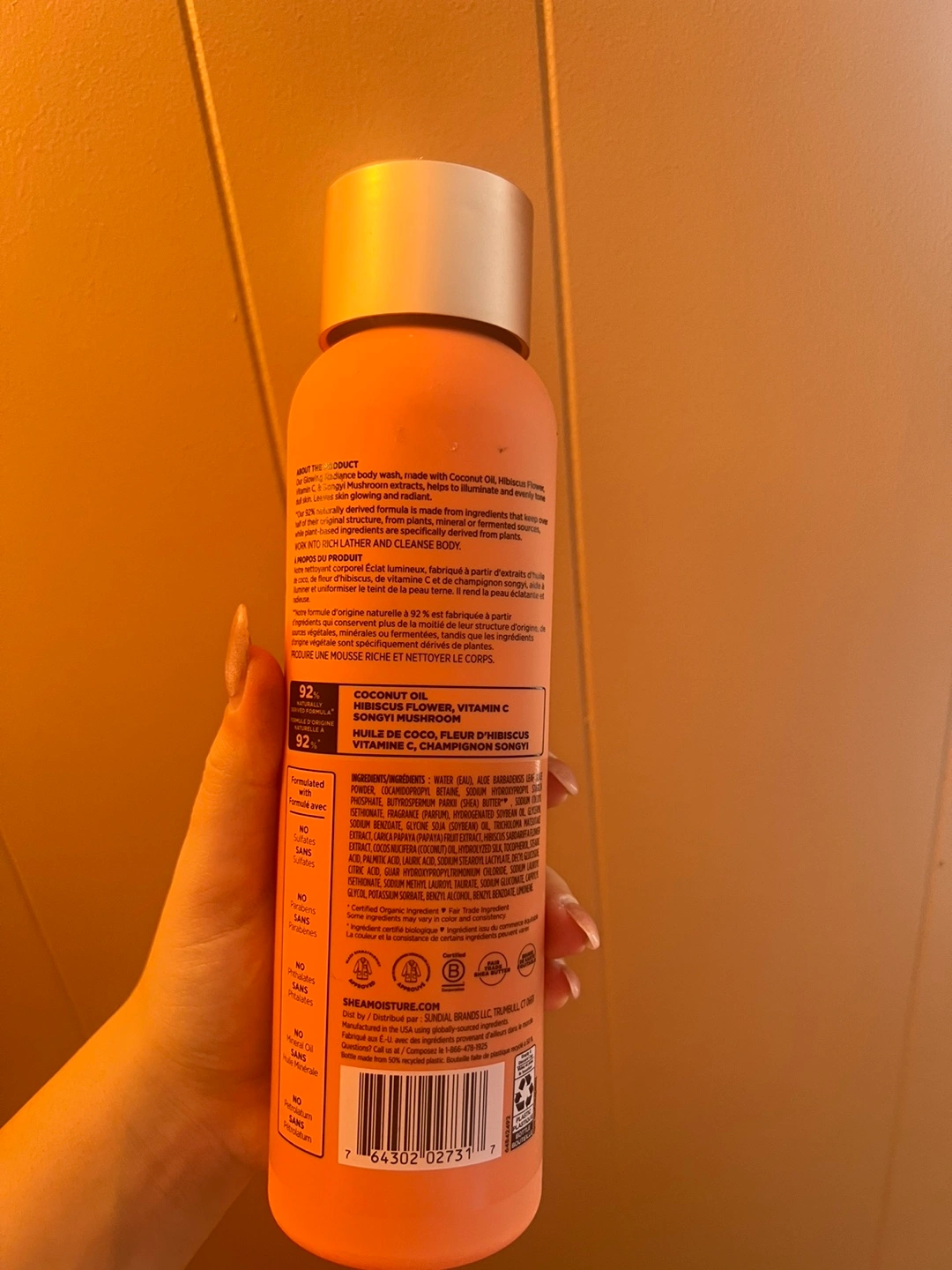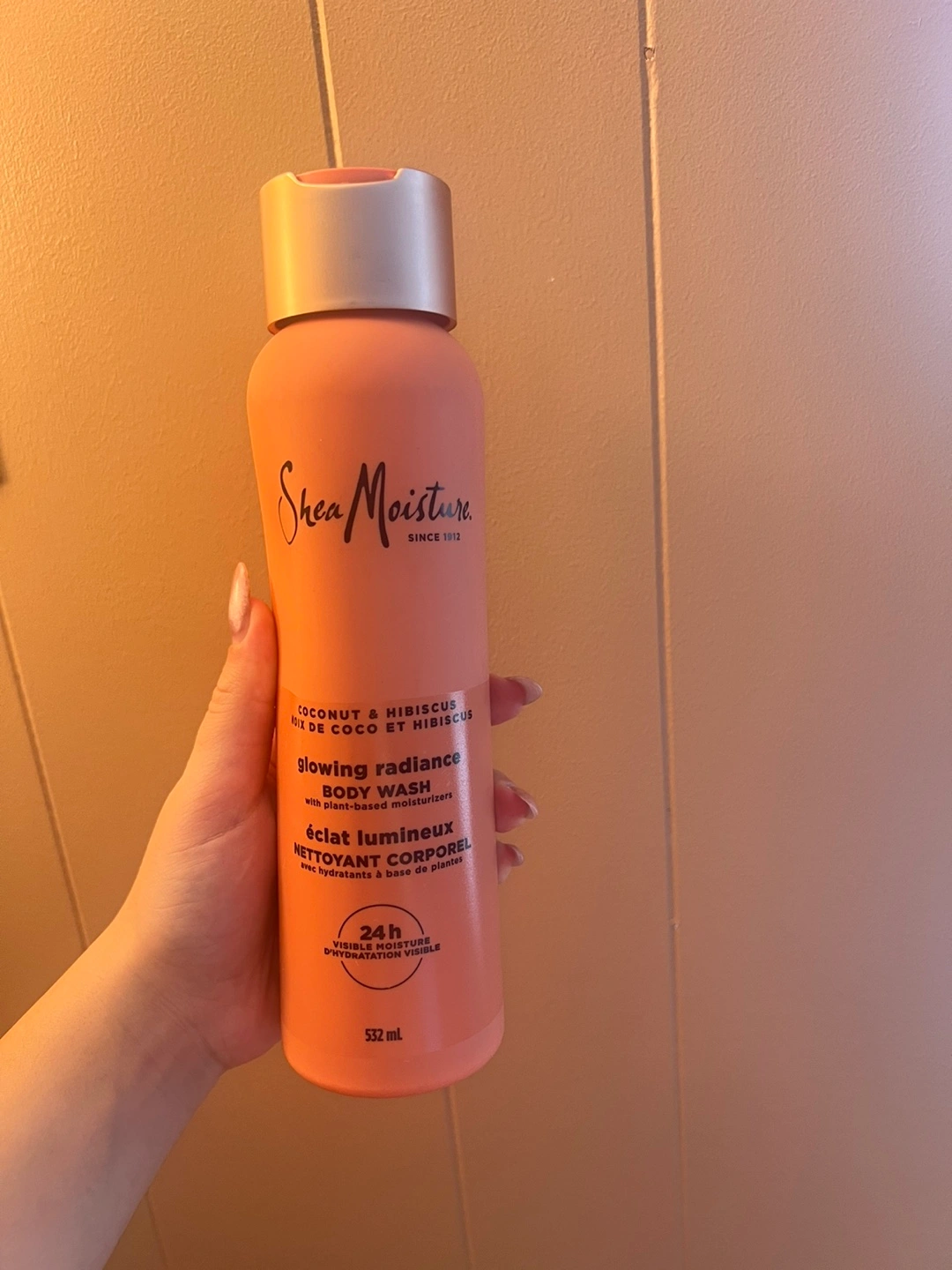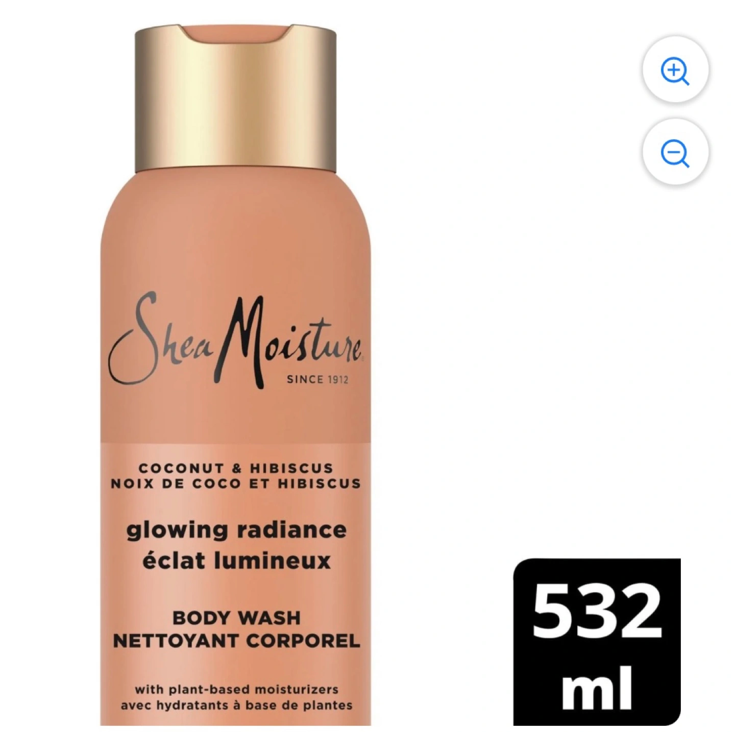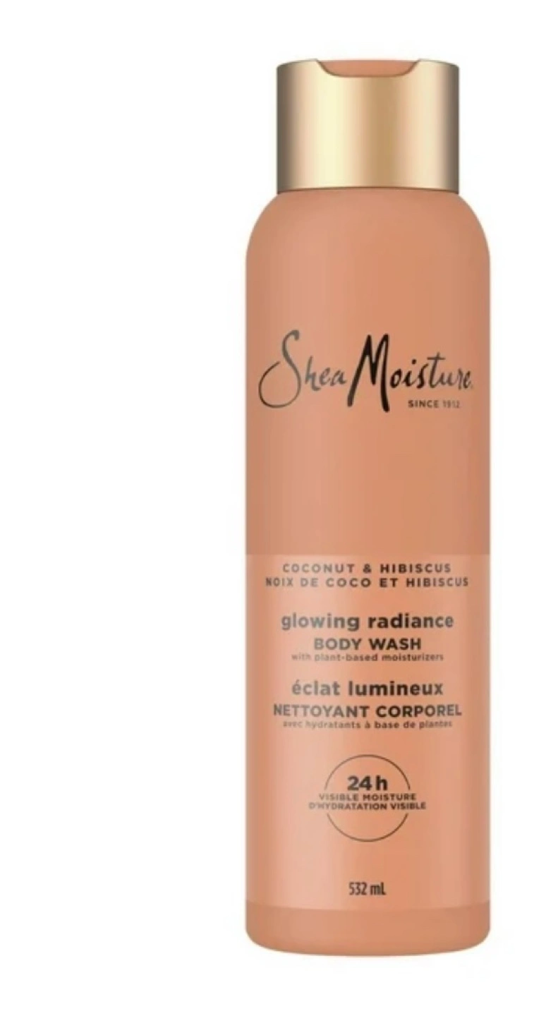 This is a Shea Moisture Coconut & Hibiscus Glowing Radiance Body Wash. It's a 532ml bottle with plant-based moisturizers. It smells amazing!