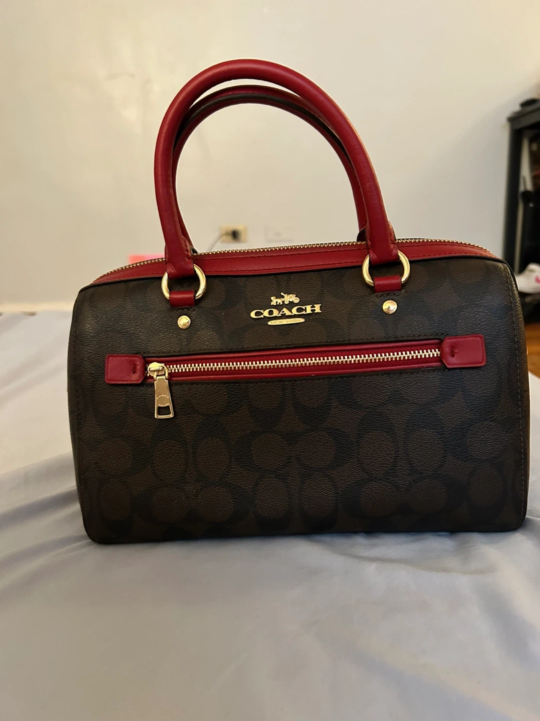 This Coach barrel bag features the brand's signature C monogram canvas with red leather trim and handles. It has a zippered main compartment and gold-tone hardware. A classic everyday bag!