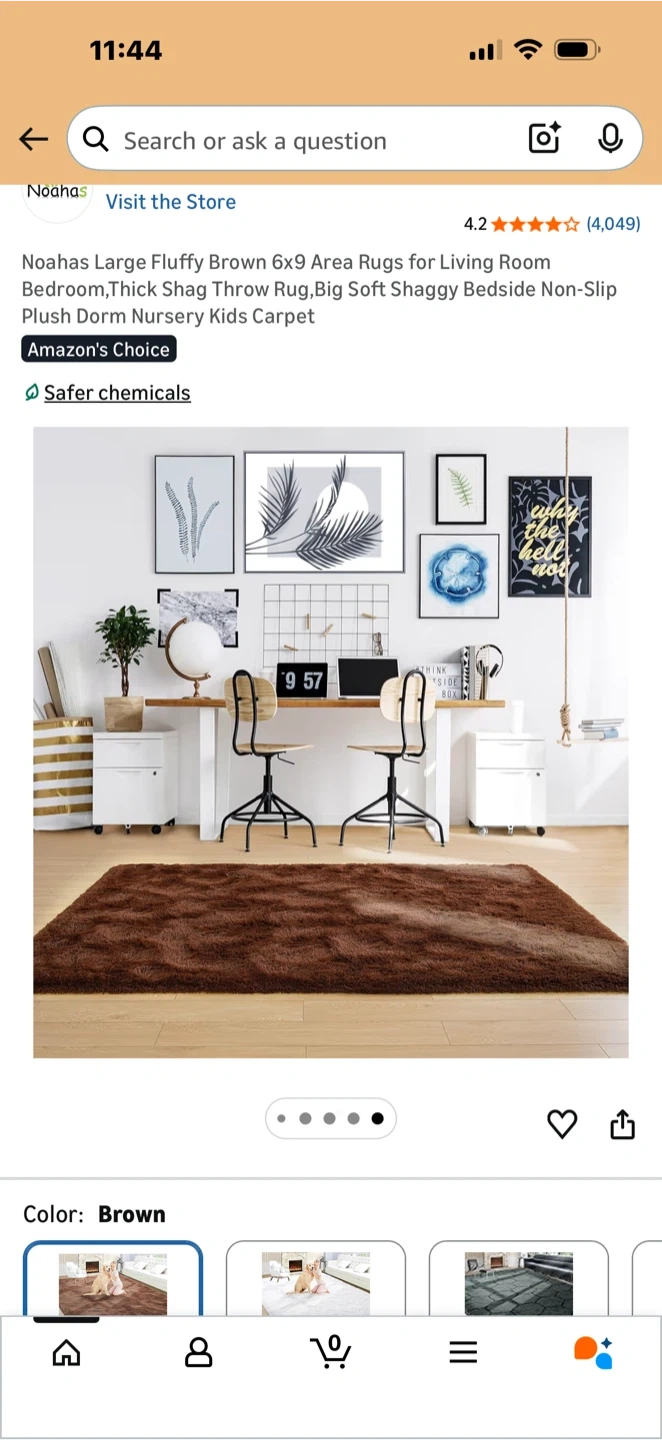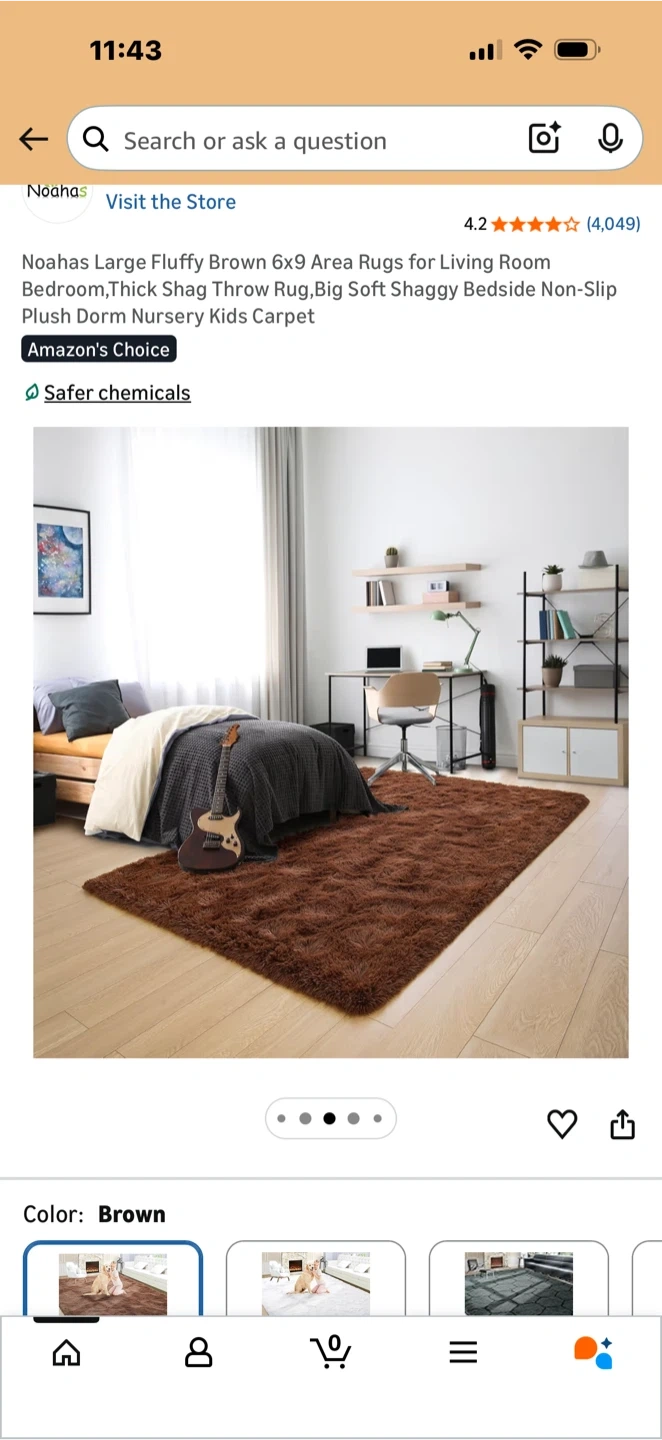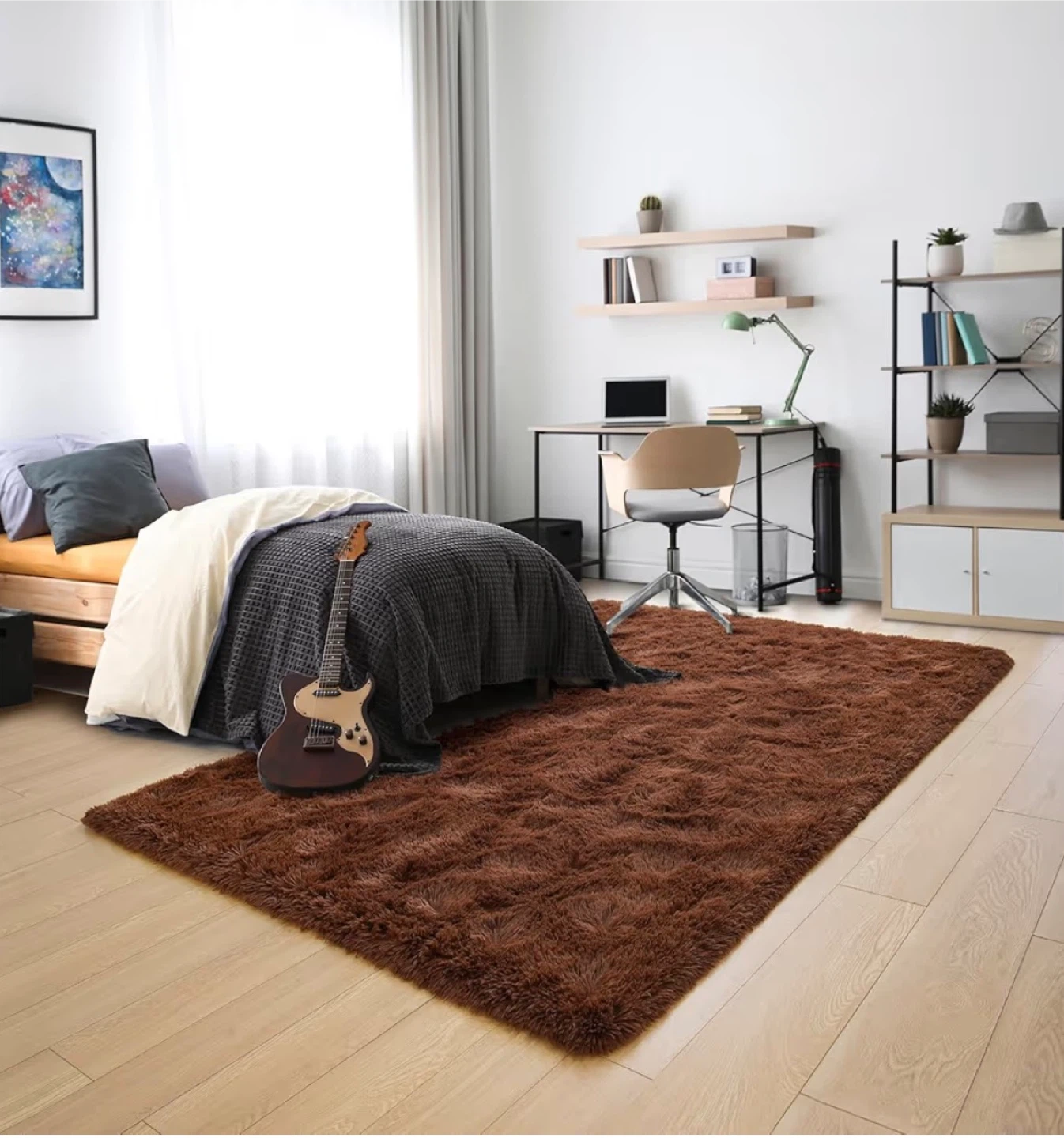 This is a Noahas large, fluffy area rug in a rich brown color. It's a 6x9 size, perfect for living rooms or bedrooms. The rug is soft and shaggy, designed to be non-slip. Its plush texture adds comfort to any space!