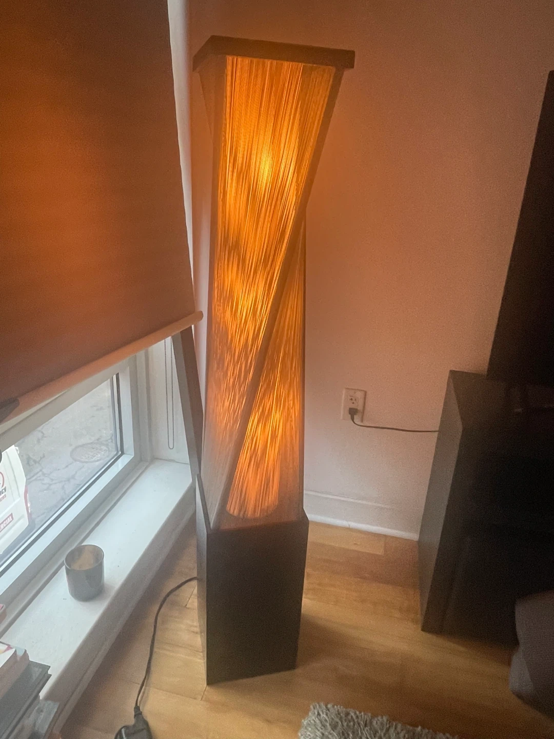 This unique floor lamp features a modern, twisted spiral design. It casts a warm, inviting glow when lit. The base is a dark, contrasting color.
