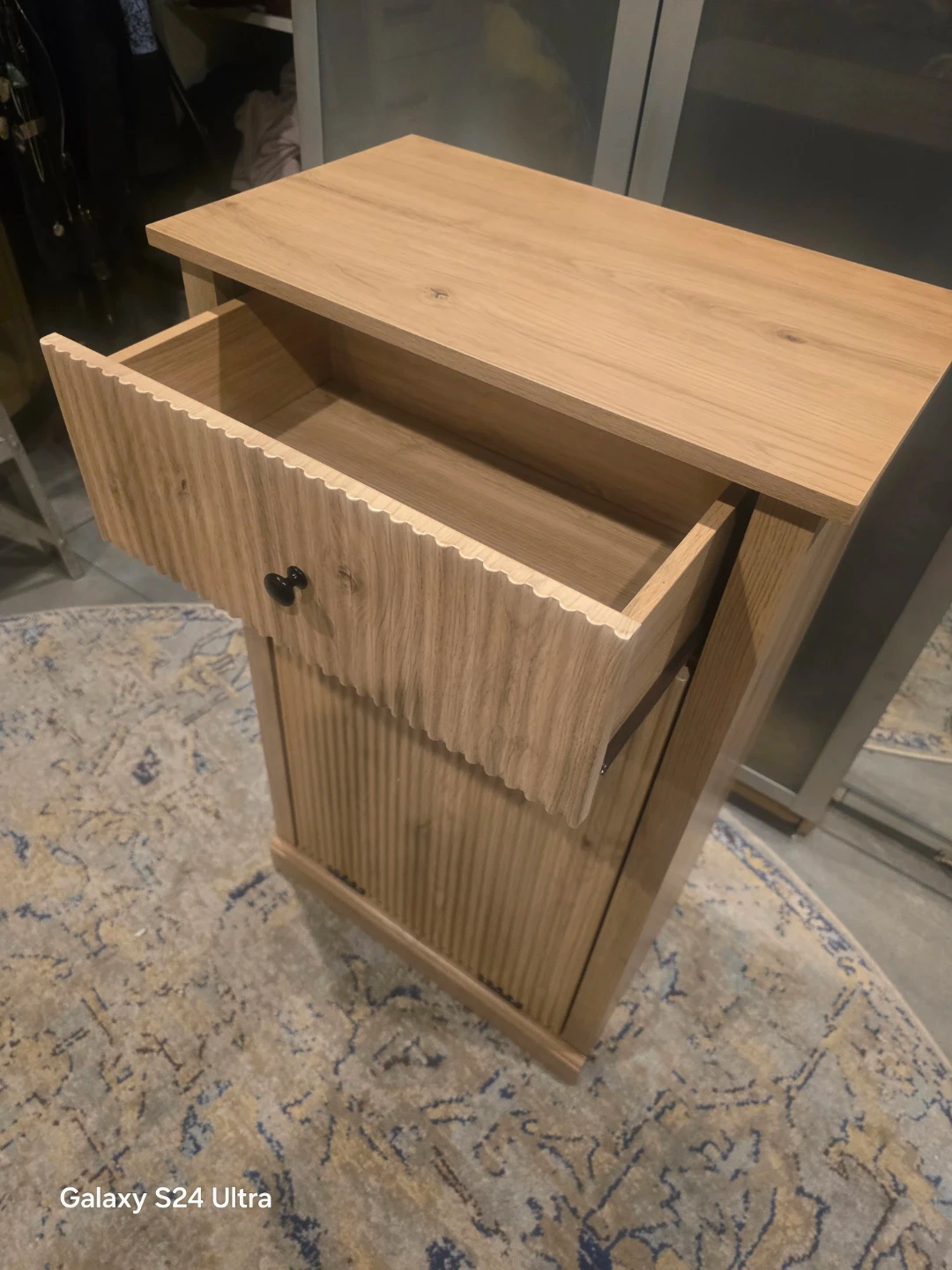 This cabinet features a tilt-out design for easy laundry access and a convenient drawer for storage. It includes one laundry basket bag with a maximum cabinet load of 25 lbs. The natural oak finish adds a modern touch to your space. Dimensions: 16.3" W x 13" D x 35.8" H.