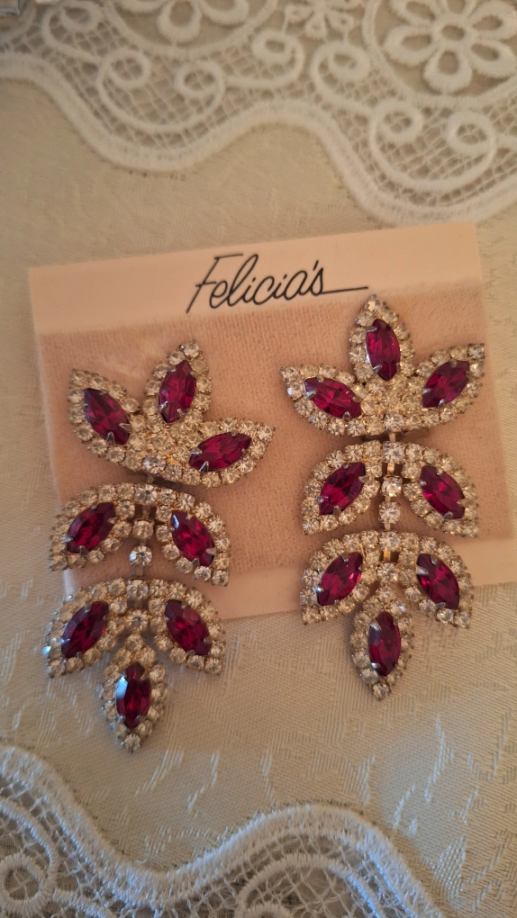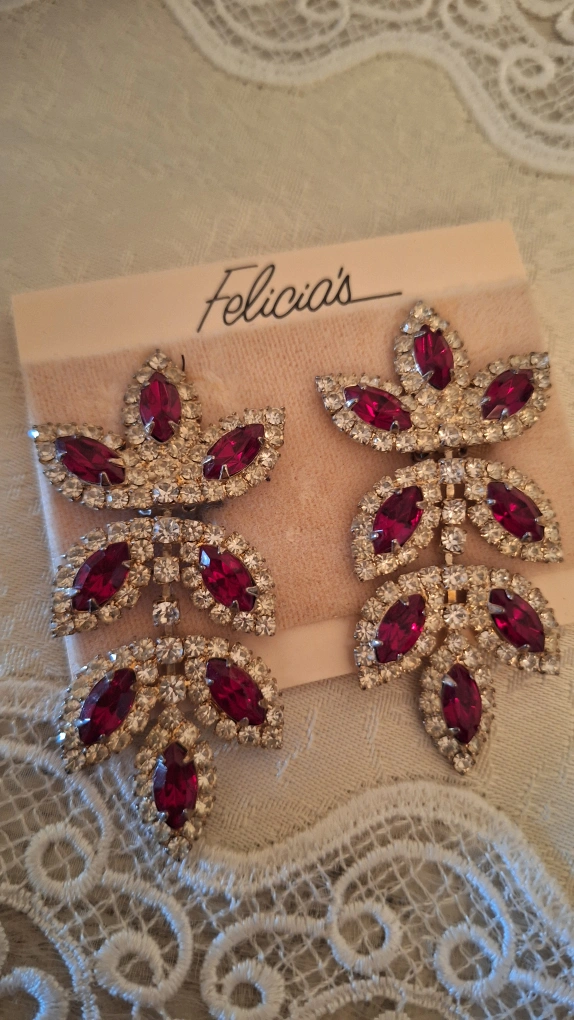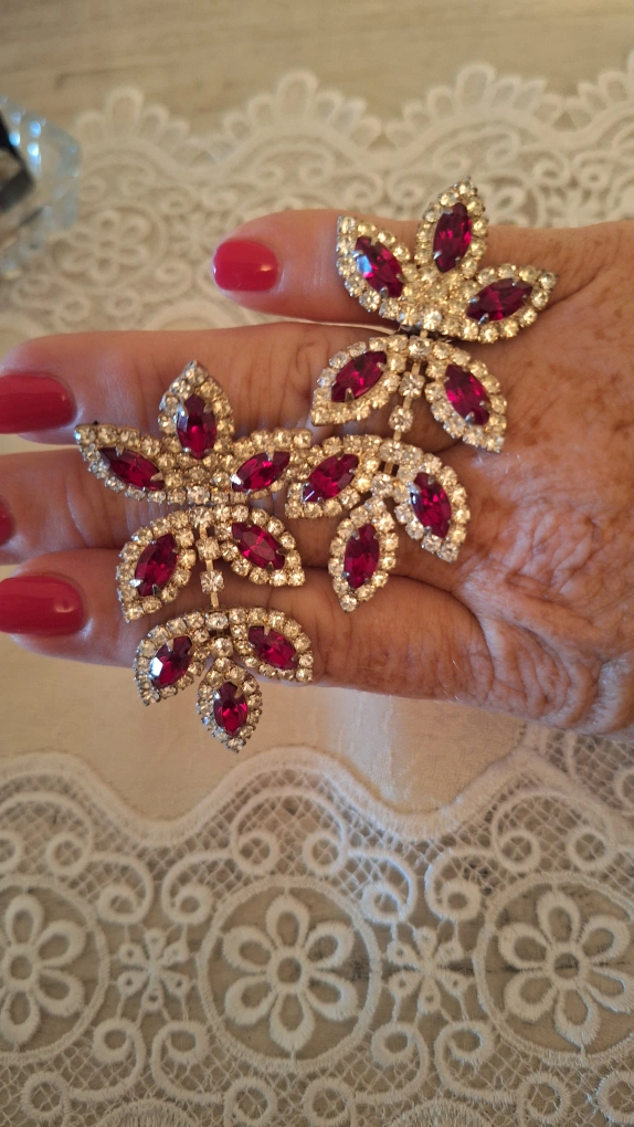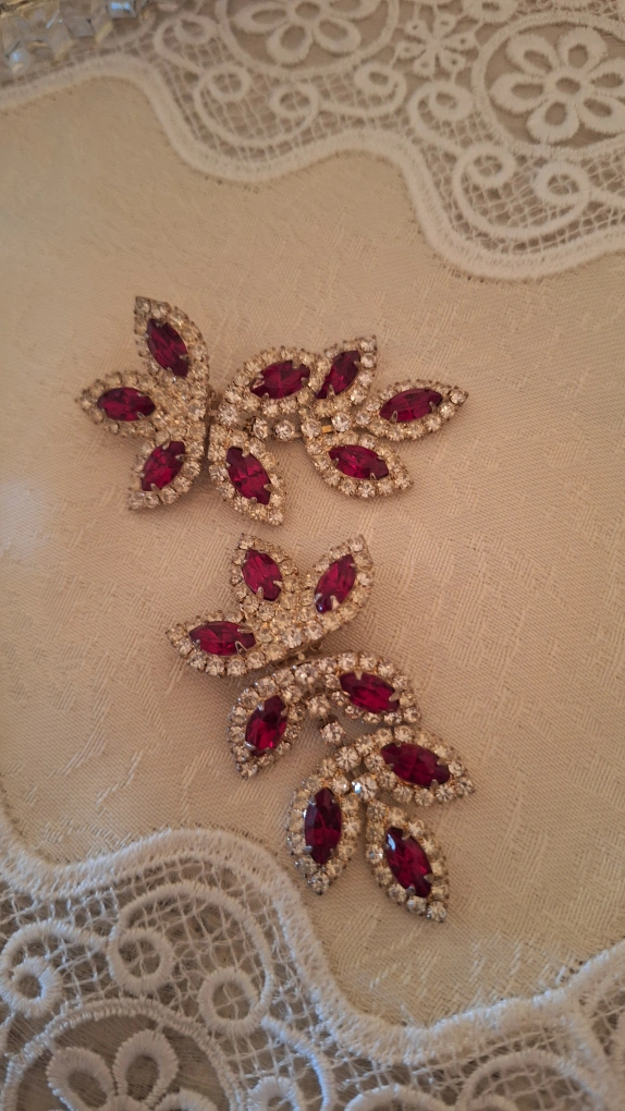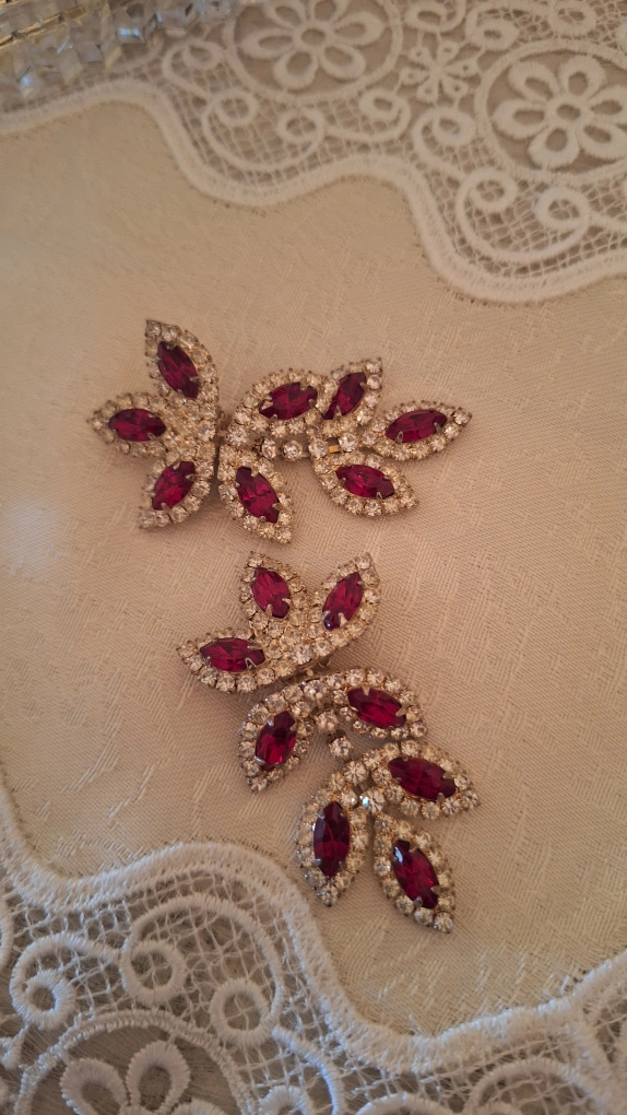 These are a pair of vintage clip-on earrings. They feature a leaf-like design with red and clear rhinestones. They are in good condition and ready to add a touch of vintage glamour to your outfit