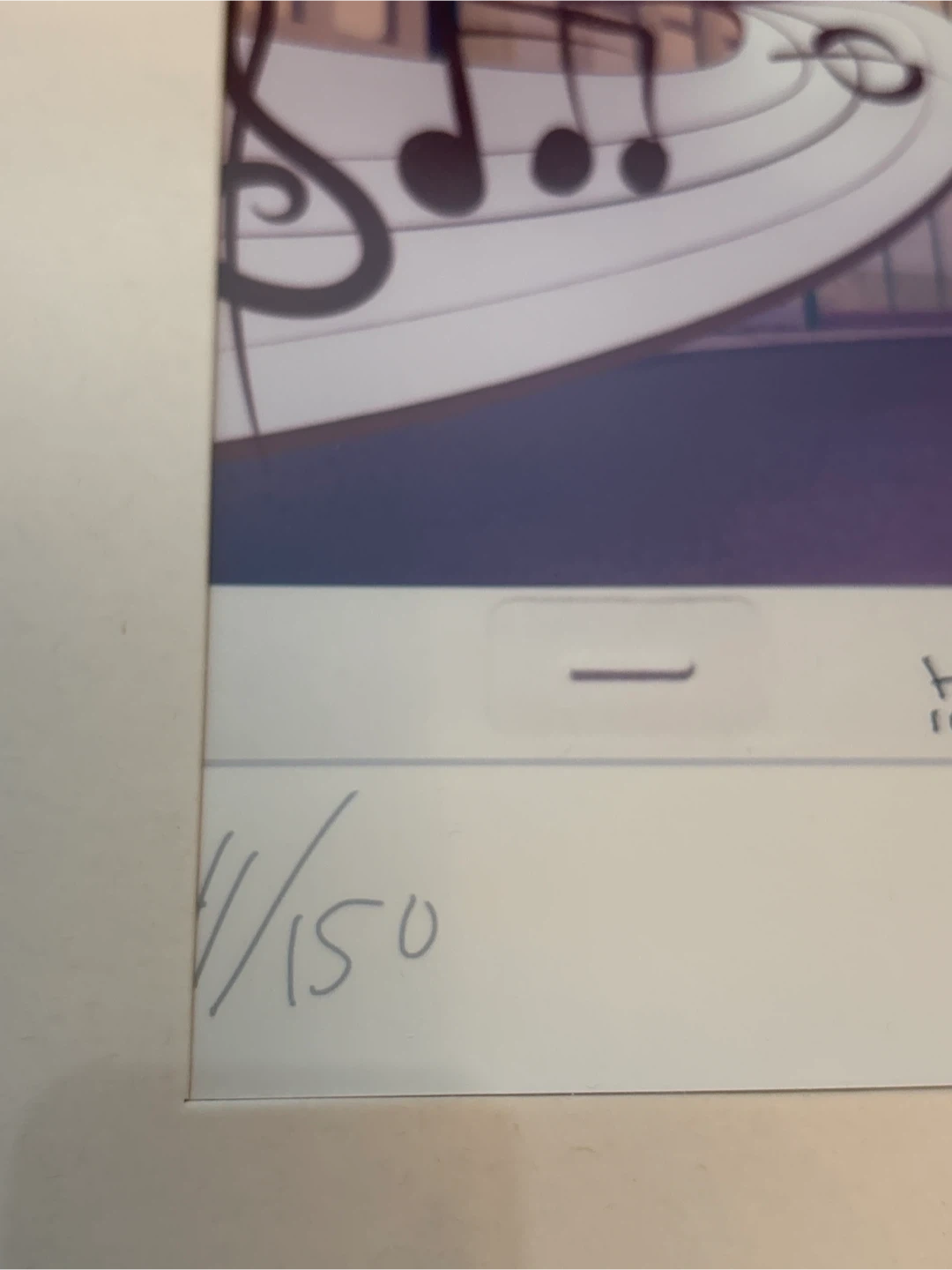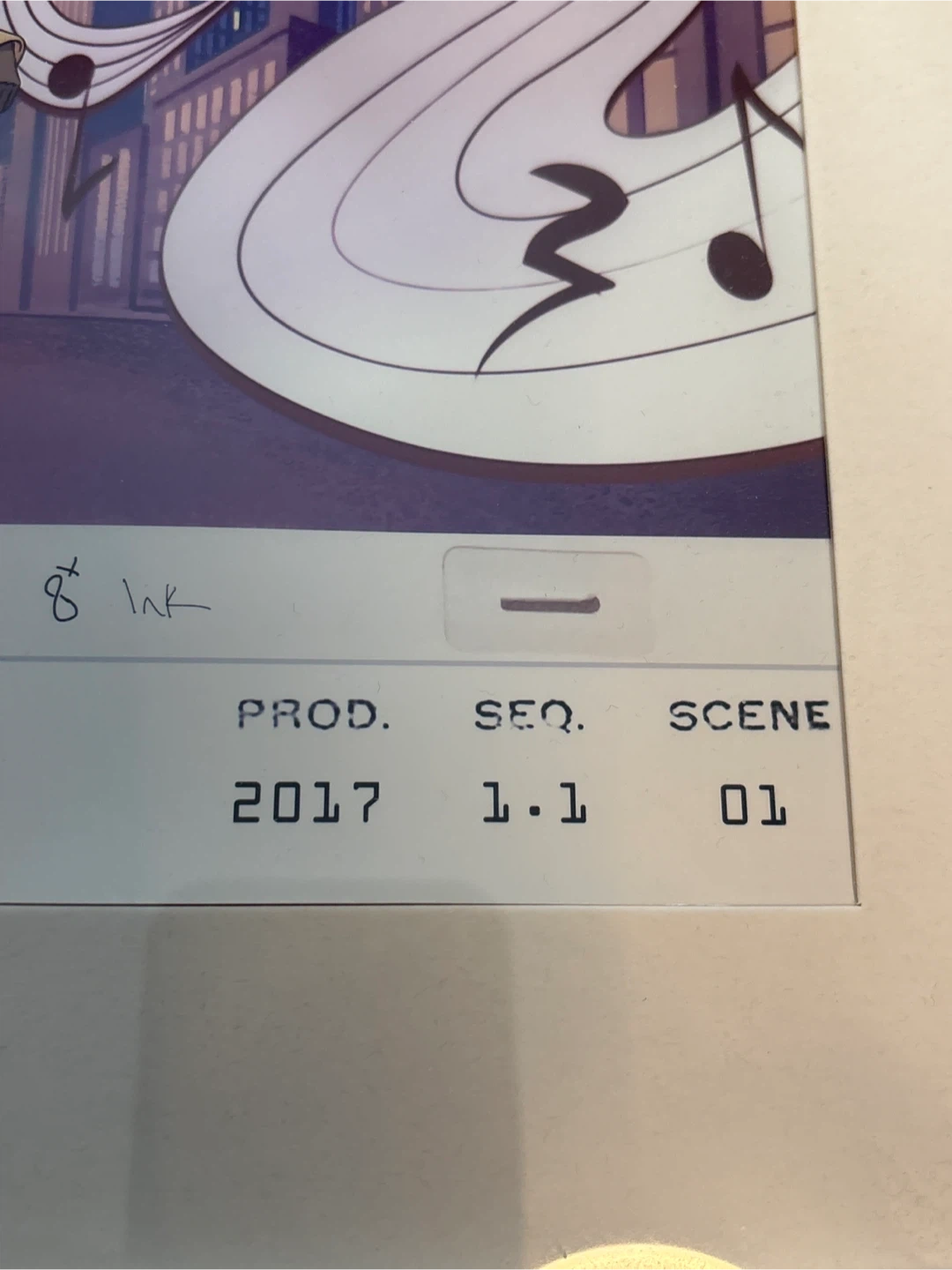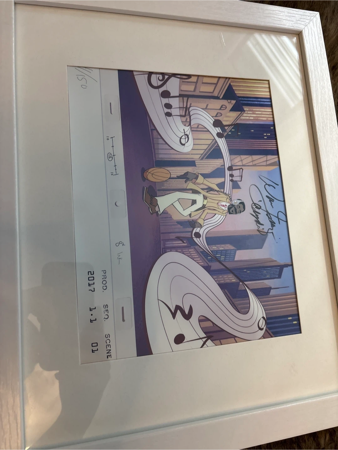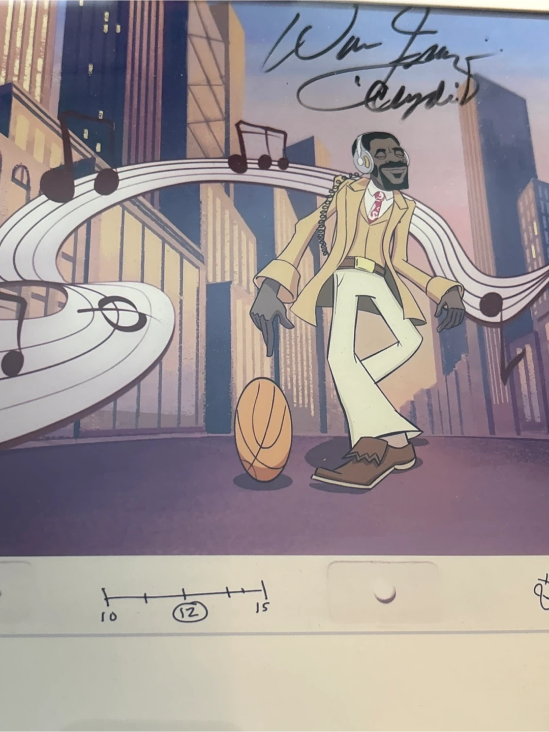Walt Fraser autographed, animation cel,numbered 11 of 150. It features a character of Walt Frasier with headphones and a basketball, set against a city backdrop with musical notes. The cel is signed and includes production details like date, sequence, and scene number. 13x15 inches
