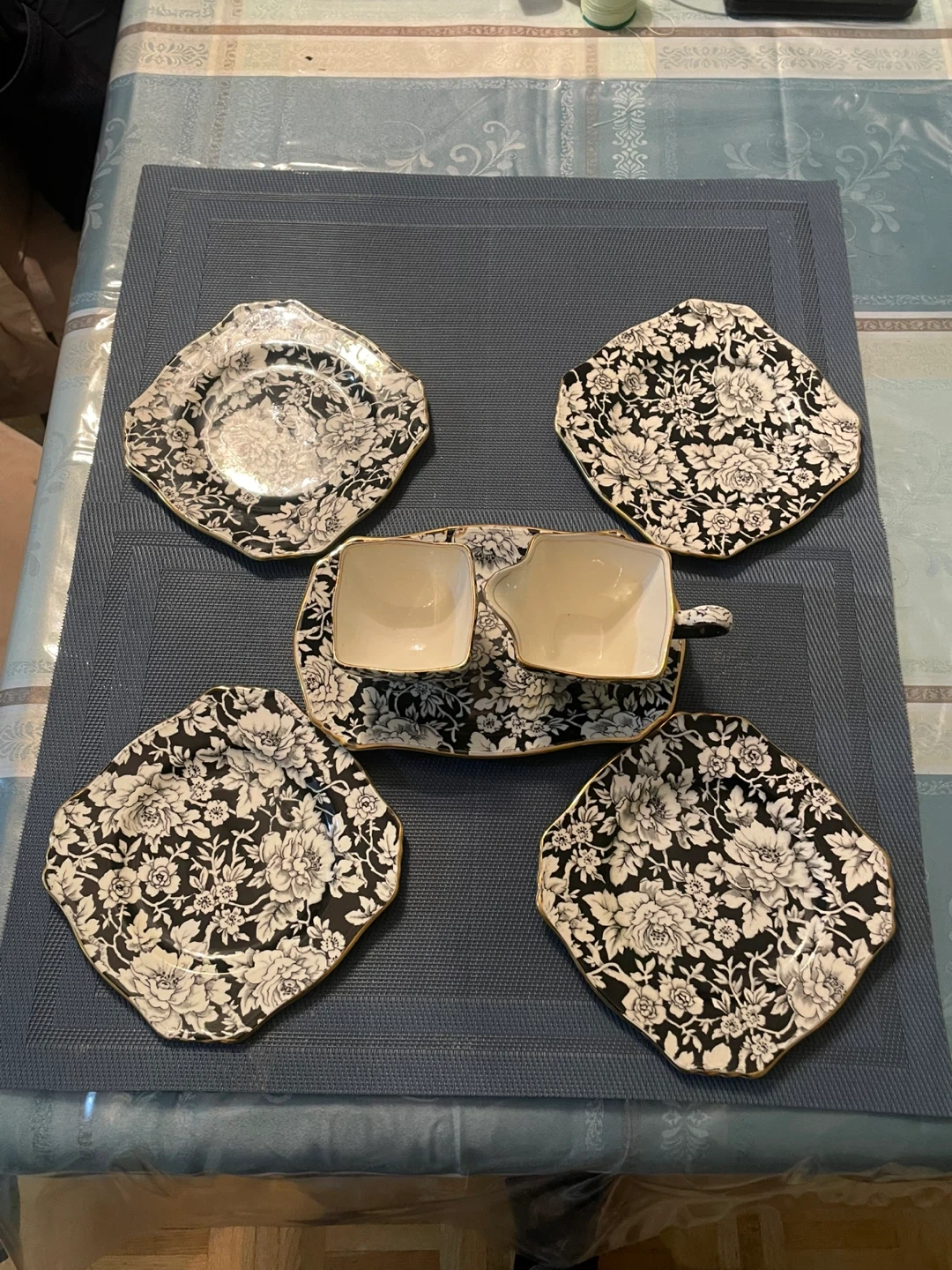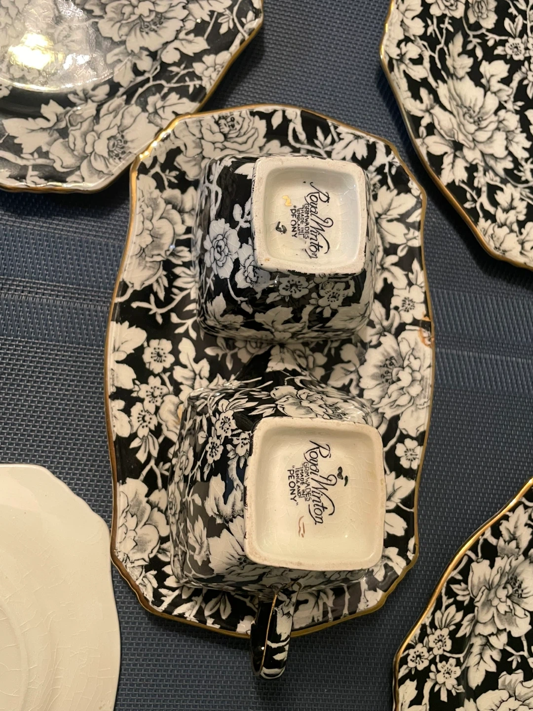 Elegant vintage tea set featuring the "Peony" pattern by Royal Winton. Includes two cups and saucers with a matching tray. Crafted from fine bone china with a classic floral design and gold trim.
