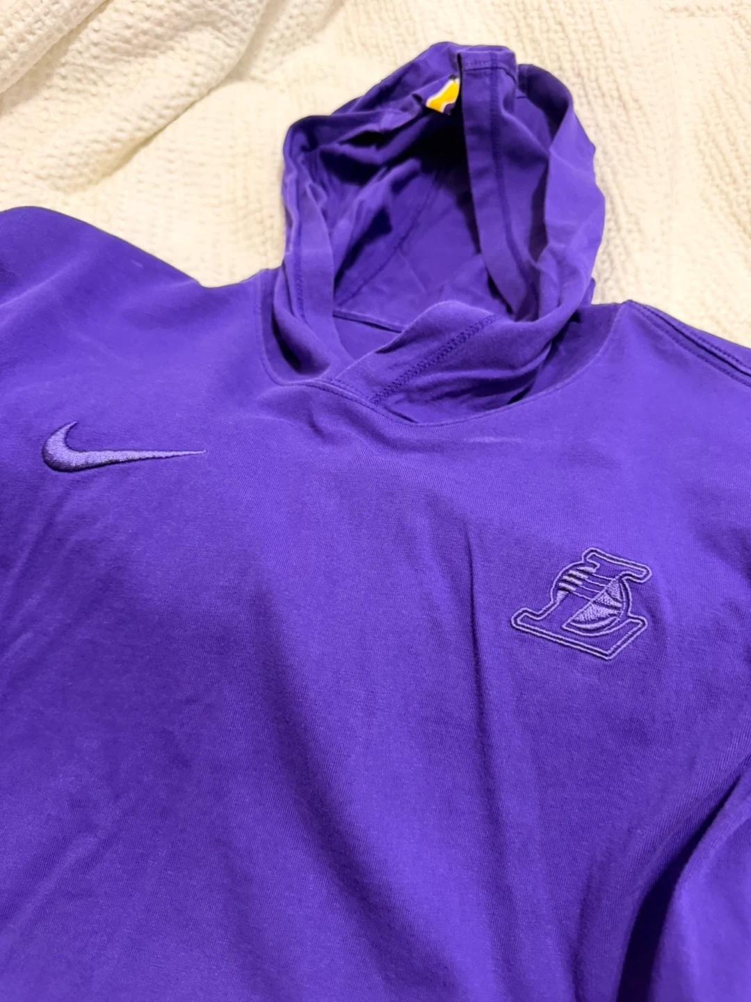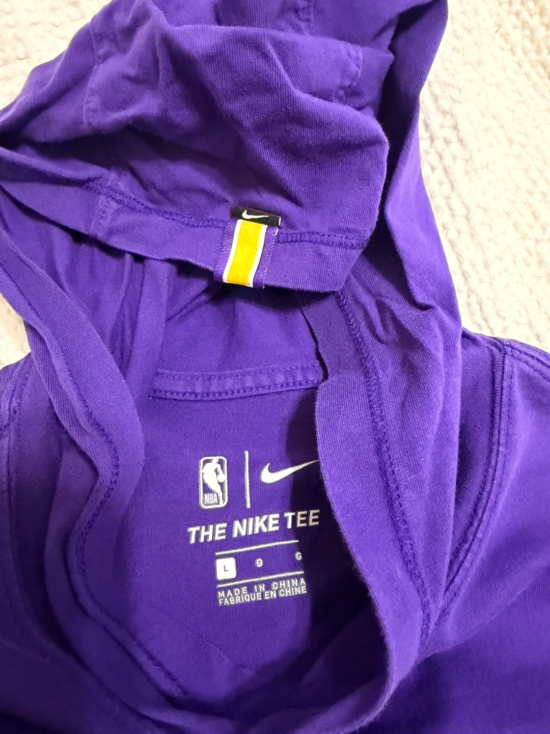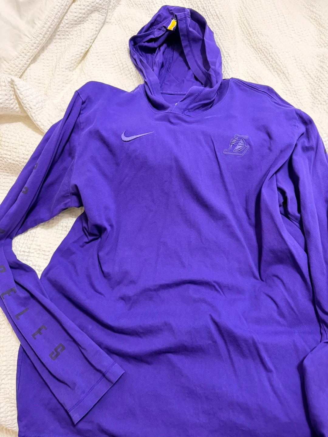 This Nike tee features the Los Angeles Lakers logo and NBA branding. It's a purple, long-sleeve hooded t-shirt. MensSize is Large.