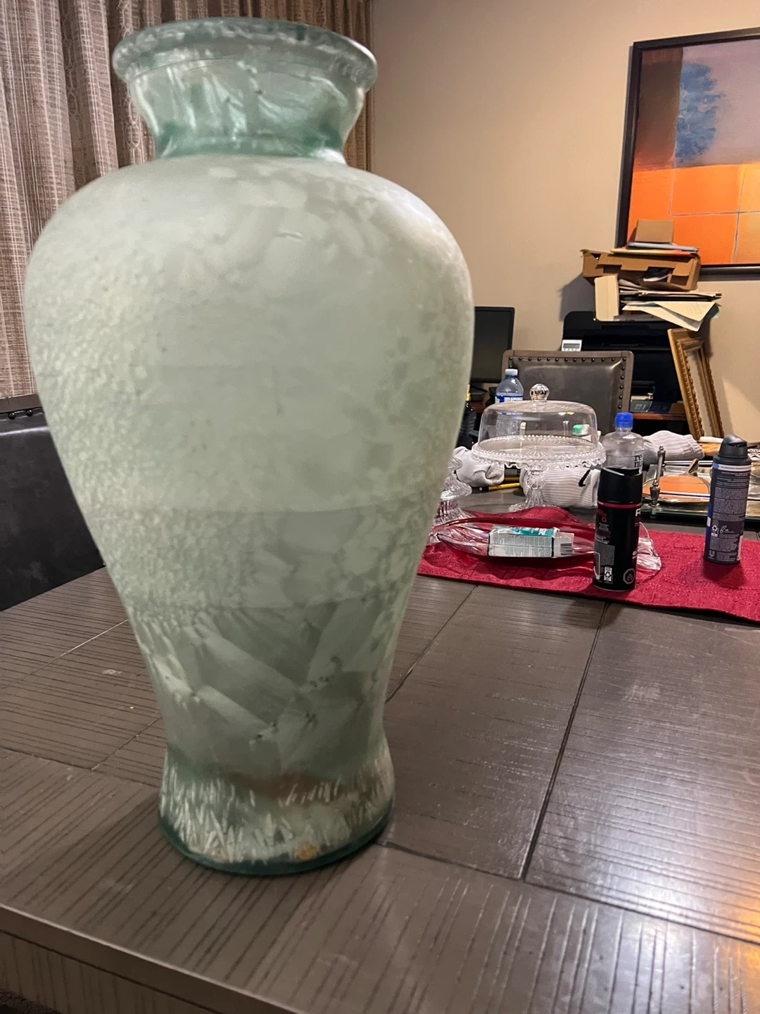 A used large, frosted glass vase with a unique textured pattern. It's perfect for displaying flowers or as a standalone decorative piece. The glass material offers a subtle, elegant look.