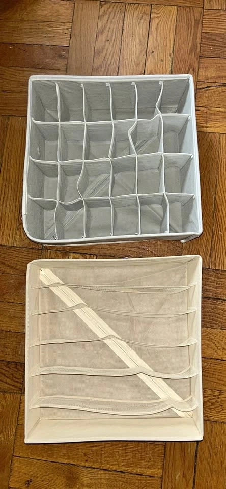 Get organized! You are getting two new fabric drawer organizers that can be used for socks, scarves, underwear, or other items. They unzip and fold up for easy storage. Measure approximately 11" x 12". Never used. Pick up on the upper west side of Manhattan.