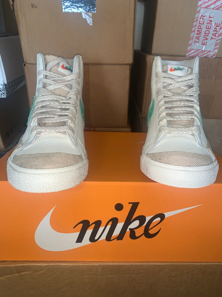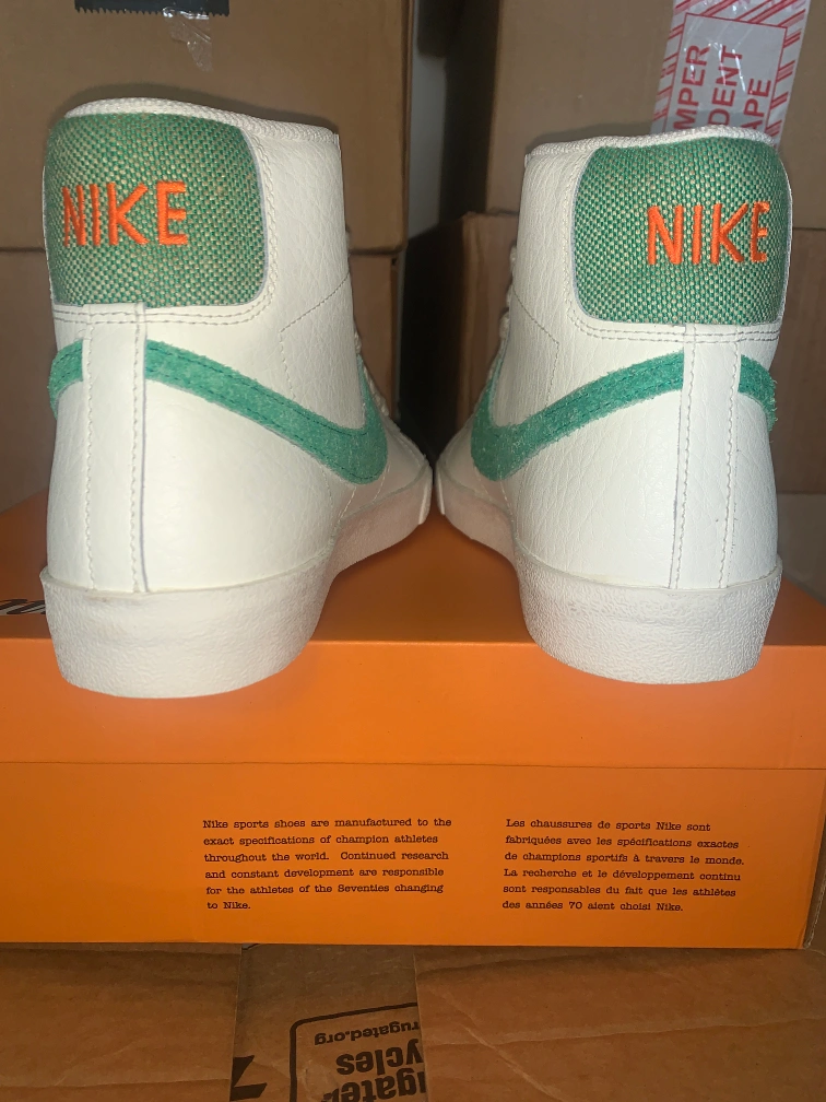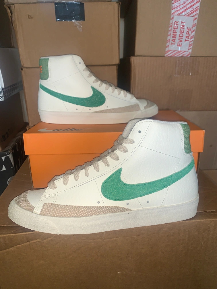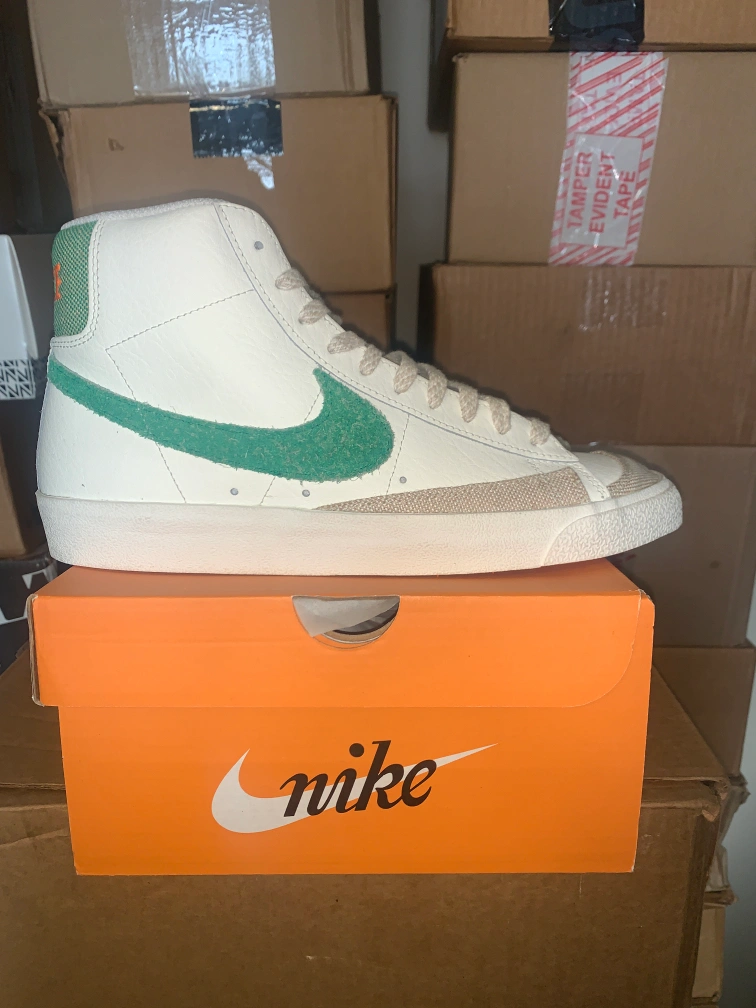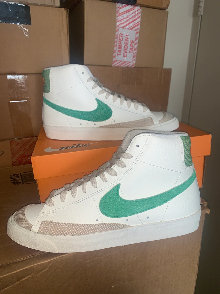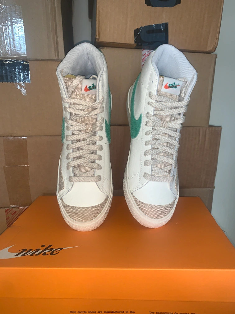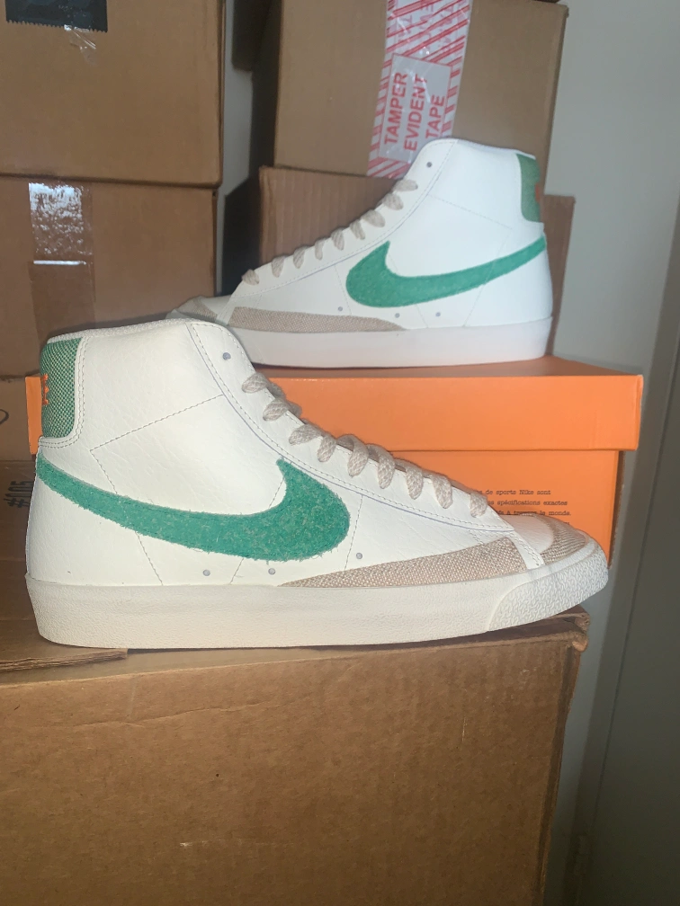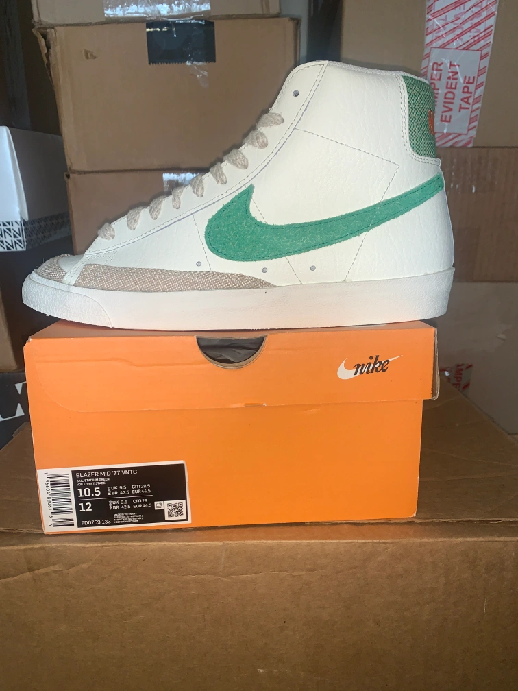 Selling a pair of Nike Blazer Mid '77 VNTG sneakers in white and green. These are in great condition and come with the original box. The size is Men's 10.5 (US). A classic look for any outfit!