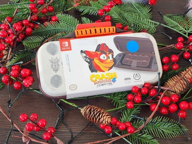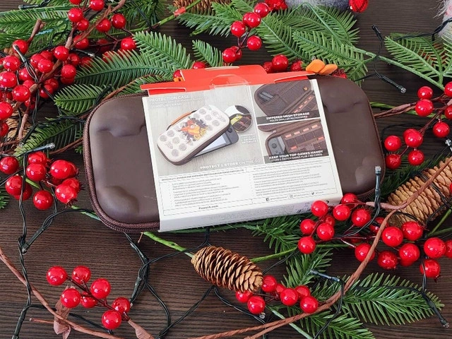 Sturdy outer shell with rubberized handle and durable dual zipper pulls. Molded interior with felt lining plus zippered mesh storage fits either system. Built-in padded screen-protector flap includes game storage for six game cards. Officially licensed gaming case for Nintendo Switch and Nintendo Switch Lite.