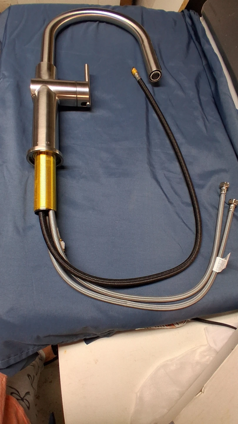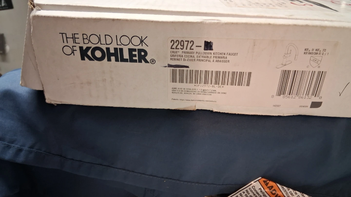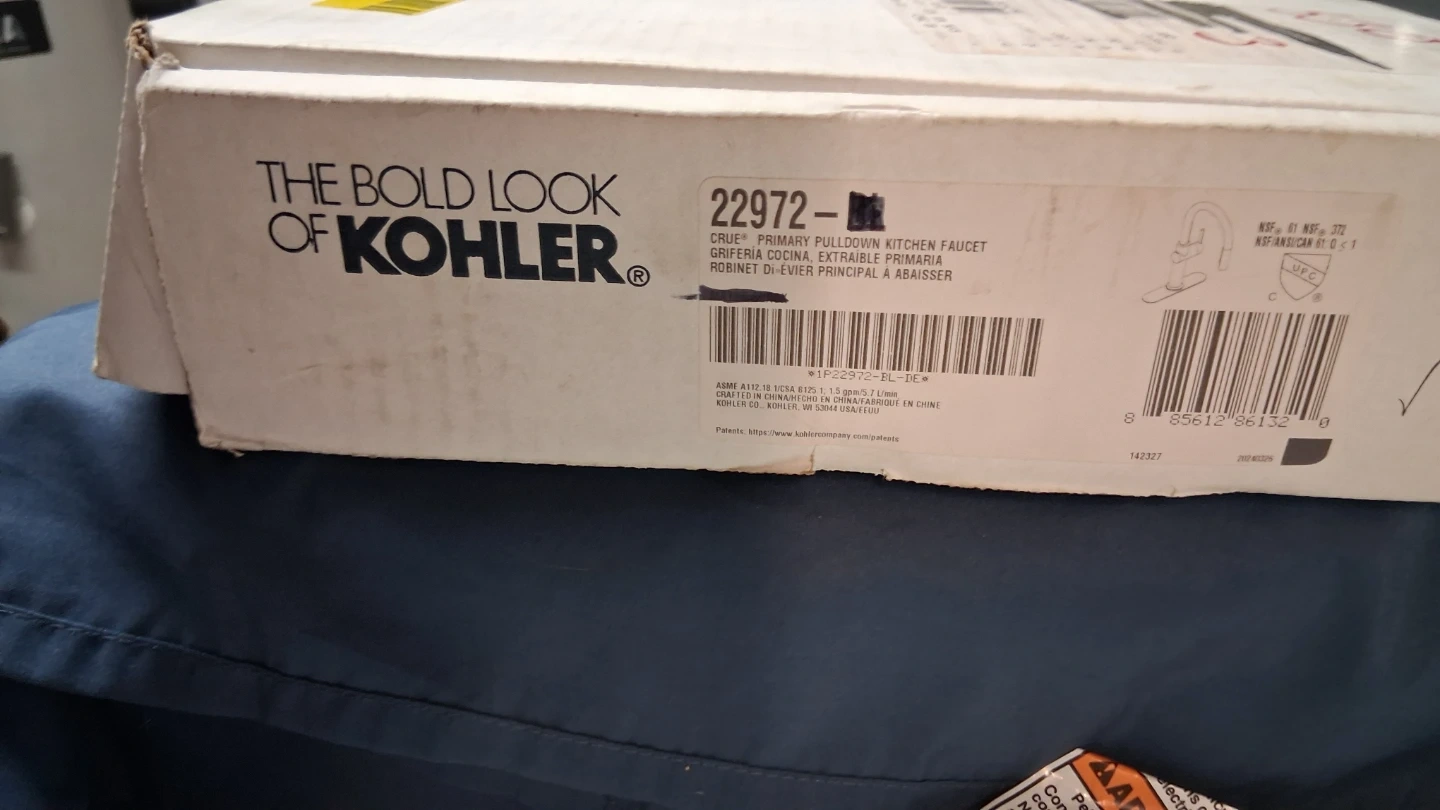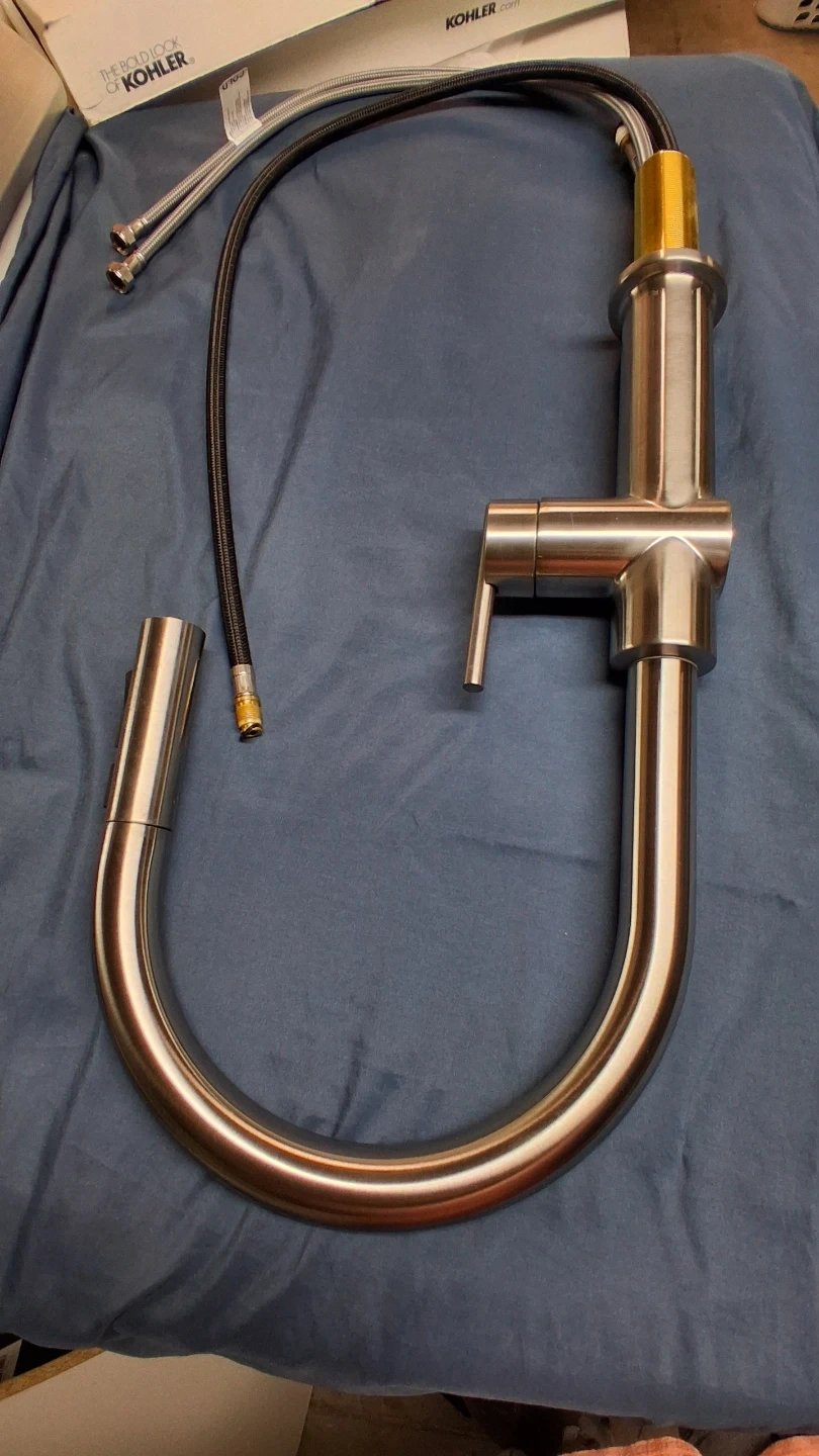 This is a new Kohler Cruet primary pulldown kitchen faucet. It's made of stainless steel and brass. Includes the faucet and hoses.