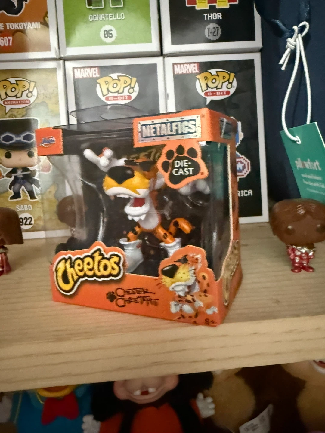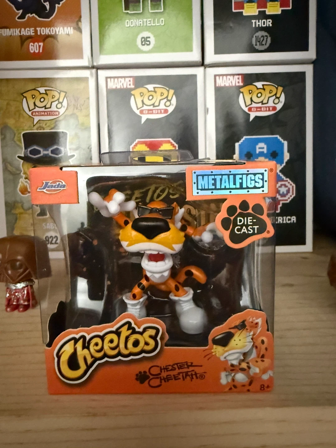 This is a Chester Cheetah Metalfigs Die-Cast figure from Cheetos. It's in its original packaging. This collectible is rated for ages 8 and up.