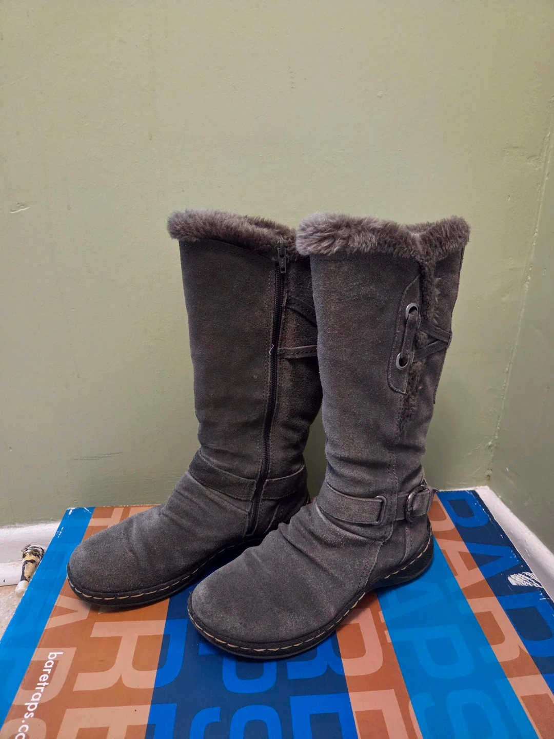 Baretraps women's boots in a stylish grey suede. They feature a cozy faux fur lining for warmth. Side zippers for easy on and off. These boots are perfect for keeping your feet toasty during colder weather!