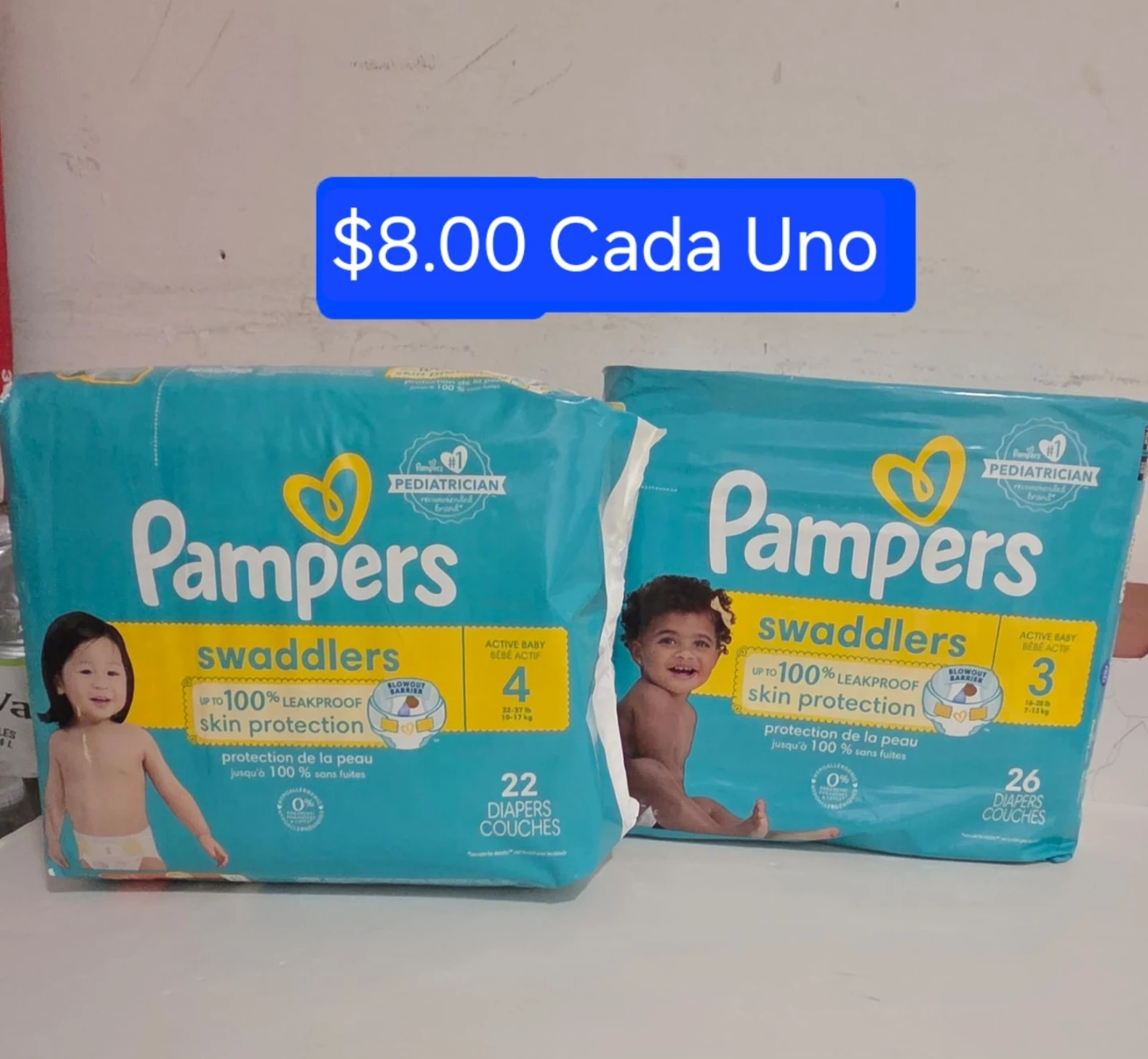 Two packs of Pampers Swaddlers diapers are available. One pack is size 3 and contains 26 diapers. The other pack is size 4 and contains 22 diapers. Both offer up to 100% leakproof skin protection.