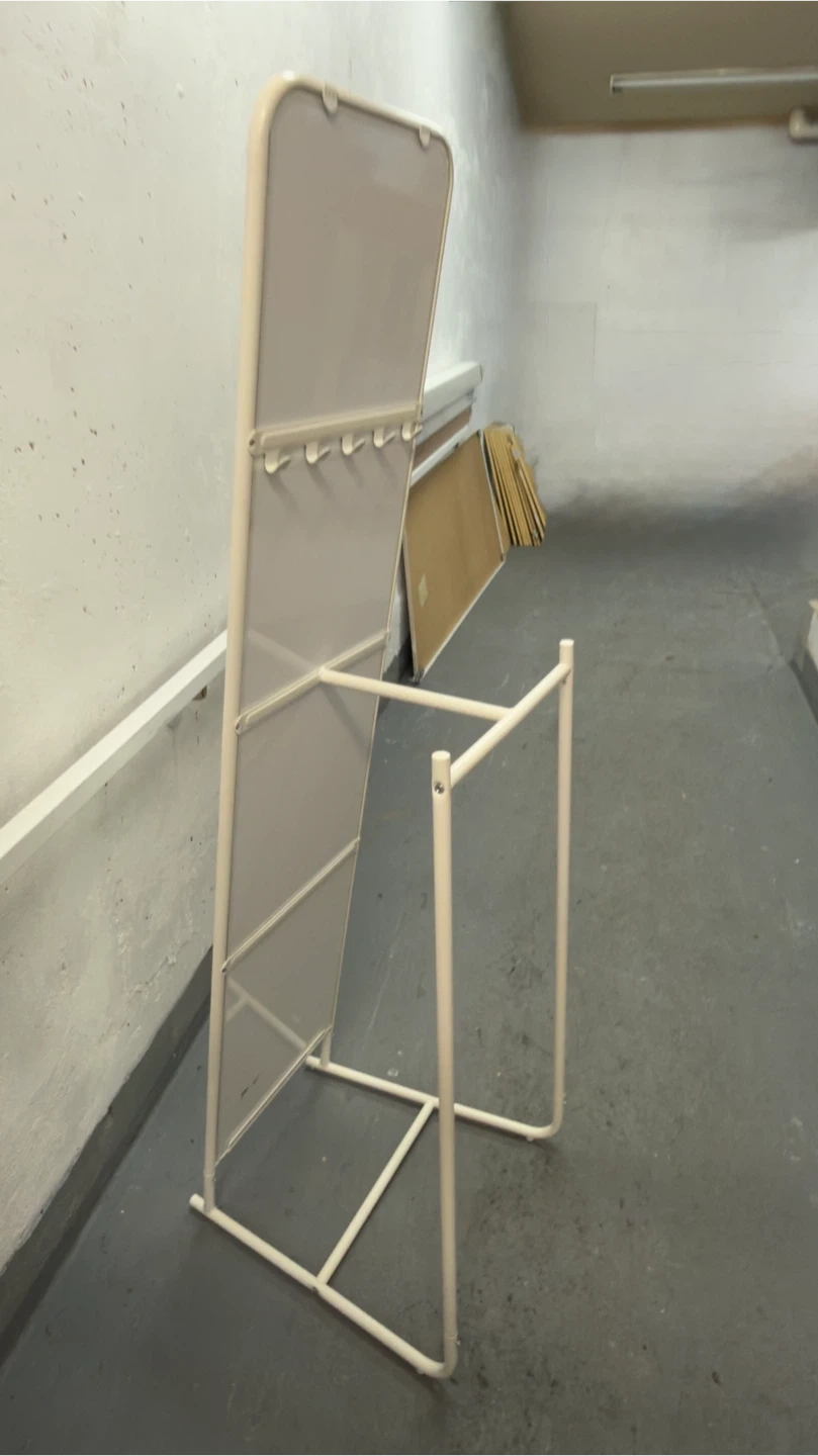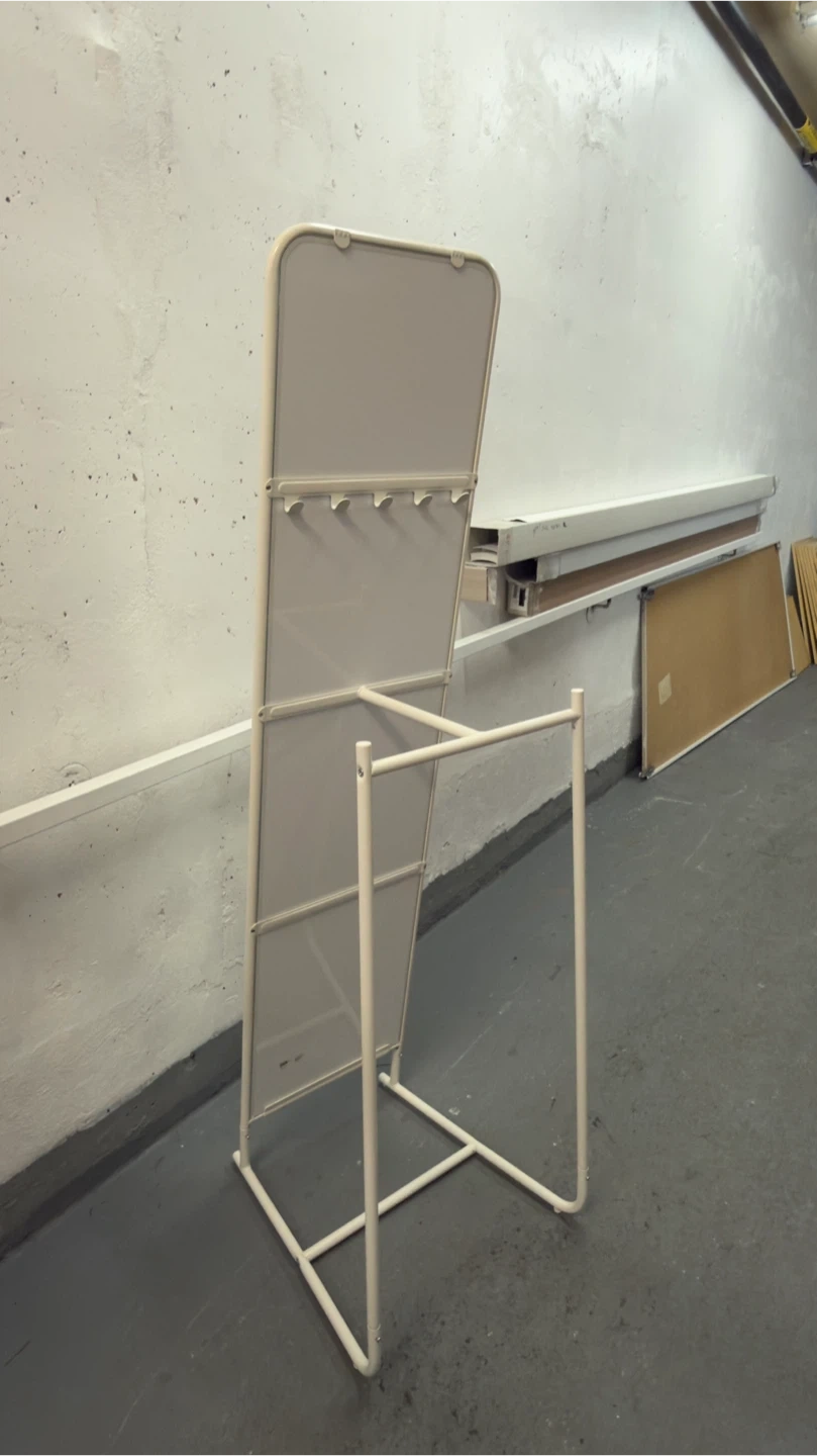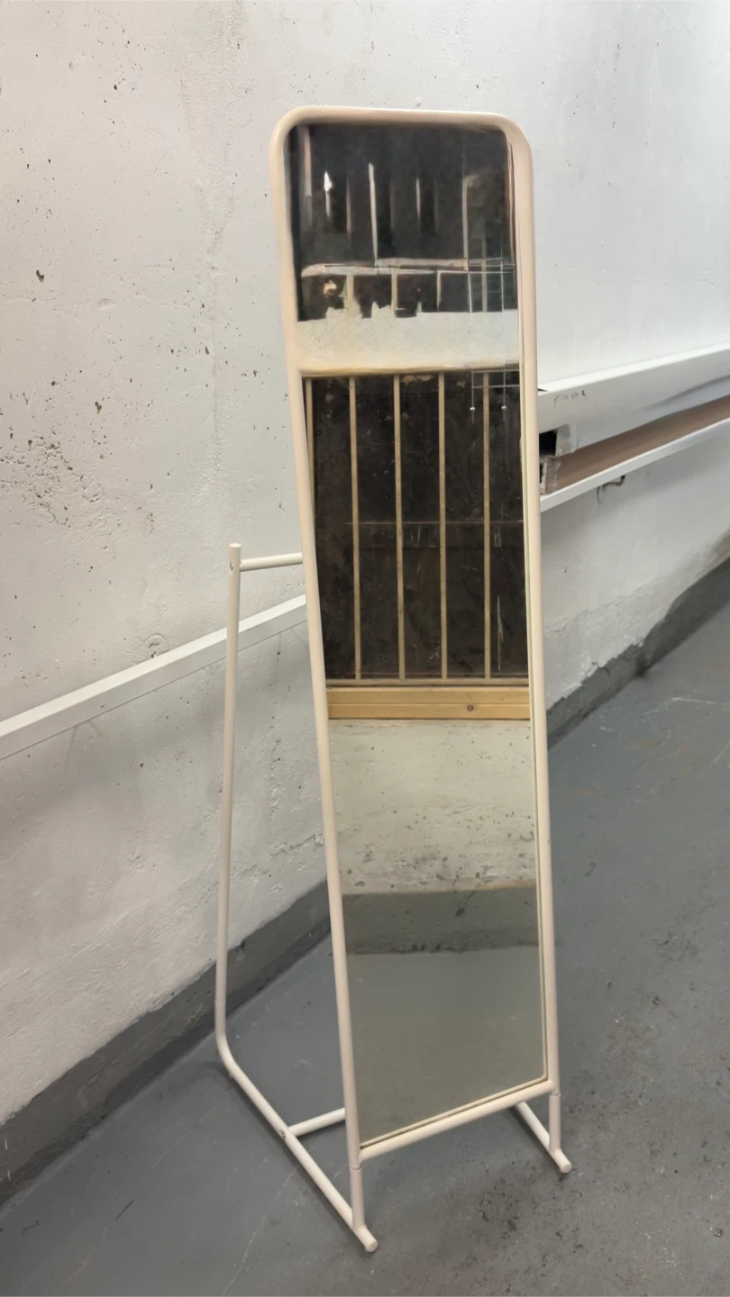 A full-length mirror in a cream colour. It has a built-in rack at the back for hanging clothes or accessories. The mirror is tall and stands on a sturdy base.
