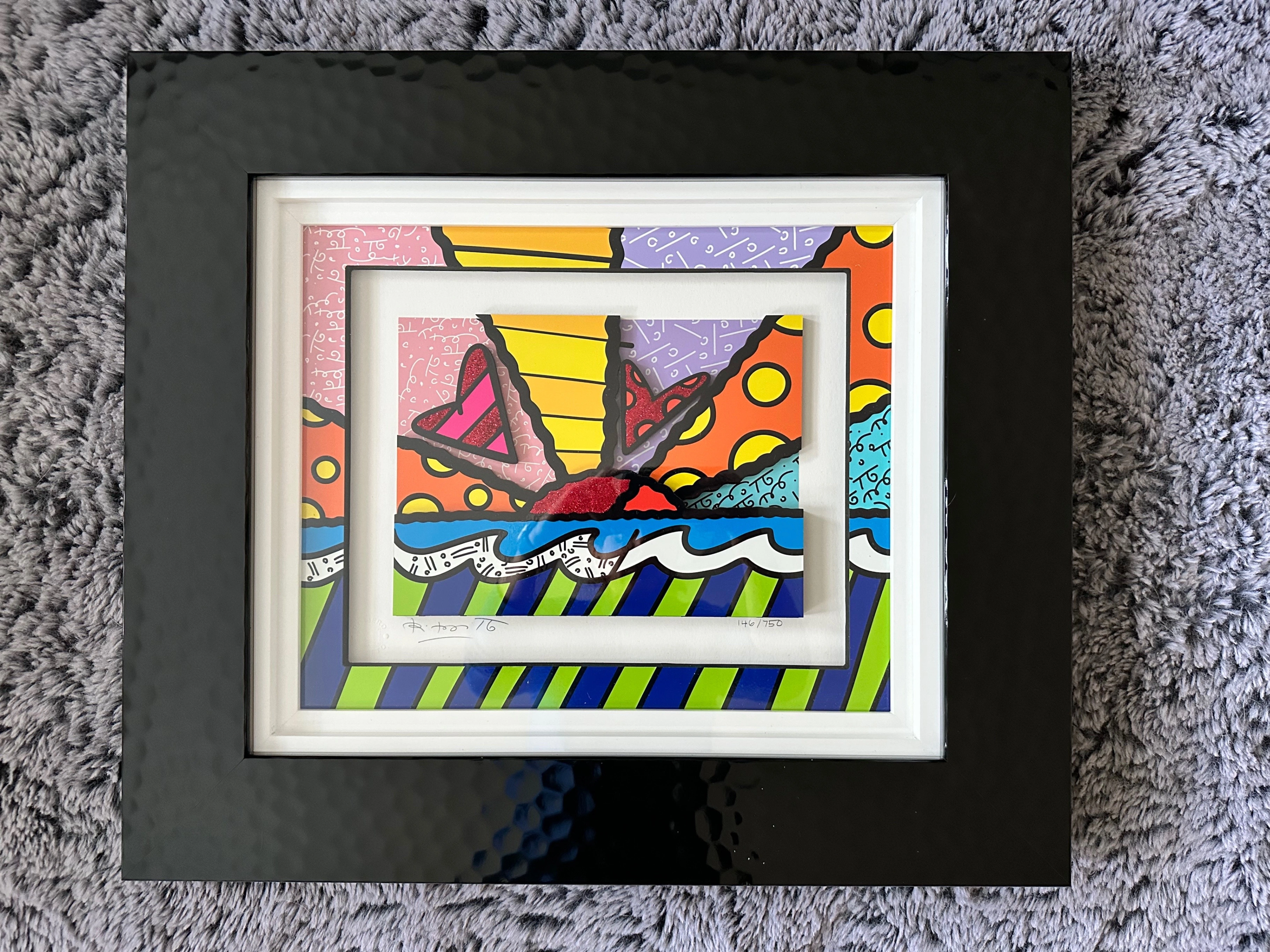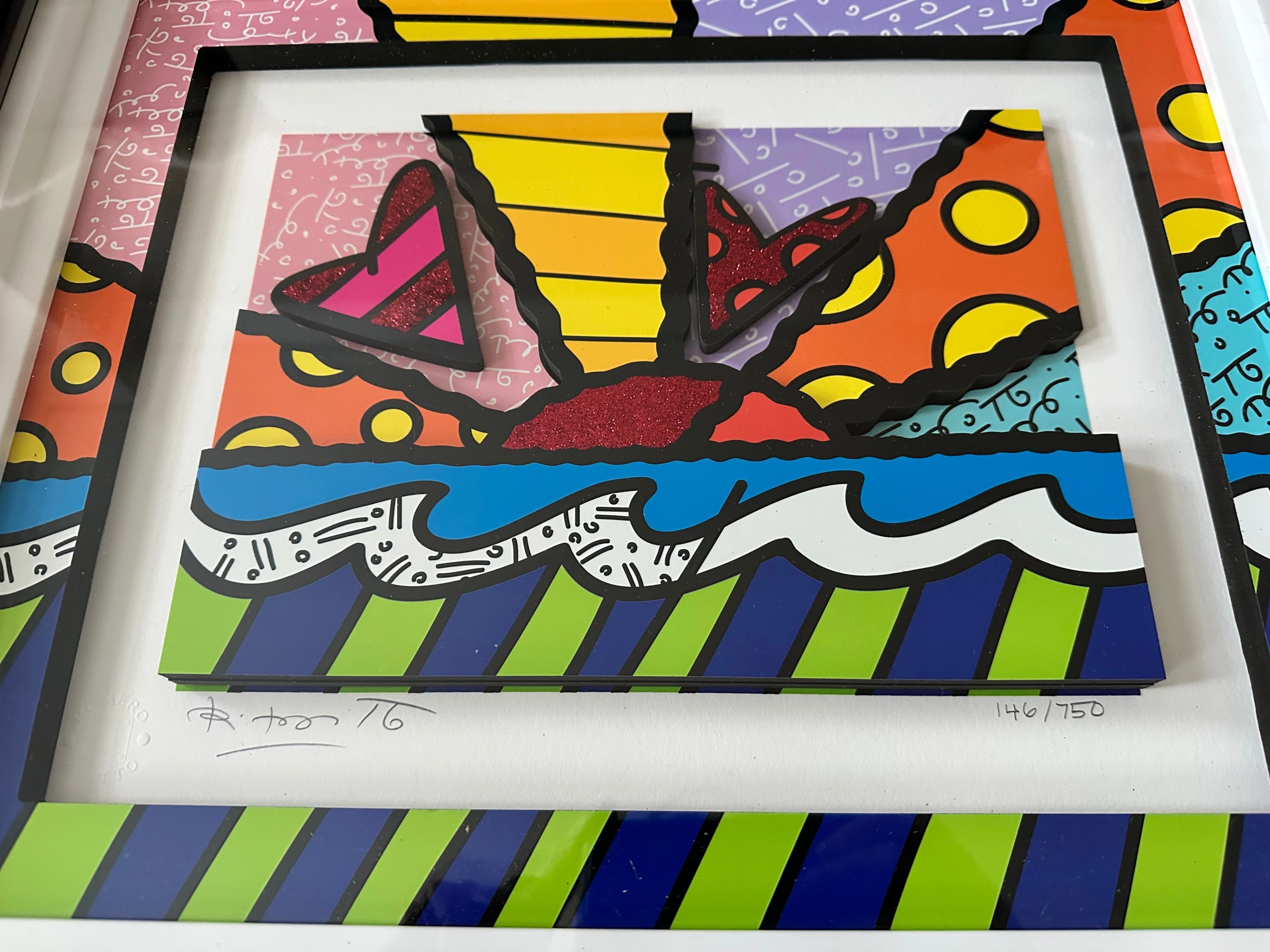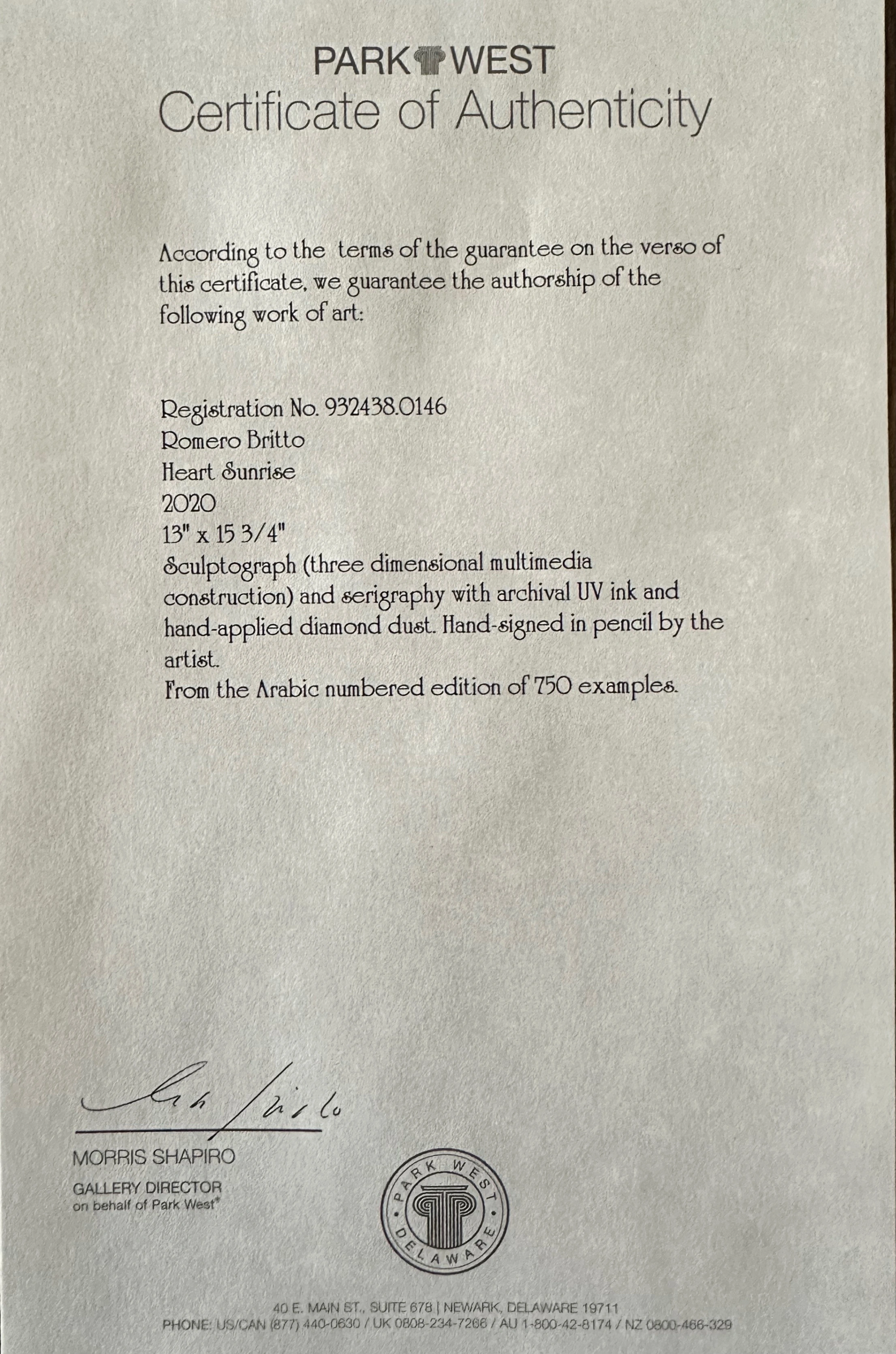 Sculptograph, 3D multimedia construction with serigraphy, archival UV ink and hand-applied diamond dust, signed, numbered 146/750, professionally framed with Certificate of Authenticity by Park West. Vibrant heart sunrise design, excellent condition and ready to hang. Appraised value in 2022 is $2,700. This piece comes framed with glass and ready to hang.