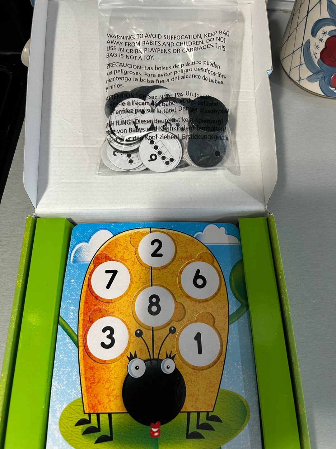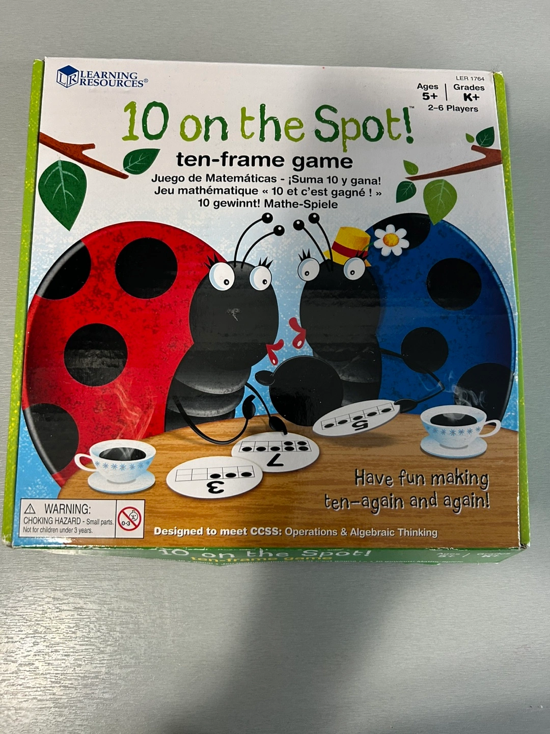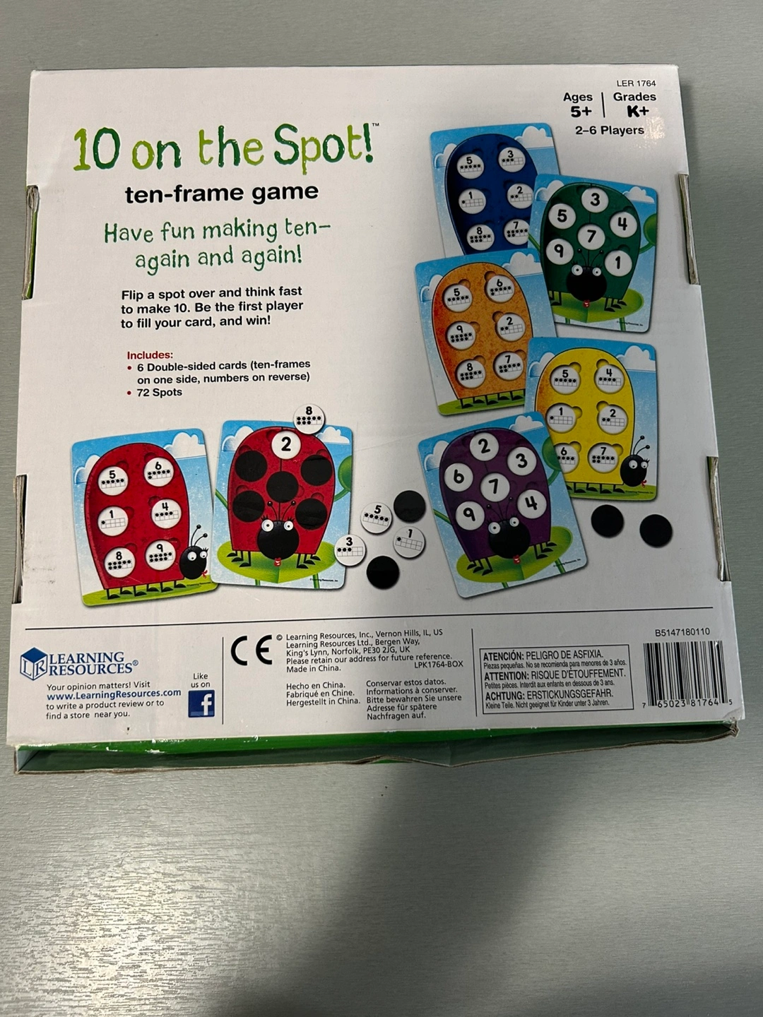 Fun ten-frame game. Ages 5+. Includes 6 double-sided cards, ten-frames and 72 spots. Make ten again and again!