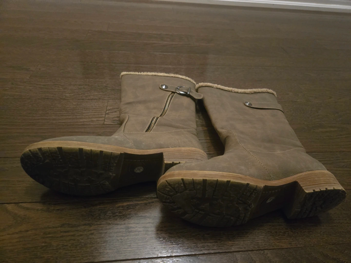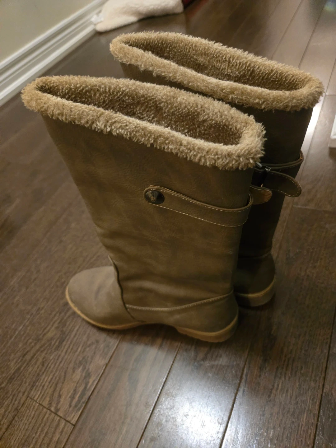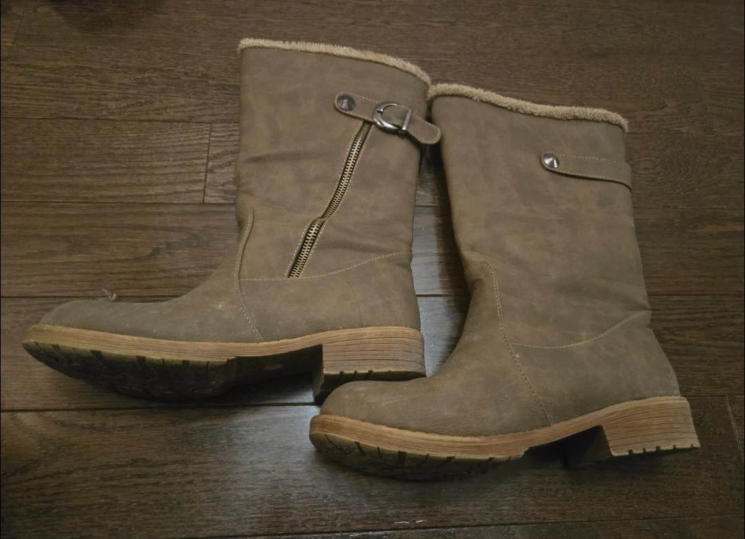Cozy faux suede boots lined with soft fur for warmth. They feature a side zipper and buckle detail. Perfect for keeping your feet toasty on chilly days! Receive as a gift and worn twice but too big.
