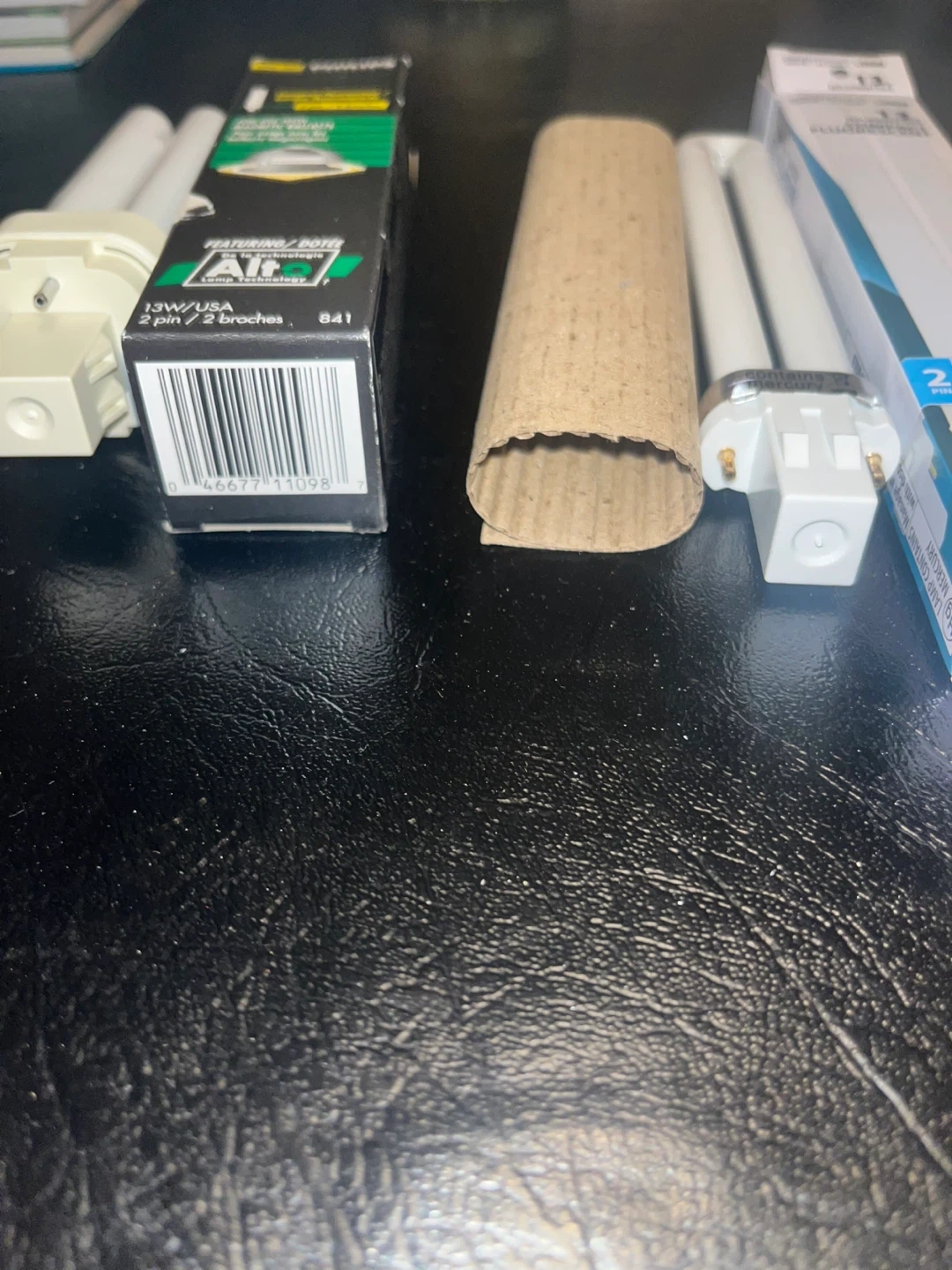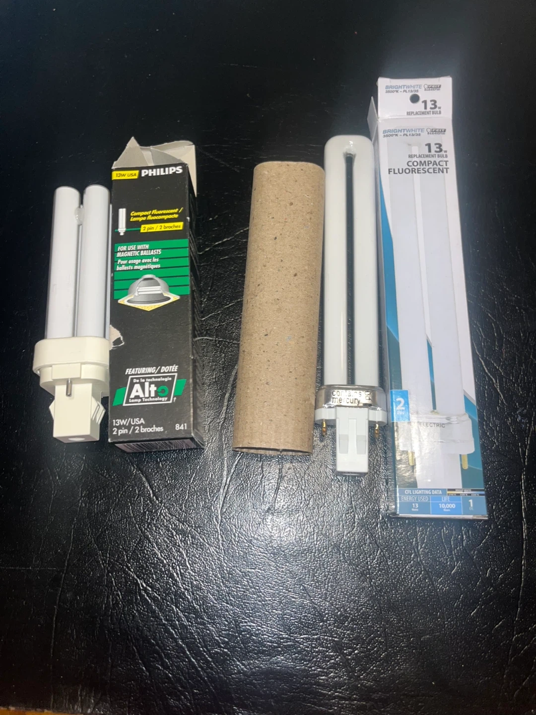 Two 13W/USA compact fluorescent light bulbs. One Philips bulb is 2-pin, and the other is a GE bulb that's also 2-pin. Both are designed for use with magnetic ballasts. They're great for providing bright, energy-efficient lighting.