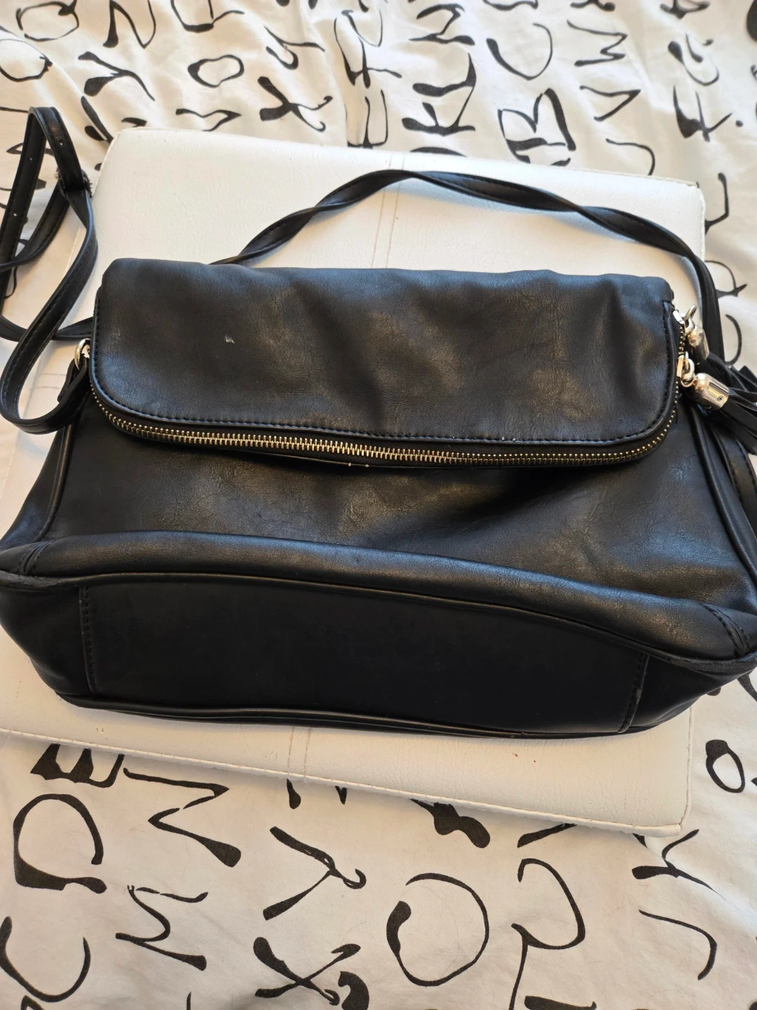 This Madden Girl crossbody bag is perfect for everyday use! It's black and has a zipper closure. The interior is lined with a stylish pattern. It's in great condition and ready for a new owner