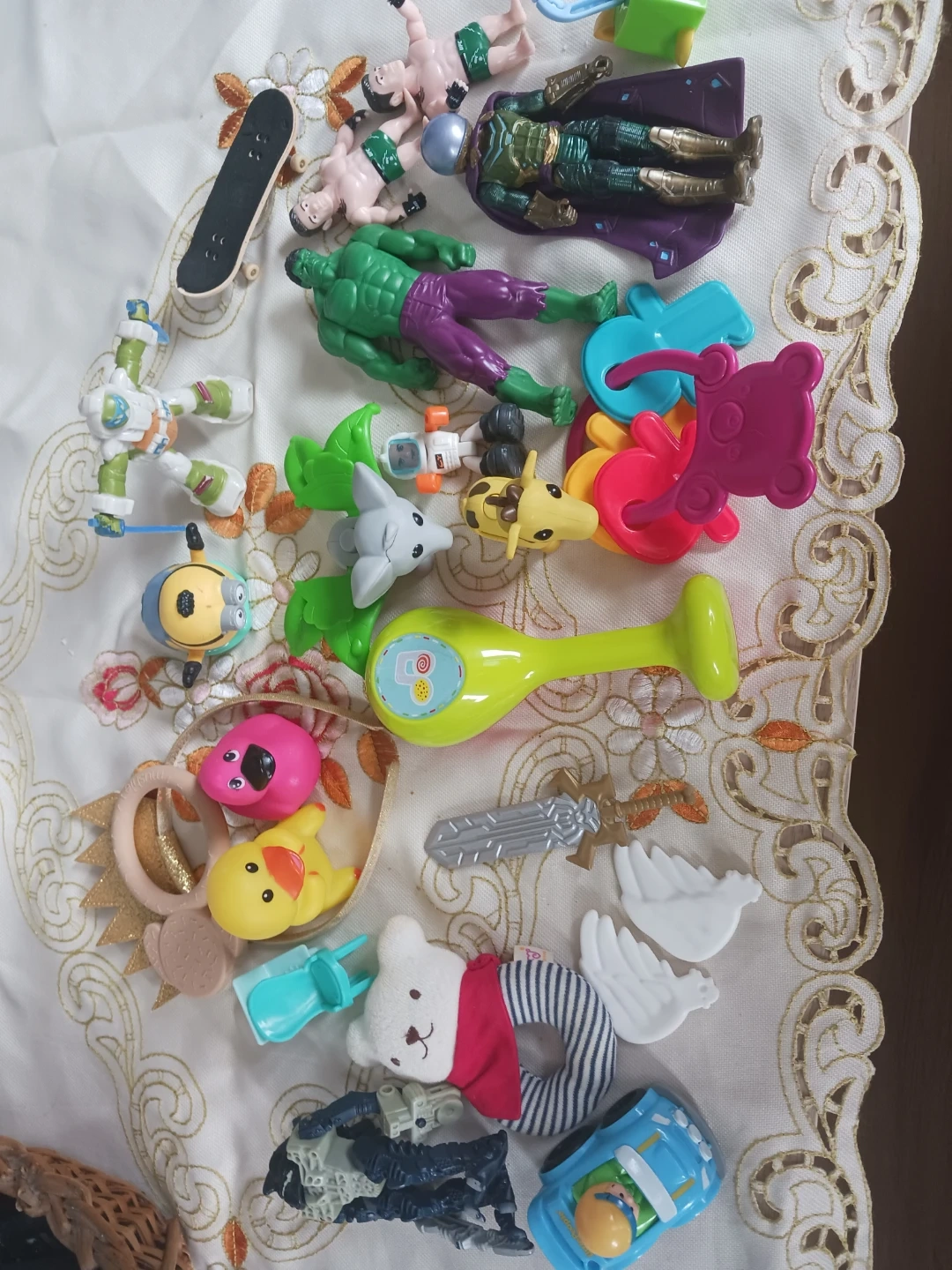 A collection of various small toys, including action figures, animals, and mini vehicles. Items like a skateboard, a plush-like bear, and other assorted play accessories are also included. These are great for imaginative play and building a toy collection!