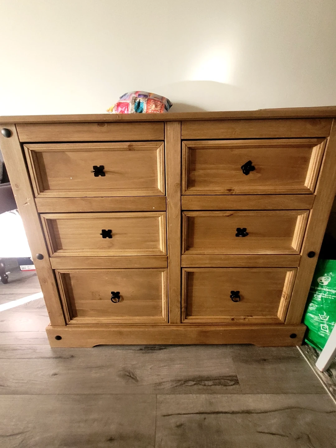 Here's a lovely wooden dresser with six drawers. It's perfect for adding some extra storage space to your bedroom or any other room in the house. The dresser is in good condition and ready for a new home!