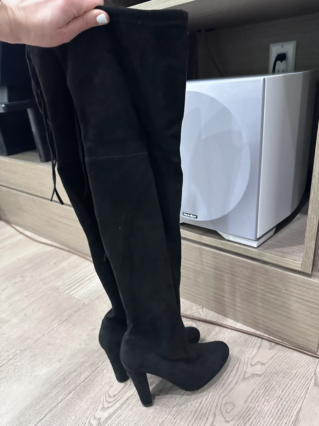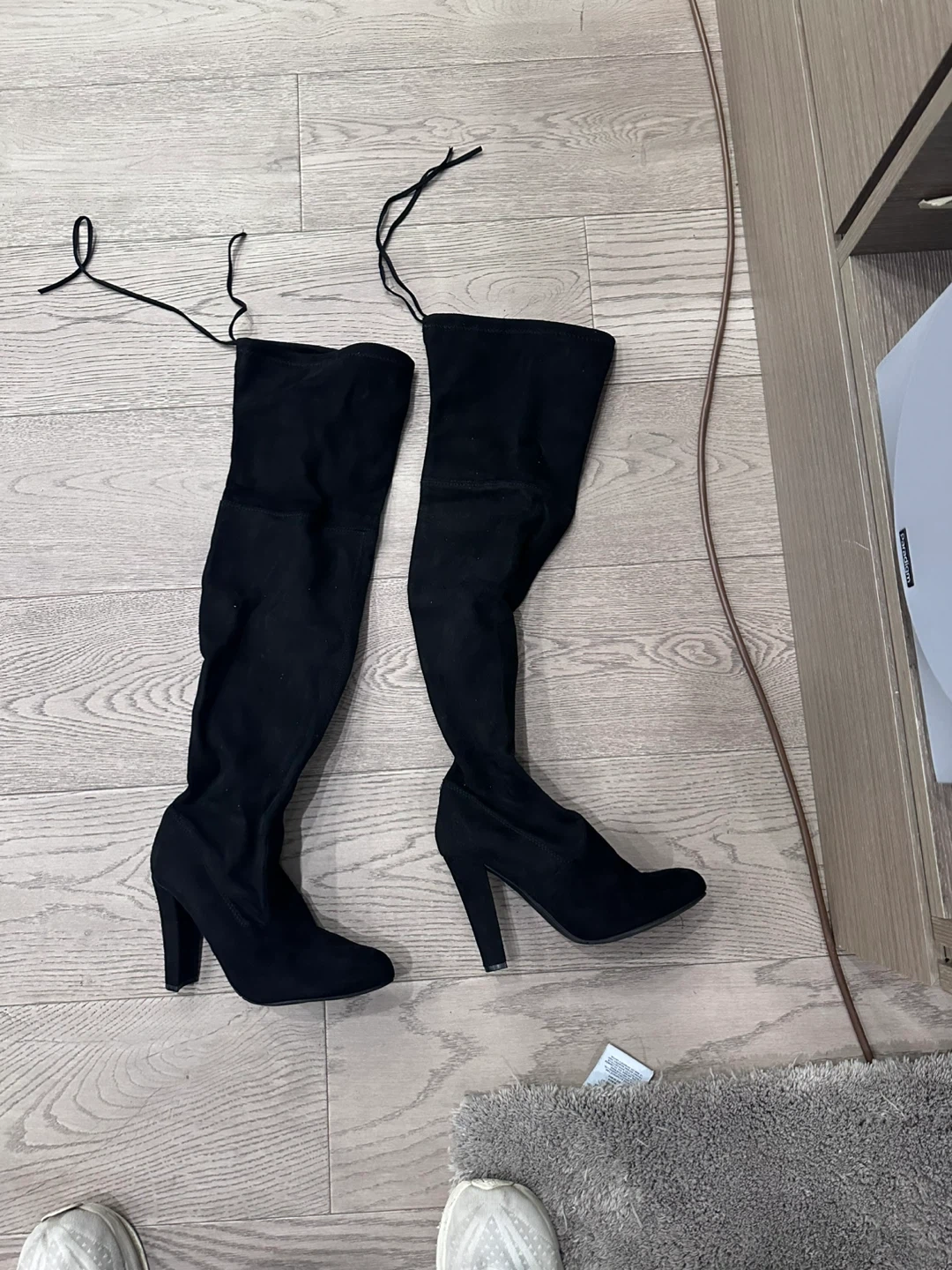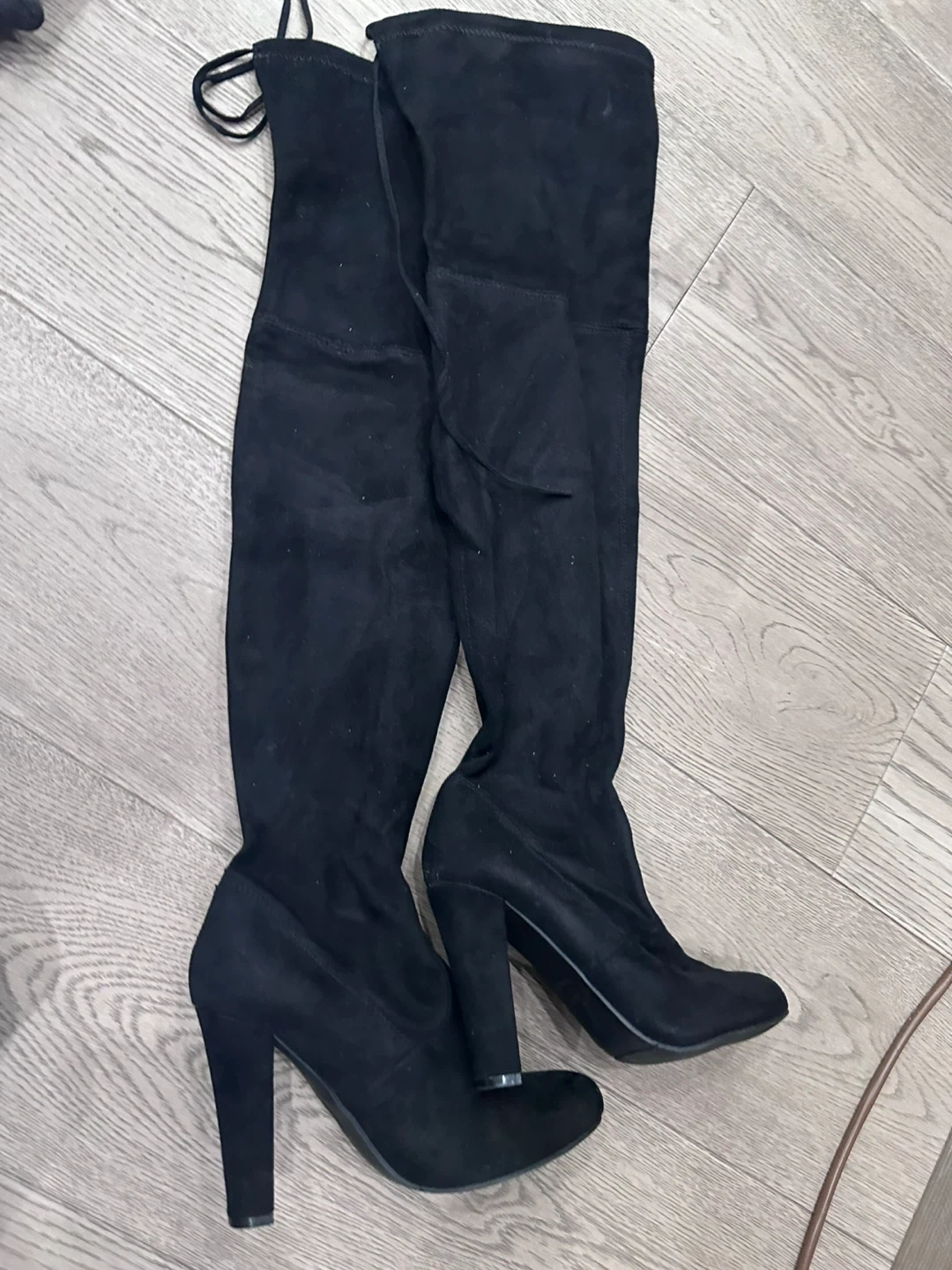 These are stylish black over-the-knee boots with a comfortable heel. They feature a tie closure at the top for an adjustable fit. The material appears to be a soft suede-like fabric.