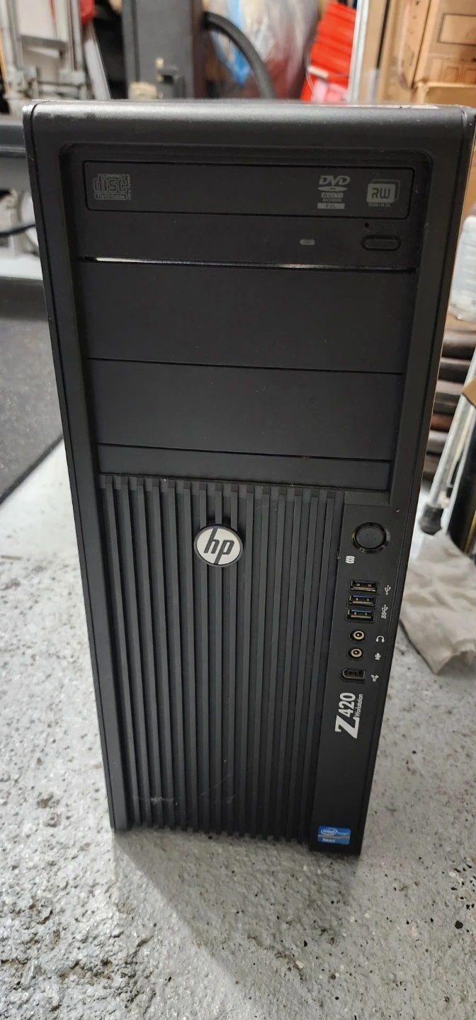 This is an HP Z420 Workstation computer. It features a DVD-RW drive and multiple USB ports on the front panel. This workstation is suitable for demanding tasks.