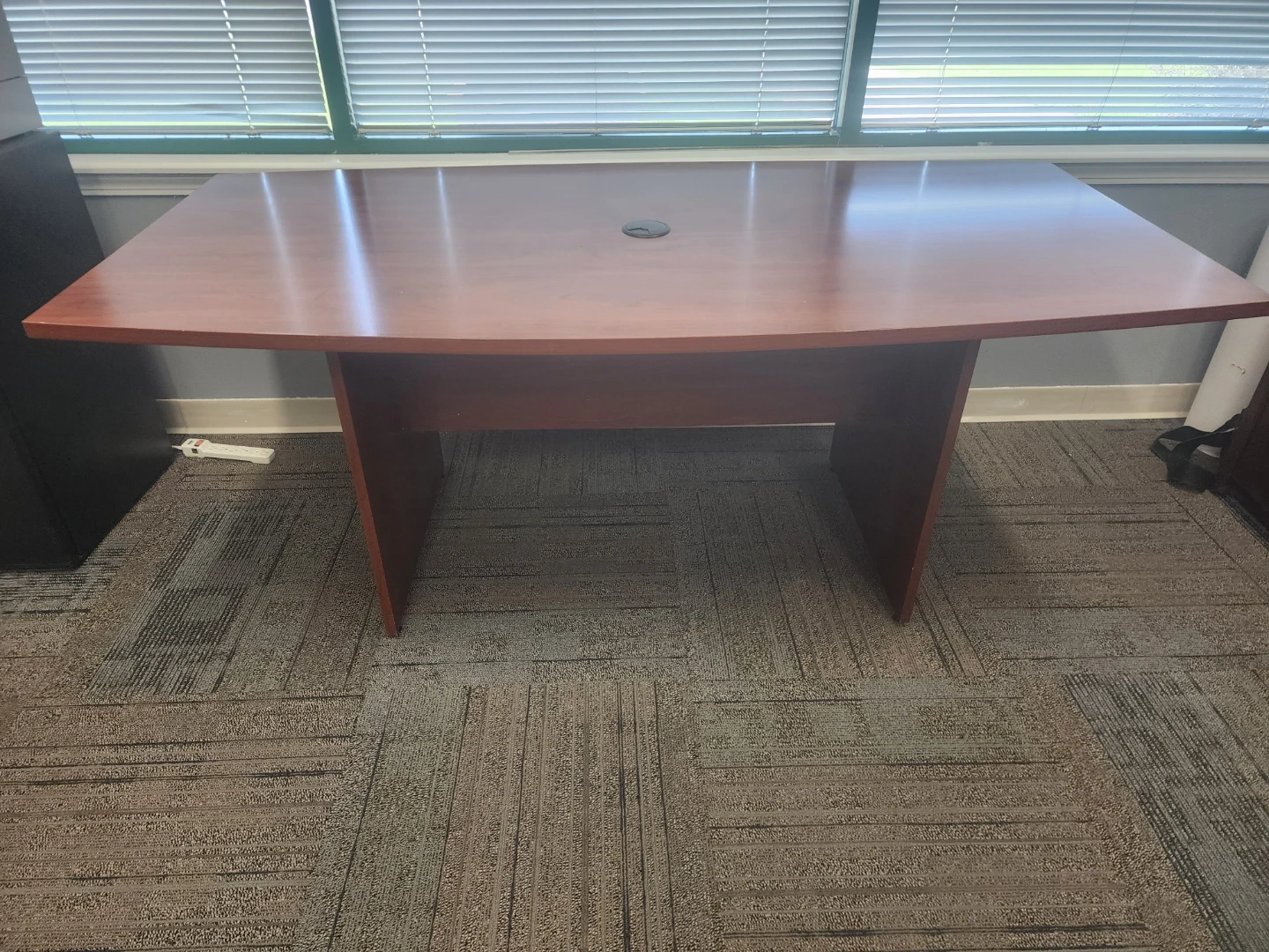 This conference table features a rich cherry finish and a curved front edge. It has a central grommet for cable management. The table's design makes it suitable for executive offices or meeting rooms.