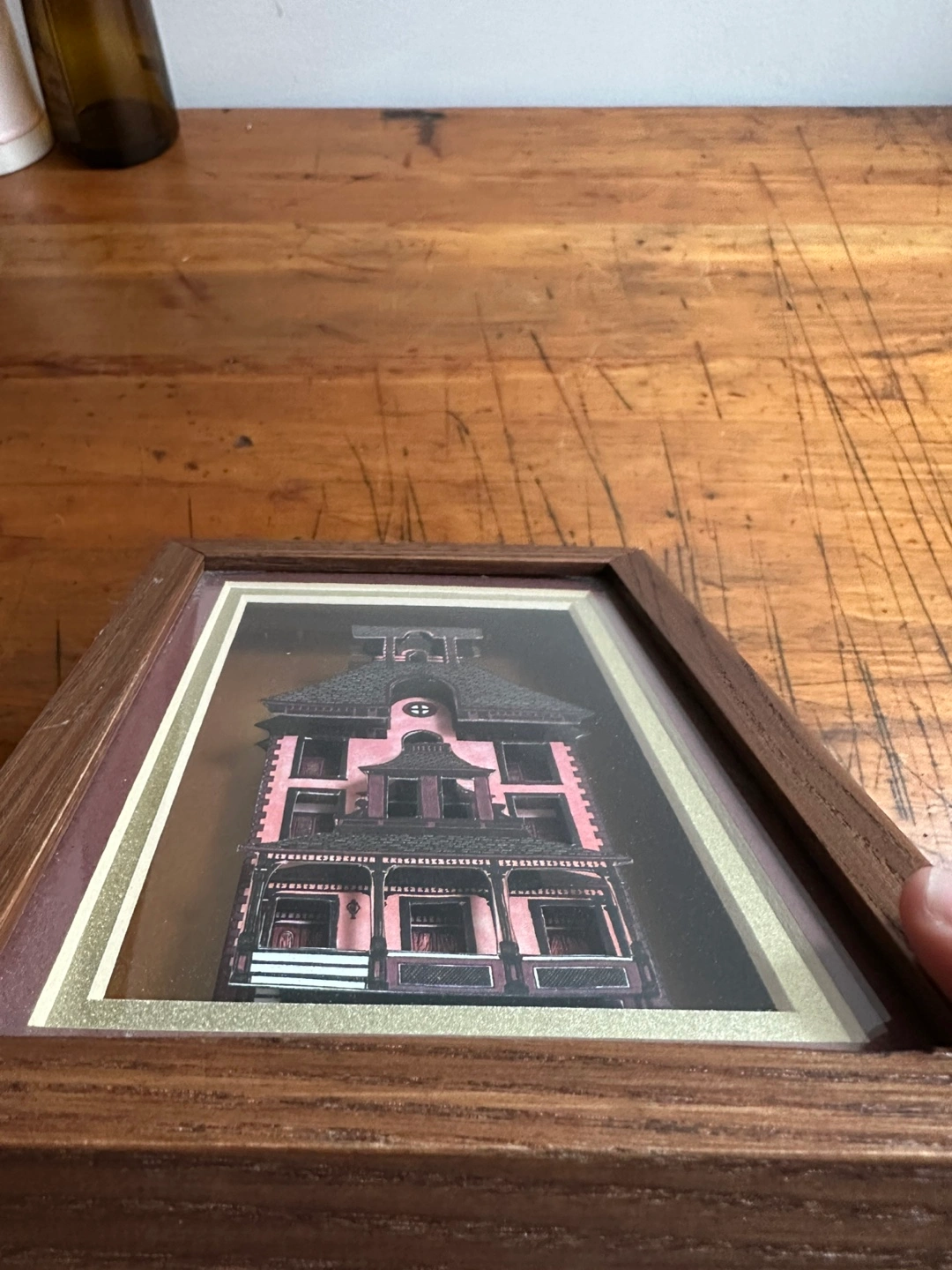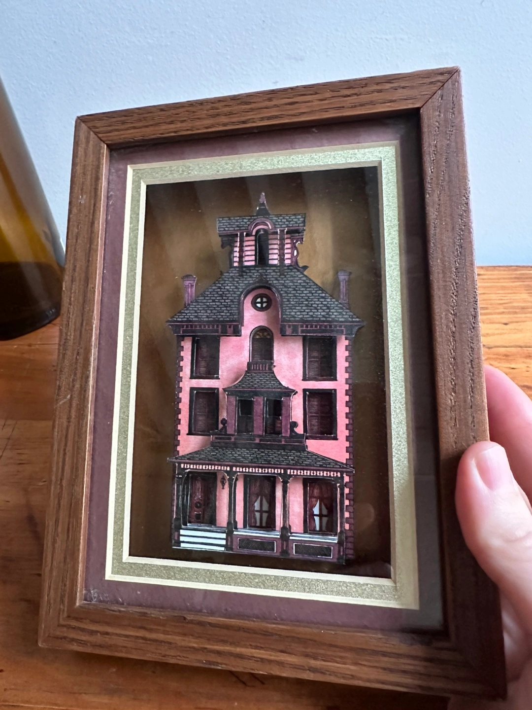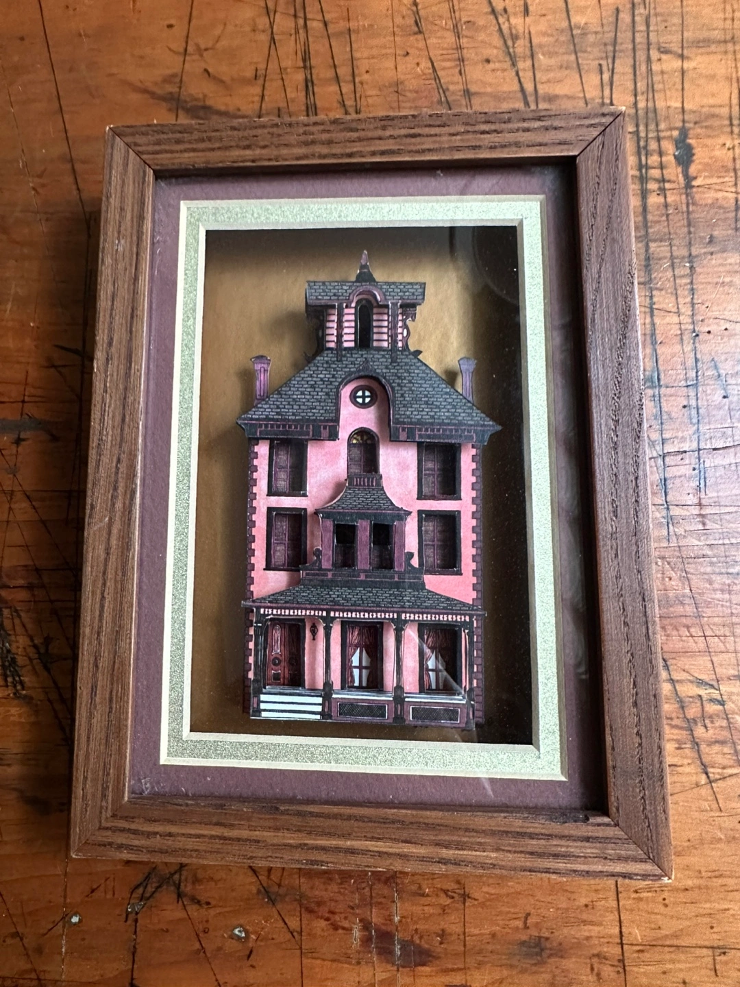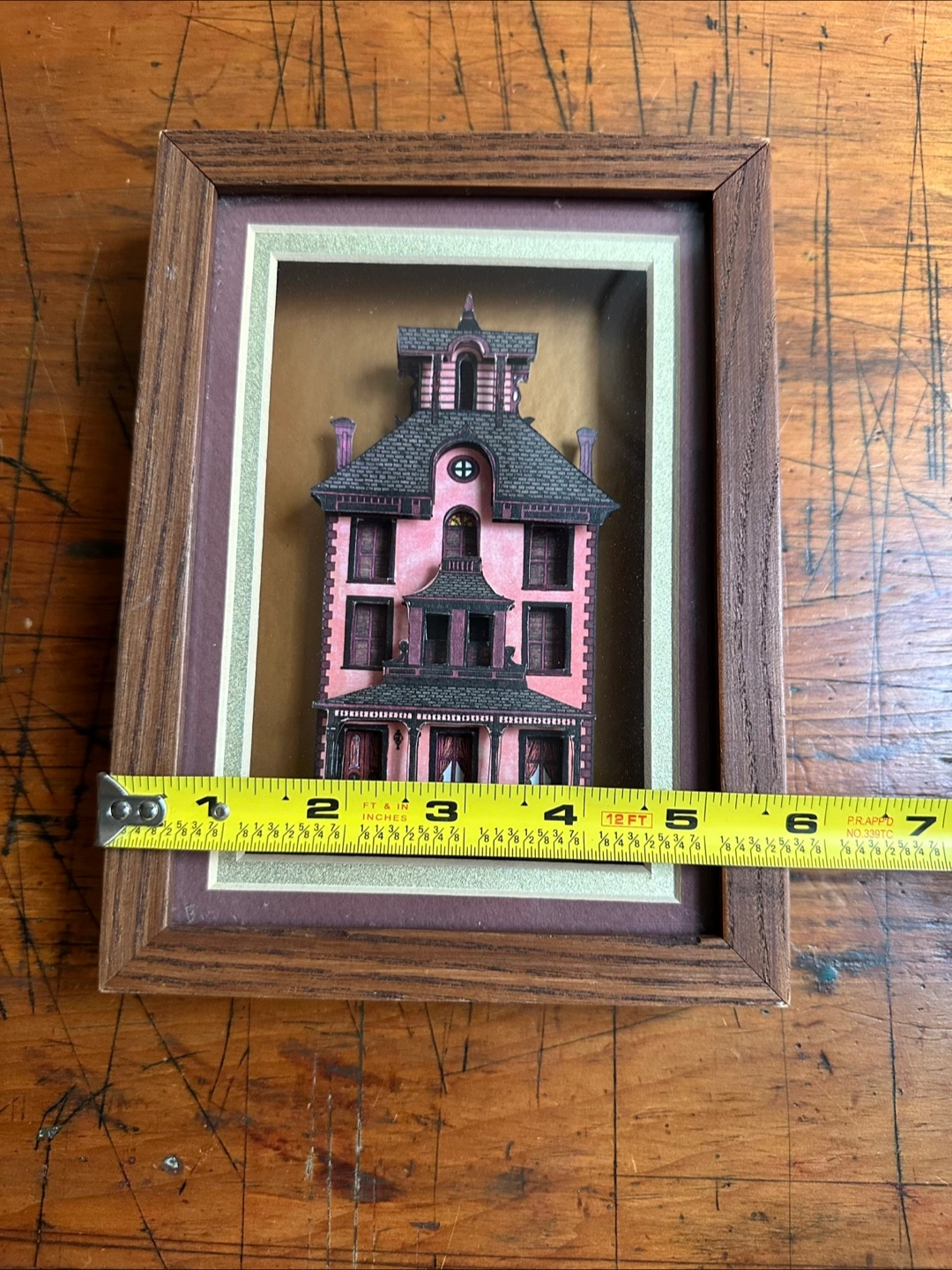A unique 3D art shadow box featuring a pink Victorian home design by artist Chris Hobbs. Handmade with a combination of wood and paper materials, this framed artwork showcases intricate details and craftsmanship. The pink Victorian theme and 3D style add a whimsical and artistic touch to any space, making it a delightful addition to any art collection.