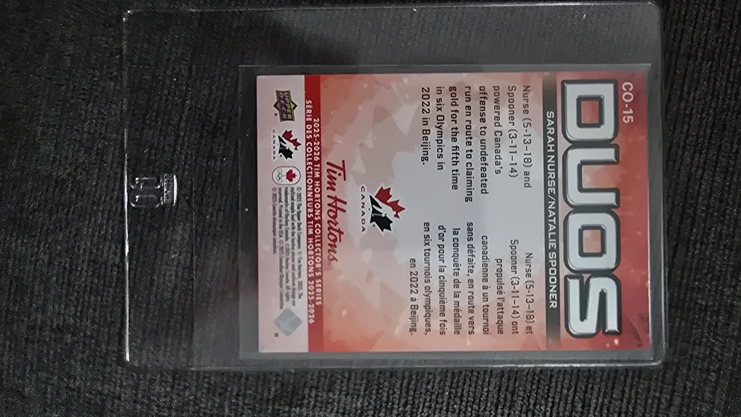 This is a 2022 Upper Deck Tim Hortons hockey card featuring Sarah Nurse and Natalie Spooner. It commemorates their gold medal win with the Canadian Women's National Hockey Team at the Beijing Olympics. The card is a DUOS collectible.