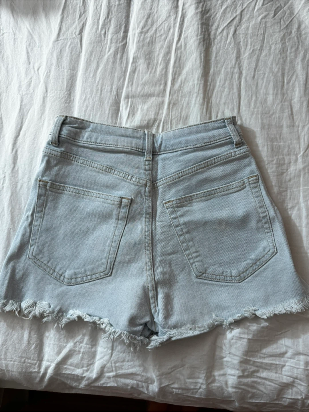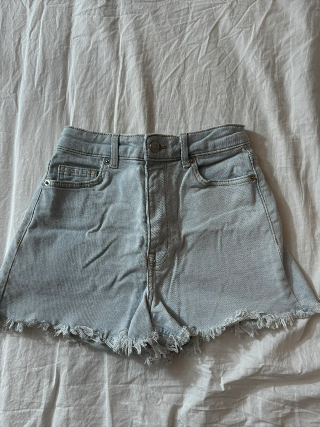 Light wash denim shorts with a frayed hem. These shorts are made from a cotton blend. They feature a classic five-pocket design.