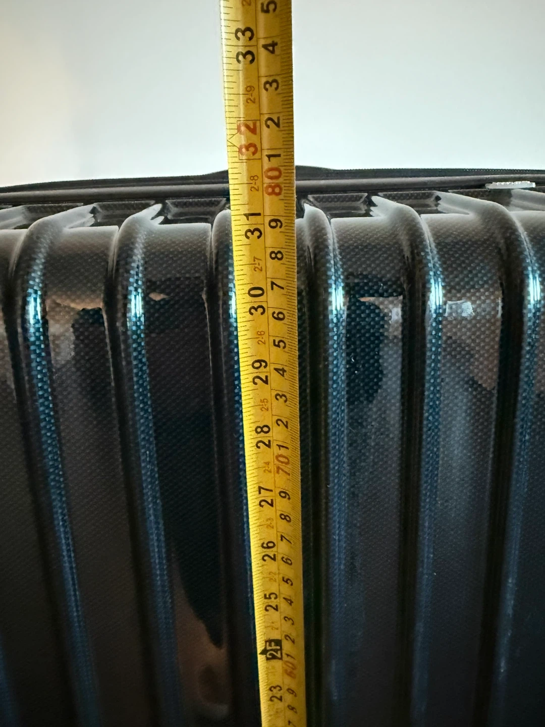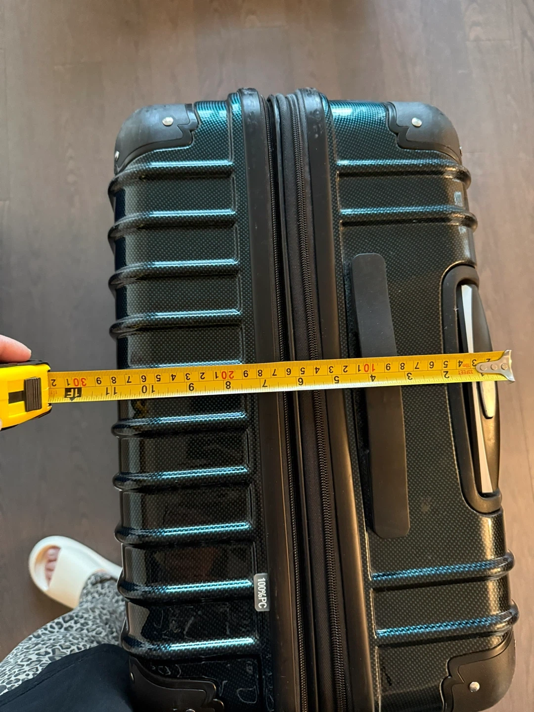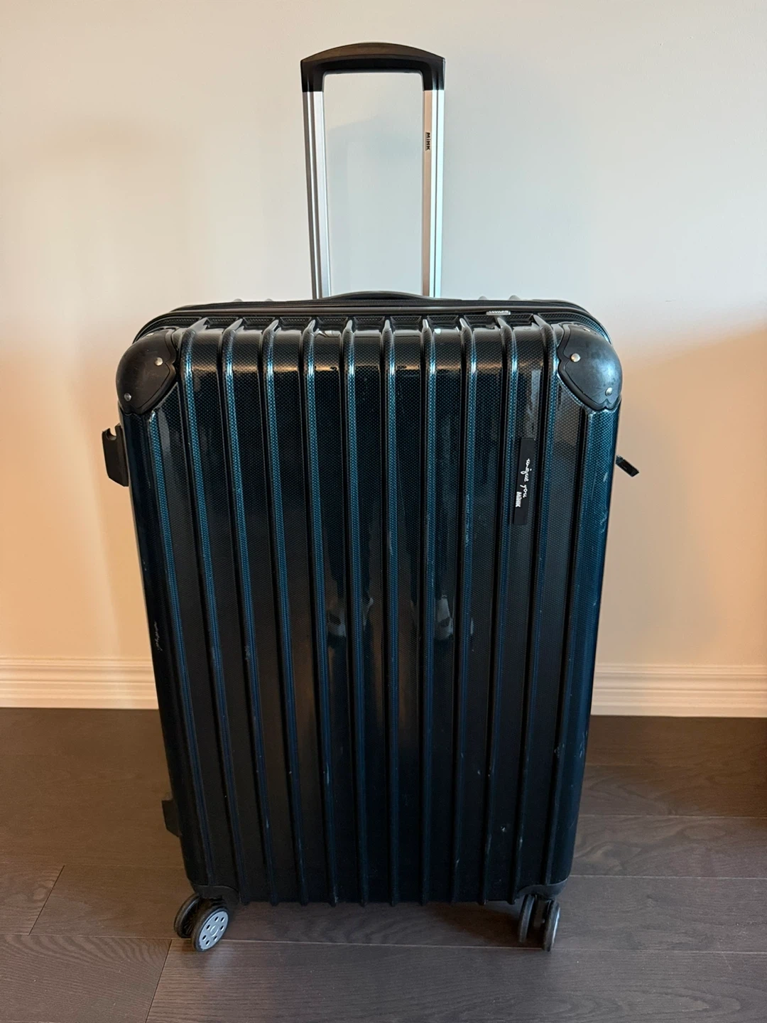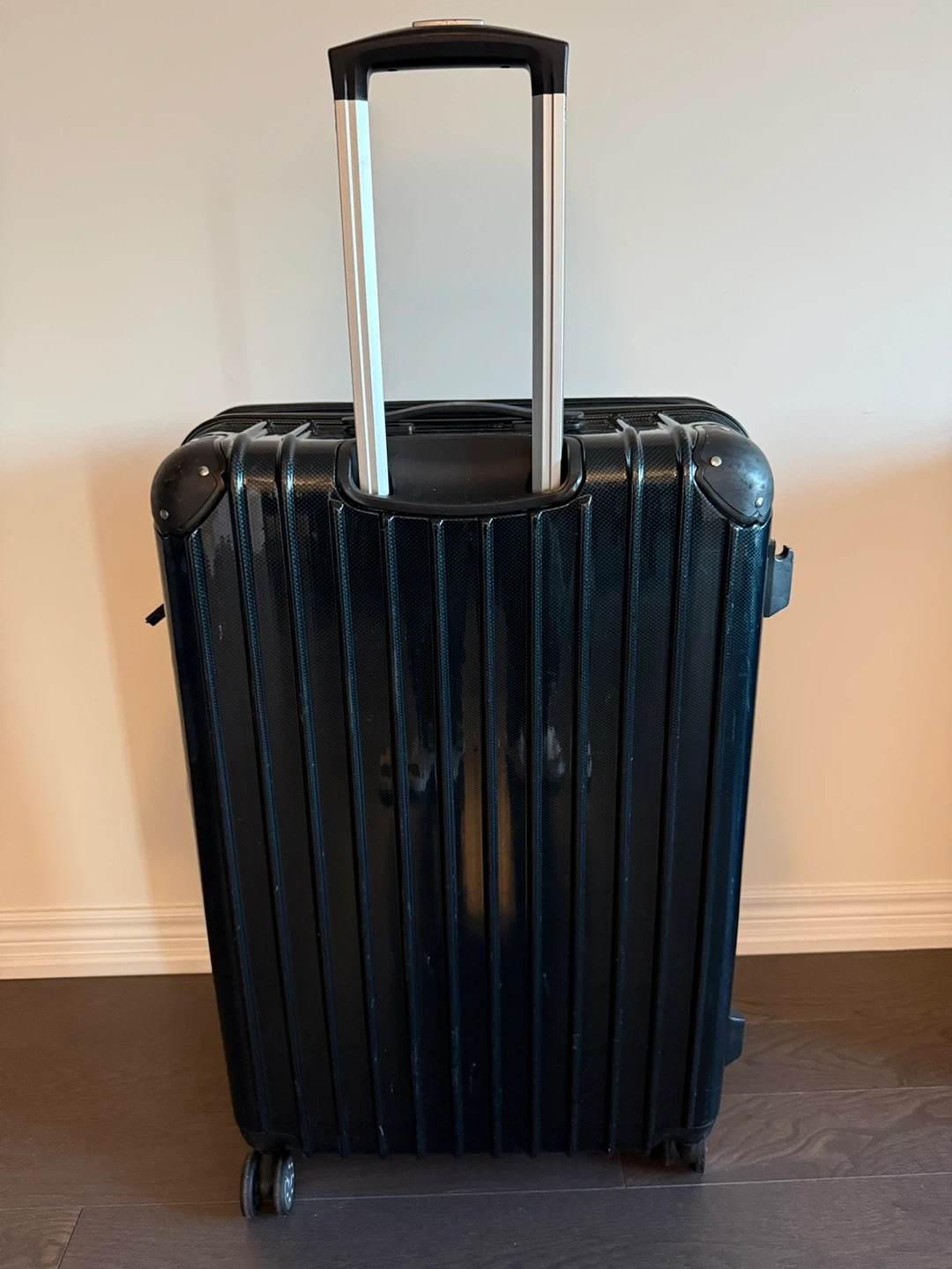 Black hardside spinner suitcase. Durable plastic suitcase in approximately