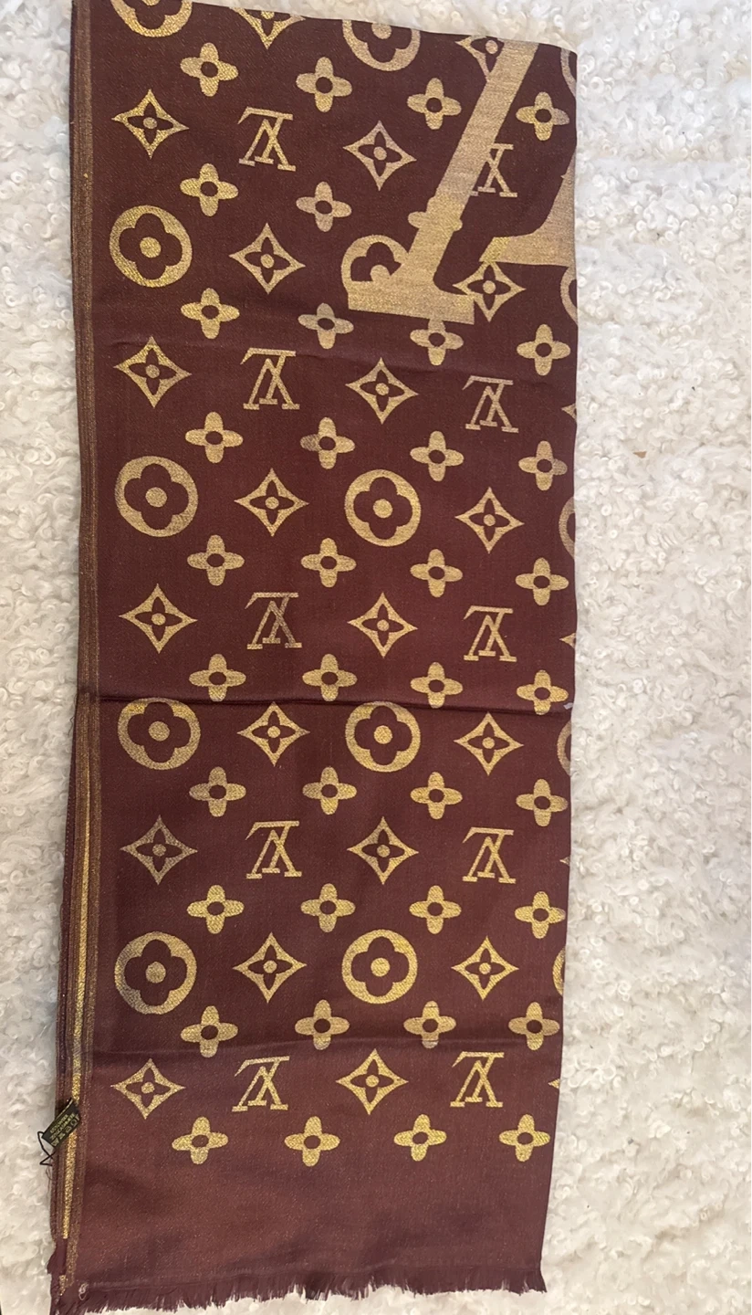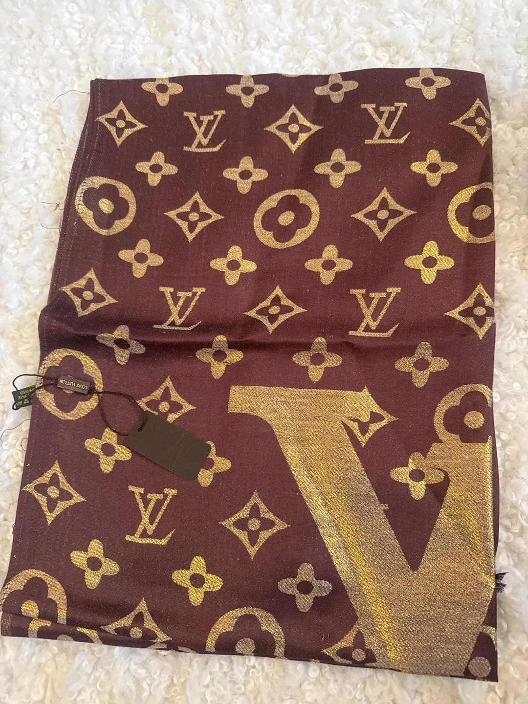 A Louis Vuitton scarf featuring the iconic monogram print in gold on a burgundy background. It's a stylish accessory for any outfit. Made from a soft material, it's perfect for adding a touch of luxury and warmth.