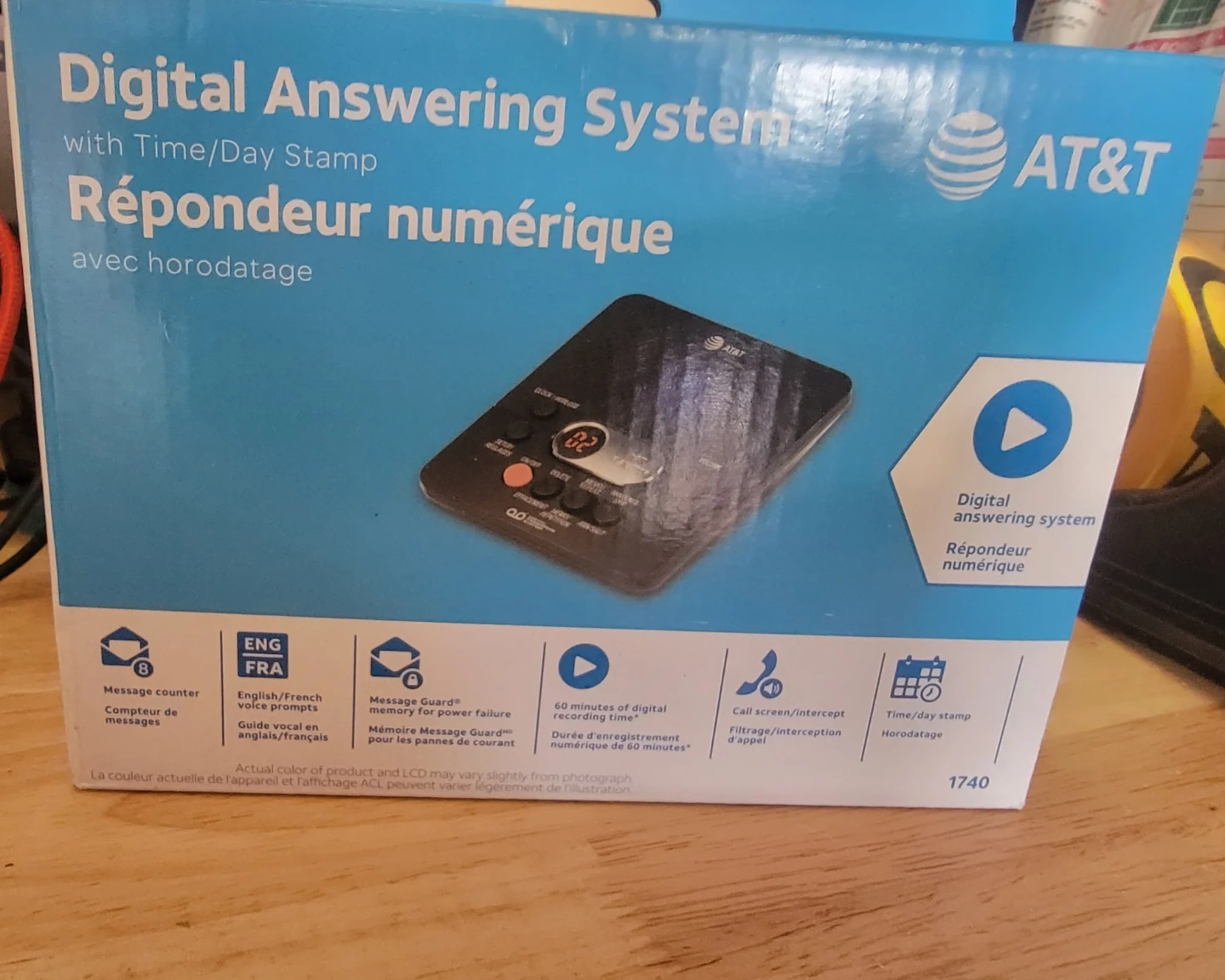 AT&T Digital Answering System with time/day stamp. It offers 60 minutes of digital recording time, message counter, and English/French voice prompts. Call screen/intercept is also included.